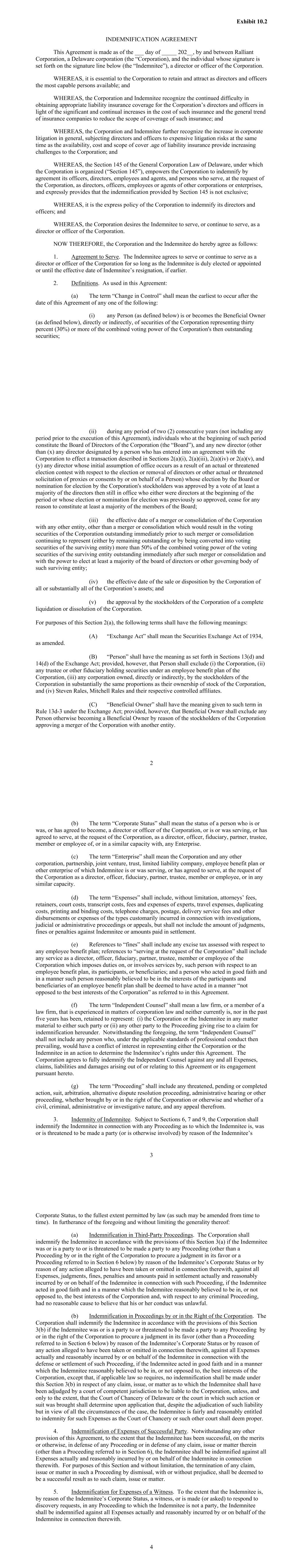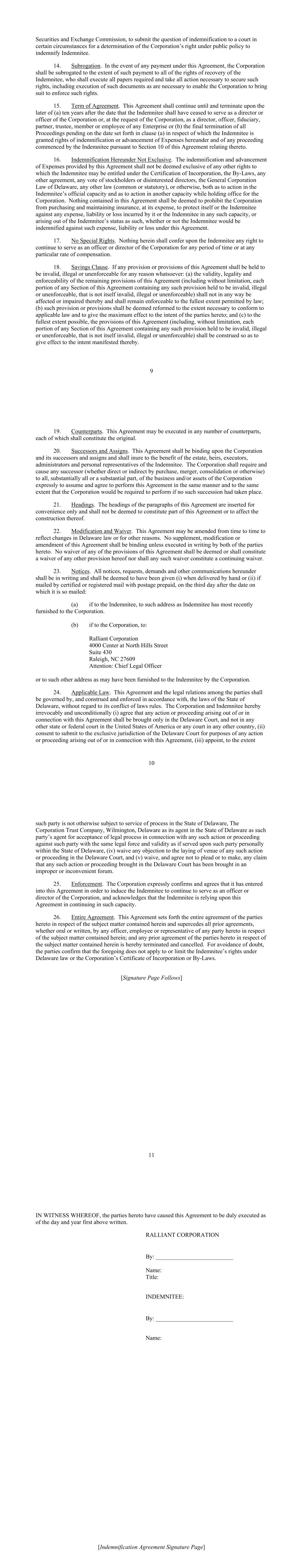 9 Securities and Exchange Commission, to submit the question of indemnification to a court in certain circumstances for a determination of the Corporation’s right under public policy to indemnify Indemnitee. 14. Subrogation. In the event of any payment under this Agreement, the Corporation shall be subrogated to the extent of such payment to all of the rights of recovery of the Indemnitee, who shall execute all papers required and take all action necessary to secure such rights, including execution of such documents as are necessary to enable the Corporation to bring suit to enforce such rights. 15. Term of Agreement. This Agreement shall continue until and terminate upon the later of (a) ten years after the date that the Indemnitee shall have ceased to serve as a director or officer of the Corporation or, at the request of the Corporation, as a director, officer, fiduciary, partner, trustee, member or employee of any Enterprise or (b) the final termination of all Proceedings pending on the date set forth in clause (a) in respect of which the Indemnitee is granted rights of indemnification or advancement of Expenses hereunder and of any proceeding commenced by the Indemnitee pursuant to Section 10 of this Agreement relating thereto. 16. Indemnification Hereunder Not Exclusive. The indemnification and advancement of Expenses provided by this Agreement shall not be deemed exclusive of any other rights to which the Indemnitee may be entitled under the Certification of Incorporation, the By-Laws, any other agreement, any vote of stockholders or disinterested directors, the General Corporation Law of Delaware, any other law (common or statutory), or otherwise, both as to action in the Indemnitee’s official capacity and as to action in another capacity while holding office for the Corporation. Nothing contained in this Agreement shall be deemed to prohibit the Corporation from purchasing and maintaining insurance, at its expense, to protect itself or the Indemnitee against any expense, liability or loss incurred by it or the Indemnitee in any such capacity, or arising out of the Indemnitee’s status as such, whether or not the Indemnitee would be indemnified against such expense, liability or loss under this Agreement. 17. No Special Rights. Nothing herein shall confer upon the Indemnitee any right to continue to serve as an officer or director of the Corporation for any period of time or at any particular rate of compensation. 18. Savings Clause. If any provision or provisions of this Agreement shall be held to be invalid, illegal or unenforceable for any reason whatsoever: (a) the validity, legality and enforceability of the remaining provisions of this Agreement (including without limitation, each portion of any Section of this Agreement containing any such provision held to be invalid, illegal or unenforceable, that is not itself invalid, illegal or unenforceable) shall not in any way be affected or impaired thereby and shall remain enforceable to the fullest extent permitted by law; (b) such provision or provisions shall be deemed reformed to the extent necessary to conform to applicable law and to give the maximum effect to the intent of the parties hereto; and (c) to the fullest extent possible, the provisions of this Agreement (including, without limitation, each portion of any Section of this Agreement containing any such provision held to be invalid, illegal or unenforceable, that is not itself invalid, illegal or unenforceable) shall be construed so as to give effect to the intent manifested thereby. 10 19. Counterparts. This Agreement may be executed in any number of counterparts, each of which shall constitute the original. 20. Successors and Assigns. This Agreement shall be binding upon the Corporation and its successors and assigns and shall inure to the benefit of the estate, heirs, executors, administrators and personal representatives of the Indemnitee. The Corporation shall require and cause any successor (whether direct or indirect by purchase, merger, consolidation or otherwise) to all, substantially all or a substantial part, of the business and/or assets of the Corporation expressly to assume and agree to perform this Agreement in the same manner and to the same extent that the Corporation would be required to perform if no such succession had taken place. 21. Headings. The headings of the paragraphs of this Agreement are inserted for convenience only and shall not be deemed to constitute part of this Agreement or to affect the construction thereof. 22. Modification and Waiver. This Agreement may be amended from time to time to reflect changes in Delaware law or for other reasons. No supplement, modification or amendment of this Agreement shall be binding unless executed in writing by both of the parties hereto. No waiver of any of the provisions of this Agreement shall be deemed or shall constitute a waiver of any other provision hereof nor shall any such waiver constitute a continuing waiver. 23. Notices. All notices, requests, demands and other communications hereunder shall be in writing and shall be deemed to have been given (i) when delivered by hand or (ii) if mailed by certified or registered mail with postage prepaid, on the third day after the date on which it is so mailed: (a) if to the Indemnitee, to such address as Indemnitee has most recently furnished to the Corporation. (b) if to the Corporation, to: Ralliant Corporation 4000 Center at North Hills Street Suite 430 Raleigh, NC 27609 Attention: Chief Legal Officer or to such other address as may have been furnished to the Indemnitee by the Corporation. 24. Applicable Law. This Agreement and the legal relations among the parties shall be governed by, and construed and enforced in accordance with, the laws of the State of Delaware, without regard to its conflict of laws rules. The Corporation and Indemnitee hereby irrevocably and unconditionally (i) agree that any action or proceeding arising out of or i
