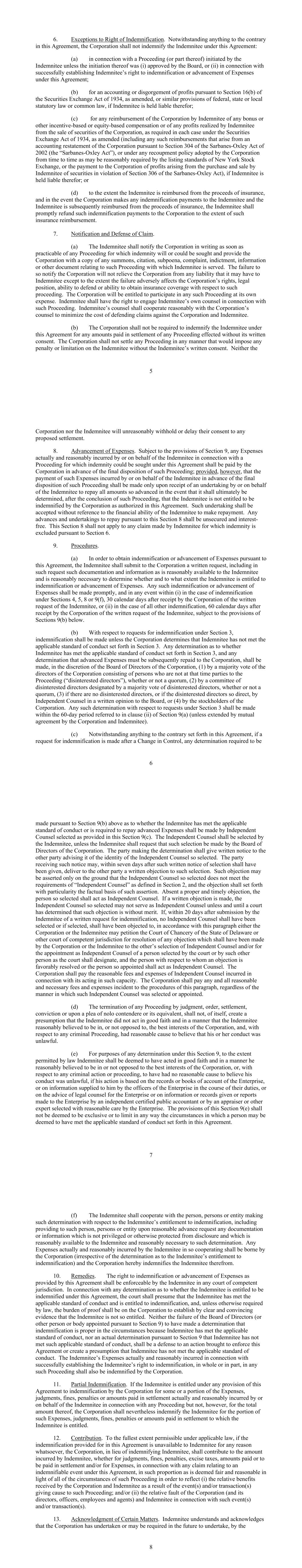 5 6. Exceptions to Right of Indemnification. Notwithstanding anything to the contrary in this Agreement, the Corporation shall not indemnify the Indemnitee under this Agreement: (a) in connection with a Proceeding (or part thereof) initiated by the Indemnitee unless the initiation thereof was (i) approved by the Board, or (ii) in connection with successfully establishing Indemnitee’s right to indemnification or advancement of Expenses under this Agreement; (b) for an accounting or disgorgement of profits pursuant to Section 16(b) of the Securities Exchange Act of 1934, as amended, or similar provisions of federal, state or local statutory law or common law, if Indemnitee is held liable therefor; (c) for any reimbursement of the Corporation by Indemnitee of any bonus or other incentive-based or equity-based compensation or of any profits realized by Indemnitee from the sale of securities of the Corporation, as required in each case under the Securities Exchange Act of 1934, as amended (including any such reimbursements that arise from an accounting restatement of the Corporation pursuant to Section 304 of the Sarbanes-Oxley Act of 2002 (the “Sarbanes-Oxley Act”), or under any recoupment policy adopted by the Corporation from time to time as may be reasonably required by the listing standards of New York Stock Exchange, or the payment to the Corporation of profits arising from the purchase and sale by Indemnitee of securities in violation of Section 306 of the Sarbanes-Oxley Act), if Indemnitee is held liable therefor; or (d) to the extent the Indemnitee is reimbursed from the proceeds of insurance, and in the event the Corporation makes any indemnification payments to the Indemnitee and the Indemnitee is subsequently reimbursed from the proceeds of insurance, the Indemnitee shall promptly refund such indemnification payments to the Corporation to the extent of such insurance reimbursement. 7. Notification and Defense of Claim. (a) The Indemnitee shall notify the Corporation in writing as soon as practicable of any Proceeding for which indemnity will or could be sought and provide the Corporation with a copy of any summons, citation, subpoena, complaint, indictment, information or other document relating to such Proceeding with which Indemnitee is served. The failure to so notify the Corporation will not relieve the Corporation from any liability that it may have to Indemnitee except to the extent the failure adversely affects the Corporation’s rights, legal position, ability to defend or ability to obtain insurance coverage with respect to such proceeding. The Corporation will be entitled to participate in any such Proceeding at its own expense. Indemnitee shall have the right to engage Indemnitee’s own counsel in connection with such Proceeding. Indemnitee’s counsel shall cooperate reasonably with the Corporation’s counsel to minimize the cost of defending claims against the Corporation and Indemnitee. (b) The Corporation shall not be required to indemnify the Indemnitee under this Agreement for any amounts paid in settlement of any Proceeding effected without its written consent. The Corporation shall not settle any Proceeding in any manner that would impose any penalty or limitation on the Indemnitee without the Indemnitee’s written consent. Neither the 6 Corporation nor the Indemnitee will unreasonably withhold or delay their consent to any proposed settlement. 8. Advancement of Expenses. Subject to the provisions of Section 9, any Expenses actually and reasonably incurred by or on behalf of the Indemnitee in connection with a Proceeding for which indemnity could be sought under this Agreement shall be paid by the Corporation in advance of the final disposition of such Proceeding; provided, however, that the payment of such Expenses incurred by or on behalf of the Indemnitee in advance of the final disposition of such Proceeding shall be made only upon receipt of an undertaking by or on behalf of the Indemnitee to repay all amounts so advanced in the event that it shall ultimately be determined, after the conclusion of such Proceeding, that the Indemnitee is not entitled to be indemnified by the Corporation as authorized in this Agreement. Such undertaking shall be accepted without reference to the financial ability of the Indemnitee to make repayment. Any advances and undertakings to repay pursuant to this Section 8 shall be unsecured and interest- free. This Section 8 shall not apply to any claim made by Indemnitee for which indemnity is excluded pursuant to Section 6. 9. Procedures. (a) In order to obtain indemnification or advancement of Expenses pursuant to this Agreement, the Indemnitee shall submit to the Corporation a written request, including in such request such documentation and information as is reasonably available to the Indemnitee and is reasonably necessary to determine whether and to what extent the Indemnitee is entitled to indemnification or advancement of Expenses. Any such indemnification or advancement of Expenses shall be made promptly, and in any event within (i) in the case of indemnification under Sections 4, 5, 8 or 9(f), 30 calendar days after receipt by the Corporation of the written request of the Indemnitee, or (ii) in the case of all other indemnification, 60 calendar days after receipt by the Corporation of the written request of the Indemnitee, subject to the provisions of Sections 9(b) below. (b) With respect to requests for indemnification under Section 3, indemnification shall be made unless the Corporation determines that Indemnitee has not met the applicable standard of conduct set forth in Section 3. Any determination as to whether Indemnitee has met the applicable standard of conduct set forth in Section 3, and any determination that advanced Expenses must be subsequently repaid to the Corporation, shall be made, in the discretion of the Board of Directors of the Corporation, (1) by a majority vote of the directors of the Corpo