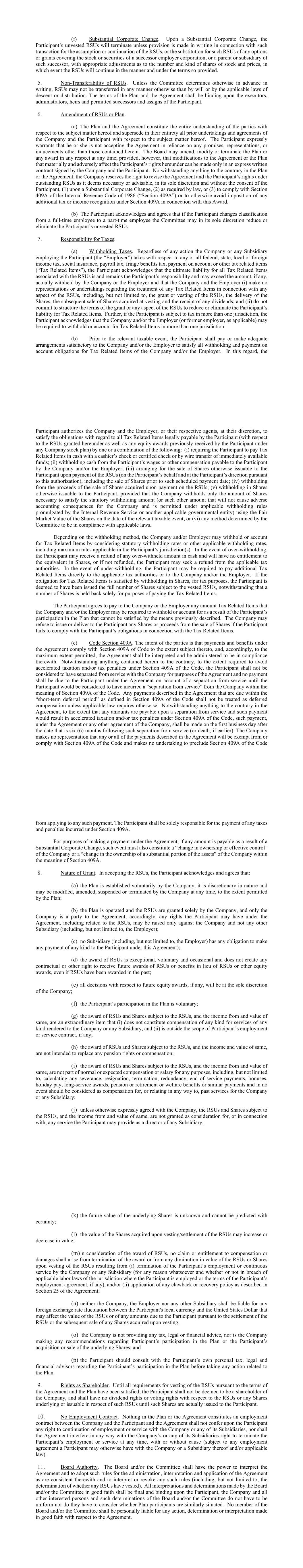 (f) Substantial Corporate Change. Upon a Substantial Corporate Change, the Participant’s unvested RSUs will terminate unless provision is made in writing in connection with such transaction for the assumption or continuation of the RSUs, or the substitution for such RSUs of any options or grants covering the stock or securities of a successor employer corporation, or a parent or subsidiary of such successor, with appropriate adjustments as to the number and kind of shares of stock and prices, in which event the RSUs will continue in the manner and under the terms so provided. 5. Non-Transferability of RSUs. Unless the Committee determines otherwise in advance in writing, RSUs may not be transferred in any manner otherwise than by will or by the applicable laws of descent or distribution. The terms of the Plan and the Agreement shall be binding upon the executors, administrators, heirs and permitted successors and assigns of the Participant. 6. Amendment of RSUs or Plan. (a) The Plan and the Agreement constitute the entire understanding of the parties with respect to the subject matter hereof and supersede in their entirety all prior undertakings and agreements of the Company and the Participant with respect to the subject matter hereof. The Participant expressly warrants that he or she is not accepting the Agreement in reliance on any promises, representations, or inducements other than those contained herein. The Board may amend, modify or terminate the Plan or any award in any respect at any time; provided, however, that modifications to the Agreement or the Plan that materially and adversely affect the Participant’s rights hereunder can be made only in an express written contract signed by the Company and the Participant. Notwithstanding anything to the contrary in the Plan or the Agreement, the Company reserves the right to revise the Agreement and the Participant’s rights under outstanding RSUs as it deems necessary or advisable, in its sole discretion and without the consent of the Participant, (1) upon a Substantial Corporate Change, (2) as required by law, or (3) to comply with Section 409A of the Internal Revenue Code of 1986 (“Section 409A”) or to otherwise avoid imposition of any additional tax or income recognition under Section 409A in connection with this Award. (b) The Participant acknowledges and agrees that if the Participant changes classification from a full-time employee to a part-time employee the Committee may in its sole discretion reduce or eliminate the Participant’s unvested RSUs. 7. Responsibility for Taxes. (a) Withholding Taxes. Regardless of any action the Company or any Subsidiary employing the Participant (the “Employer”) takes with respect to any or all federal, state, local or foreign income tax, social insurance, payroll tax, fringe benefits tax, payment on account or other tax related items (“Tax Related Items”), the Participant acknowledges that the ultimate liability for all Tax Related Items associated with the RSUs is and remains the Participant’s responsibility and may exceed the amount, if any, actually withheld by the Company or the Employer and that the Company and the Employer (i) make no representations or undertakings regarding the treatment of any Tax Related Items in connection with any aspect of the RSUs, including, but not limited to, the grant or vesting of the RSUs, the delivery of the Shares, the subsequent sale of Shares acquired at vesting and the receipt of any dividends; and (ii) do not commit to structure the terms of the grant or any aspect of the RSUs to reduce or eliminate the Participant’s liability for Tax Related Items. Further, if the Participant is subject to tax in more than one jurisdiction, the Participant acknowledges that the Company and/or the Employer (or former employer, as applicable) may be required to withhold or account for Tax Related Items in more than one jurisdiction. (b) Prior to the relevant taxable event, the Participant shall pay or make adequate arrangements satisfactory to the Company and/or the Employer to satisfy all withholding and payment on account obligations for Tax Related Items of the Company and/or the Employer. In this regard, the Participant authorizes the Company and the Employer, or their respective agents, at their discretion, to satisfy the obligations with regard to all Tax Related Items legally payable by the Participant (with respect to the RSUs granted hereunder as well as any equity awards previously received by the Participant under any Company stock plan) by one or a combination of the following: (i) requiring the Participant to pay Tax Related Items in cash with a cashier’s check or certified check or by wire transfer of immediately available funds; (ii) withholding cash from the Participant’s wages or other compensation payable to the Participant by the Company and/or the Employer; (iii) arranging for the sale of Shares otherwise issuable to the Participant upon payment of the RSUs (on the Participant’s behalf and at the Participant’s direction pursuant to this authorization), including the sale of Shares prior to such scheduled payment date; (iv) withholding from the proceeds of the sale of Shares acquired upon payment on the RSUs; (v) withholding in Shares otherwise issuable to the Participant, provided that the Company withholds only the amount of Shares necessary to satisfy the statutory withholding amount (or such other amount that will not cause adverse accounting consequences for the Company and is permitted under applicable withholding rules promulgated by the Internal Revenue Service or another applicable governmental entity) using the Fair Market Value of the Shares on the date of the relevant taxable event; or (vi) any method determined by the Committee to be in compliance with applicable laws. Depending on the withholding method, the Company and/or Employer may withhold or account for Tax Related Items by considering statutory withh