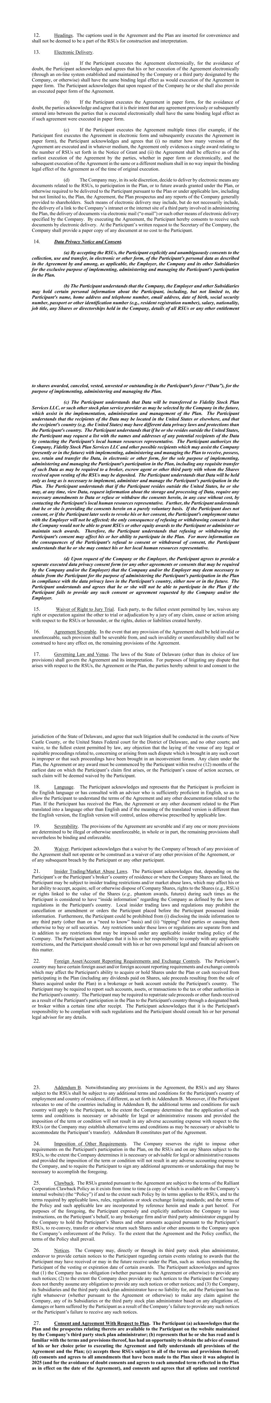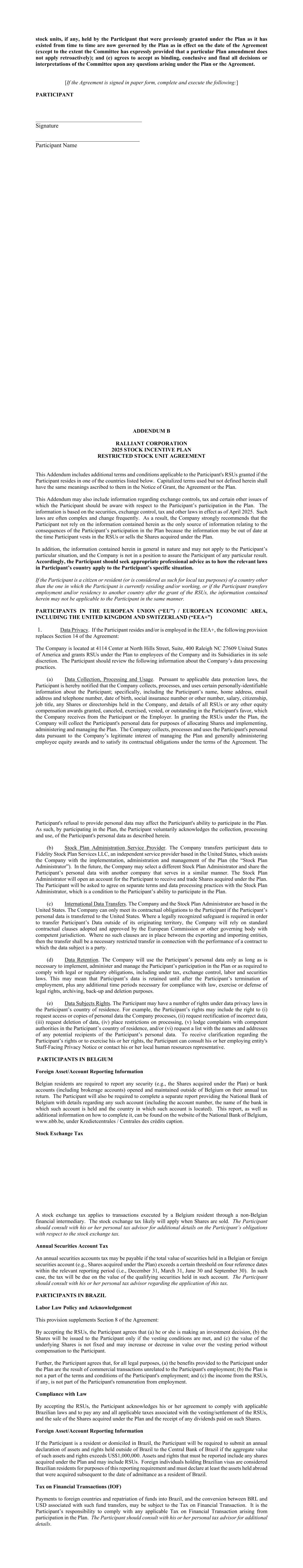 stock units, if any, held by the Participant that were previously granted under the Plan as it has existed from time to time are now governed by the Plan as in effect on the date of the Agreement (except to the extent the Committee has expressly provided that a particular Plan amendment does not apply retroactively); and (e) agrees to accept as binding, conclusive and final all decisions or interpretations of the Committee upon any questions arising under the Plan or the Agreement. [If the Agreement is signed in paper form, complete and execute the following:] PARTICIPANT _______________________________________ Signature ___________________________________ Participant Name ADDENDUM B RALLIANT CORPORATION 2025 STOCK INCENTIVE PLAN RESTRICTED STOCK UNIT AGREEMENT This Addendum includes additional terms and conditions applicable to the Participant's RSUs granted if the Participant resides in one of the countries listed below. Capitalized terms used but not defined herein shall have the same meanings ascribed to them in the Notice of Grant, the Agreement or the Plan. This Addendum may also include information regarding exchange controls, tax and certain other issues of which the Participant should be aware with respect to the Participant’s participation in the Plan. The information is based on the securities, exchange control, tax and other laws in effect as of April 2025. Such laws are often complex and change frequently. As a result, the Company strongly recommends that the Participant not rely on the information contained herein as the only source of information relating to the consequences of the Participant’s participation in the Plan because the information may be out of date at the time Participant vests in the RSUs or sells the Shares acquired under the Plan. In addition, the information contained herein in general in nature and may not apply to the Participant’s particular situation, and the Company is not in a position to assure the Participant of any particular result. Accordingly, the Participant should seek appropriate professional advice as to how the relevant laws in Participant’s country apply to the Participant’s specific situation. If the Participant is a citizen or resident (or is considered as such for local tax purposes) of a country other than the one in which the Participant is currently residing and/or working, or if the Participant transfers employment and/or residency to another country after the grant of the RSUs, the information contained herein may not be applicable to the Participant in the same manner. PARTICIPANTS IN THE EUROPEAN UNION (“EU”) / EUROPEAN ECONOMIC AREA, INCLUDING THE UNITED KINGDOM AND SWITZERLAND (“EEA+”) 1. Data Privacy. If the Participant resides and/or is employed in the EEA+, the following provision replaces Section 14 of the Agreement: The Company is located at 4114 Center at North Hills Street, Suite, 400 Raleigh NC 27609 United States of America and grants RSUs under the Plan to employees of the Company and its Subsidiaries in its sole discretion. The Participant should review the following information about the Company’s data processing practices. (a) Data Collection, Processing and Usage. Pursuant to applicable data protection laws, the Participant is hereby notified that the Company collects, processes, and uses certain personally-identifiable information about the Participant; specifically, including the Participant’s name, home address, email address and telephone number, date of birth, social insurance number or other number, salary, citizenship, job title, any Shares or directorships held in the Company, and details of all RSUs or any other equity compensation awards granted, canceled, exercised, vested, or outstanding in the Participant's favor, which the Company receives from the Participant or the Employer. In granting the RSUs under the Plan, the Company will collect the Participant's personal data for purposes of allocating Shares and implementing, administering and managing the Plan. The Company collects, processes and uses the Participant's personal data pursuant to the Company’s legitimate interest of managing the Plan and generally administering employee equity awards and to satisfy its contractual obligations under the terms of the Agreement. The Participant's refusal to provide personal data may affect the Participant's ability to participate in the Plan. As such, by participating in the Plan, the Participant voluntarily acknowledges the collection, processing and use, of the Participant's personal data as described herein. (b) Stock Plan Administration Service Provider. The Company transfers participant data to Fidelity Stock Plan Services LLC, an independent service provider based in the United States, which assists the Company with the implementation, administration and management of the Plan (the “Stock Plan Administrator”). In the future, the Company may select a different Stock Plan Administrator and share the Participant’s personal data with another company that serves in a similar manner. The Stock Plan Administrator will open an account for the Participant to receive and trade Shares acquired under the Plan. The Participant will be asked to agree on separate terms and data processing practices with the Stock Plan Administrator, which is a condition to the Participant’s ability to participate in the Plan. (c) International Data Transfers. The Company and the Stock Plan Administrator are based in the United States. The Company can only meet its contractual obligations to the Participant if the Participant’s personal data is transferred to the United States. Where a legally recognized safeguard is required in order to transfer Participant’s Data outside of its originating territory, the Company will rely on standard contractual clauses adopted and approved by the European Commission or other governing body with competent jurisdiction. Where no such clauses are in place between t