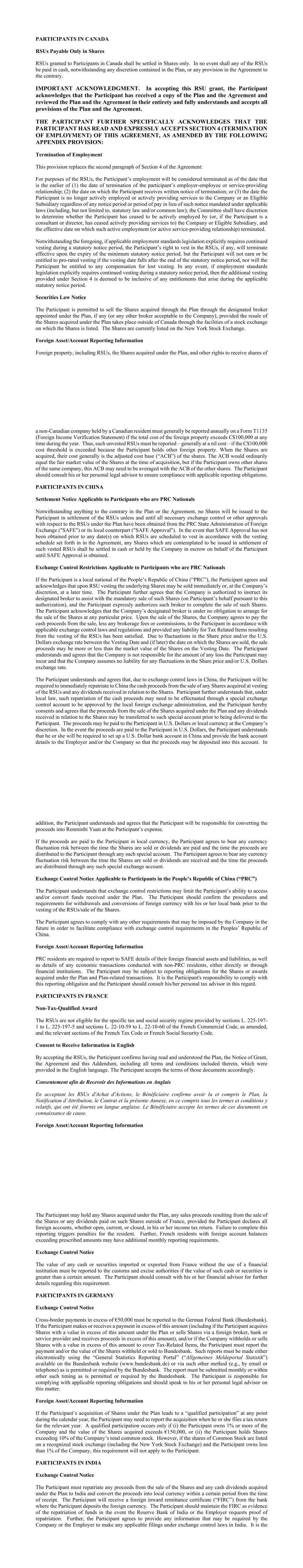 PARTICIPANTS IN CANADA RSUs Payable Only in Shares RSUs granted to Participants in Canada shall be settled in Shares only. In no event shall any of the RSUs be paid in cash, notwithstanding any discretion contained in the Plan, or any provision in the Agreement to the contrary. IMPORTANT ACKNOWLEDGMENT. In accepting this RSU grant, the Participant acknowledges that the Participant has received a copy of the Plan and the Agreement and reviewed the Plan and the Agreement in their entirety and fully understands and accepts all provisions of the Plan and the Agreement. THE PARTICIPANT FURTHER SPECIFICALLY ACKNOWLEDGES THAT THE PARTICIPANT HAS READ AND EXPRESSLY ACCEPTS SECTION 4 (TERMINATION OF EMPLOYMENT) OF THIS AGREEMENT, AS AMENDED BY THE FOLLOWING APPENDIX PROVISION: Termination of Employment This provision replaces the second paragraph of Section 4 of the Agreement: For purposes of the RSUs, the Participant’s employment will be considered terminated as of the date that is the earlier of (1) the date of termination of the participant’s employer-employee or service-providing relationship; (2) the date on which the Participant receives written notice of termination; or (3) the date the Participant is no longer actively employed or actively providing services to the Company or an Eligible Subsidiary regardless of any notice period or period of pay in lieu of such notice mandated under applicable laws (including, but not limited to, statutory law and/or common law); the Committee shall have discretion to determine whether the Participant has ceased to be actively employed by (or, if the Participant is a consultant or director, has ceased actively providing services to) the Company or Eligible Subsidiary, and the effective date on which such active employment (or active service-providing relationship) terminated. Notwithstanding the foregoing, if applicable employment standards legislation explicitly requires continued vesting during a statutory notice period, the Participant’s right to vest in the RSUs, if any, will terminate effective upon the expiry of the minimum statutory notice period, but the Participant will not earn or be entitled to pro-rated vesting if the vesting date falls after the end of the statutory notice period, nor will the Participant be entitled to any compensation for lost vesting. In any event, if employment standards legislation explicitly requires continued vesting during a statutory notice period, then the additional vesting provided under Section 4 is deemed to be inclusive of any entitlements that arise during the applicable statutory notice period. Securities Law Notice The Participant is permitted to sell the Shares acquired through the Plan through the designated broker appointed under the Plan, if any (or any other broker acceptable to the Company), provided the resale of the Shares acquired under the Plan takes place outside of Canada through the facilities of a stock exchange on which the Shares is listed. The Shares are currently listed on the New York Stock Exchange. Foreign Asset/Account Reporting Information Foreign property, including RSUs, the Shares acquired under the Plan, and other rights to receive shares of a non-Canadian company held by a Canadian resident must generally be reported annually on a Form T1135 (Foreign Income Verification Statement) if the total cost of the foreign property exceeds C$100,000 at any time during the year. Thus, such unvested RSUs must be reported – generally at a nil cost – if the C$100,000 cost threshold is exceeded because the Participant holds other foreign property. When the Shares are acquired, their cost generally is the adjusted cost base (“ACB”) of the shares. The ACB would ordinarily equal the fair market value of the Shares at the time of acquisition, but if the Participant owns other shares of the same company, this ACB may need to be averaged with the ACB of the other shares. The Participant should consult his or her personal legal advisor to ensure compliance with applicable reporting obligations. PARTICIPANTS IN CHINA Settlement Notice Applicable to Participants who are PRC Nationals Notwithstanding anything to the contrary in the Plan or the Agreement, no Shares will be issued to the Participant in settlement of the RSUs unless and until all necessary exchange control or other approvals with respect to the RSUs under the Plan have been obtained from the PRC State Administration of Foreign Exchange ("SAFE") or its local counterpart ("SAFE Approval"). In the event that SAFE Approval has not been obtained prior to any date(s) on which RSUs are scheduled to vest in accordance with the vesting schedule set forth in in the Agreement, any Shares which are contemplated to be issued in settlement of such vested RSUs shall be settled in cash or held by the Company in escrow on behalf of the Participant until SAFE Approval is obtained. Exchange Control Restrictions Applicable to Participants who are PRC Nationals If the Participant is a local national of the People’s Republic of China (“PRC”), the Participant agrees and acknowledges that upon RSU vesting the underlying Shares may be sold immediately or, at the Company’s discretion, at a later time. The Participant further agrees that the Company is authorized to instruct its designated broker to assist with the mandatory sale of such Shares (on Participant’s behalf pursuant to this authorization), and the Participant expressly authorizes such broker to complete the sale of such Shares. The Participant acknowledges that the Company’s designated broker is under no obligation to arrange for the sale of the Shares at any particular price. Upon the sale of the Shares, the Company agrees to pay the cash proceeds from the sale, less any brokerage fees or commissions, to the Participant in accordance with applicable exchange control laws and regulations and provided any liability for Tax Related Items resulting from the vesting of the RSUs has b