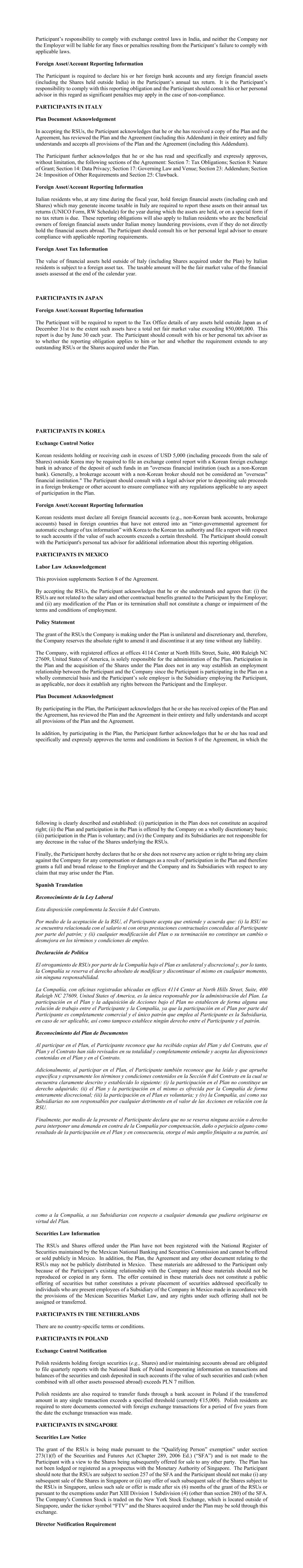 Participant’s responsibility to comply with exchange control laws in India, and neither the Company nor the Employer will be liable for any fines or penalties resulting from the Participant’s failure to comply with applicable laws. Foreign Asset/Account Reporting Information The Participant is required to declare his or her foreign bank accounts and any foreign financial assets (including the Shares held outside India) in the Participant’s annual tax return. It is the Participant’s responsibility to comply with this reporting obligation and the Participant should consult his or her personal advisor in this regard as significant penalties may apply in the case of non-compliance. PARTICIPANTS IN ITALY Plan Document Acknowledgement In accepting the RSUs, the Participant acknowledges that he or she has received a copy of the Plan and the Agreement, has reviewed the Plan and the Agreement (including this Addendum) in their entirety and fully understands and accepts all provisions of the Plan and the Agreement (including this Addendum). The Participant further acknowledges that he or she has read and specifically and expressly approves, without limitation, the following sections of the Agreement: Section 7: Tax Obligations; Section 8: Nature of Grant; Section 14: Data Privacy; Section 17: Governing Law and Venue; Section 23: Addendum; Section 24: Imposition of Other Requirements and Section 25: Clawback. Foreign Asset/Account Reporting Information Italian residents who, at any time during the fiscal year, hold foreign financial assets (including cash and Shares) which may generate income taxable in Italy are required to report these assets on their annual tax returns (UNICO Form, RW Schedule) for the year during which the assets are held, or on a special form if no tax return is due. These reporting obligations will also apply to Italian residents who are the beneficial owners of foreign financial assets under Italian money laundering provisions, even if they do not directly hold the financial assets abroad. The Participant should consult his or her personal legal advisor to ensure compliance with applicable reporting requirements. Foreign Asset Tax Information The value of financial assets held outside of Italy (including Shares acquired under the Plan) by Italian residents is subject to a foreign asset tax. The taxable amount will be the fair market value of the financial assets assessed at the end of the calendar year. PARTICIPANTS IN JAPAN Foreign Asset/Account Reporting Information The Participant will be required to report to the Tax Office details of any assets held outside Japan as of December 31st to the extent such assets have a total net fair market value exceeding ¥50,000,000. This report is due by June 30 each year. The Participant should consult with his or her personal tax advisor as to whether the reporting obligation applies to him or her and whether the requirement extends to any outstanding RSUs or the Shares acquired under the Plan. PARTICIPANTS IN KOREA Exchange Control Notice Korean residents holding or receiving cash in excess of USD 5,000 (including proceeds from the sale of Shares) outside Korea may be required to file an exchange control report with a Korean foreign exchange bank in advance of the deposit of such funds in an "overseas financial institution (such as a non-Korean bank). Generally, a brokerage account with a non-Korean broker should not be considered an "overseas" financial institution." The Participant should consult with a legal advisor prior to depositing sale proceeds in a foreign brokerage or other account to ensure compliance with any regulations applicable to any aspect of participation in the Plan. Foreign Asset/Account Reporting Information Korean residents must declare all foreign financial accounts (e.g., non-Korean bank accounts, brokerage accounts) based in foreign countries that have not entered into an “inter-governmental agreement for automatic exchange of tax information” with Korea to the Korean tax authority and file a report with respect to such accounts if the value of such accounts exceeds a certain threshold. The Participant should consult with the Participant's personal tax advisor for additional information about this reporting obligation. PARTICIPANTS IN MEXICO Labor Law Acknowledgement This provision supplements Section 8 of the Agreement. By accepting the RSUs, the Participant acknowledges that he or she understands and agrees that: (i) the RSUs are not related to the salary and other contractual benefits granted to the Participant by the Employer; and (ii) any modification of the Plan or its termination shall not constitute a change or impairment of the terms and conditions of employment. Policy Statement The grant of the RSUs the Company is making under the Plan is unilateral and discretionary and, therefore, the Company reserves the absolute right to amend it and discontinue it at any time without any liability. The Company, with registered offices at offices 4114 Center at North Hills Street, Suite, 400 Raleigh NC 27609, United States of America, is solely responsible for the administration of the Plan. Participation in the Plan and the acquisition of the Shares under the Plan does not in any way establish an employment relationship between the Participant and the Company since the Participant is participating in the Plan on a wholly commercial basis and the Participant’s sole employer is the Subsidiary employing the Participant, as applicable, nor does it establish any rights between the Participant and the Employer. Plan Document Acknowledgment By participating in the Plan, the Participant acknowledges that he or she has received copies of the Plan and the Agreement, has reviewed the Plan and the Agreement in their entirety and fully understands and accept all provisions of the Plan and the Agreement. In addition, by participating in the Plan, the Participant further acknowledges that he or she has read an