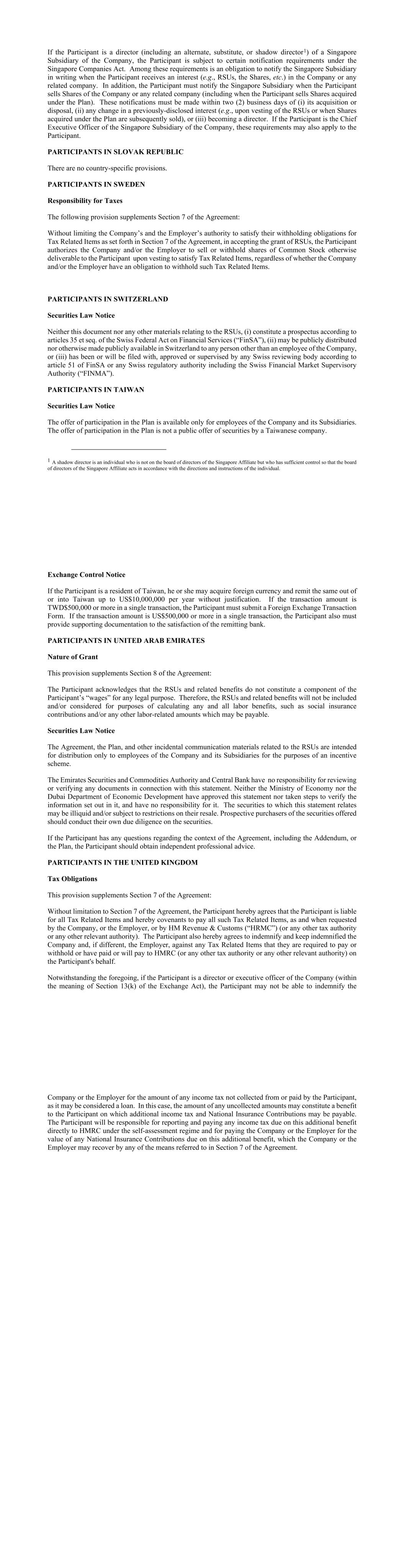 If the Participant is a director (including an alternate, substitute, or shadow director1) of a Singapore Subsidiary of the Company, the Participant is subject to certain notification requirements under the Singapore Companies Act. Among these requirements is an obligation to notify the Singapore Subsidiary in writing when the Participant receives an interest (e.g., RSUs, the Shares, etc.) in the Company or any related company. In addition, the Participant must notify the Singapore Subsidiary when the Participant sells Shares of the Company or any related company (including when the Participant sells Shares acquired under the Plan). These notifications must be made within two (2) business days of (i) its acquisition or disposal, (ii) any change in a previously-disclosed interest (e.g., upon vesting of the RSUs or when Shares acquired under the Plan are subsequently sold), or (iii) becoming a director. If the Participant is the Chief Executive Officer of the Singapore Subsidiary of the Company, these requirements may also apply to the Participant. PARTICIPANTS IN SLOVAK REPUBLIC There are no country-specific provisions. PARTICIPANTS IN SWEDEN Responsibility for Taxes The following provision supplements Section 7 of the Agreement: Without limiting the Company’s and the Employer’s authority to satisfy their withholding obligations for Tax Related Items as set forth in Section 7 of the Agreement, in accepting the grant of RSUs, the Participant authorizes the Company and/or the Employer to sell or withhold shares of Common Stock otherwise deliverable to the Participant upon vesting to satisfy Tax Related Items, regardless of whether the Company and/or the Employer have an obligation to withhold such Tax Related Items. PARTICIPANTS IN SWITZERLAND Securities Law Notice Neither this document nor any other materials relating to the RSUs, (i) constitute a prospectus according to articles 35 et seq. of the Swiss Federal Act on Financial Services (“FinSA”), (ii) may be publicly distributed nor otherwise made publicly available in Switzerland to any person other than an employee of the Company, or (iii) has been or will be filed with, approved or supervised by any Swiss reviewing body according to article 51 of FinSA or any Swiss regulatory authority including the Swiss Financial Market Supervisory Authority (“FINMA”). PARTICIPANTS IN TAIWAN Securities Law Notice The offer of participation in the Plan is available only for employees of the Company and its Subsidiaries. The offer of participation in the Plan is not a public offer of securities by a Taiwanese company. 1 A shadow director is an individual who is not on the board of directors of the Singapore Affiliate but who has sufficient control so that the board of directors of the Singapore Affiliate acts in accordance with the directions and instructions of the individual. Exchange Control Notice If the Participant is a resident of Taiwan, he or she may acquire foreign currency and remit the same out of or into Taiwan up to US$10,000,000 per year without justification. If the transaction amount is TWD$500,000 or more in a single transaction, the Participant must submit a Foreign Exchange Transaction Form. If the transaction amount is US$500,000 or more in a single transaction, the Participant also must provide supporting documentation to the satisfaction of the remitting bank. PARTICIPANTS IN UNITED ARAB EMIRATES Nature of Grant This provision supplements Section 8 of the Agreement: The Participant acknowledges that the RSUs and related benefits do not constitute a component of the Participant’s “wages” for any legal purpose. Therefore, the RSUs and related benefits will not be included and/or considered for purposes of calculating any and all labor benefits, such as social insurance contributions and/or any other labor-related amounts which may be payable. Securities Law Notice The Agreement, the Plan, and other incidental communication materials related to the RSUs are intended for distribution only to employees of the Company and its Subsidiaries for the purposes of an incentive scheme. The Emirates Securities and Commodities Authority and Central Bank have no responsibility for reviewing or verifying any documents in connection with this statement. Neither the Ministry of Economy nor the Dubai Department of Economic Development have approved this statement nor taken steps to verify the information set out in it, and have no responsibility for it. The securities to which this statement relates may be illiquid and/or subject to restrictions on their resale. Prospective purchasers of the securities offered should conduct their own due diligence on the securities. If the Participant has any questions regarding the context of the Agreement, including the Addendum, or the Plan, the Participant should obtain independent professional advice. PARTICIPANTS IN THE UNITED KINGDOM Tax Obligations This provision supplements Section 7 of the Agreement: Without limitation to Section 7 of the Agreement, the Participant hereby agrees that the Participant is liable for all Tax Related Items and hereby covenants to pay all such Tax Related Items, as and when requested by the Company, or the Employer, or by HM Revenue & Customs (“HRMC”) (or any other tax authority or any other relevant authority). The Participant also hereby agrees to indemnify and keep indemnified the Company and, if different, the Employer, against any Tax Related Items that they are required to pay or withhold or have paid or will pay to HMRC (or any other tax authority or any other relevant authority) on the Participant's behalf. Notwithstanding the foregoing, if the Participant is a director or executive officer of the Company (within the meaning of Section 13(k) of the Exchange Act), the Participant may not be able to indemnify the Company or the Employer for the amount of any income tax not collected from or paid by the Participant, as it may be considered a loan. In t