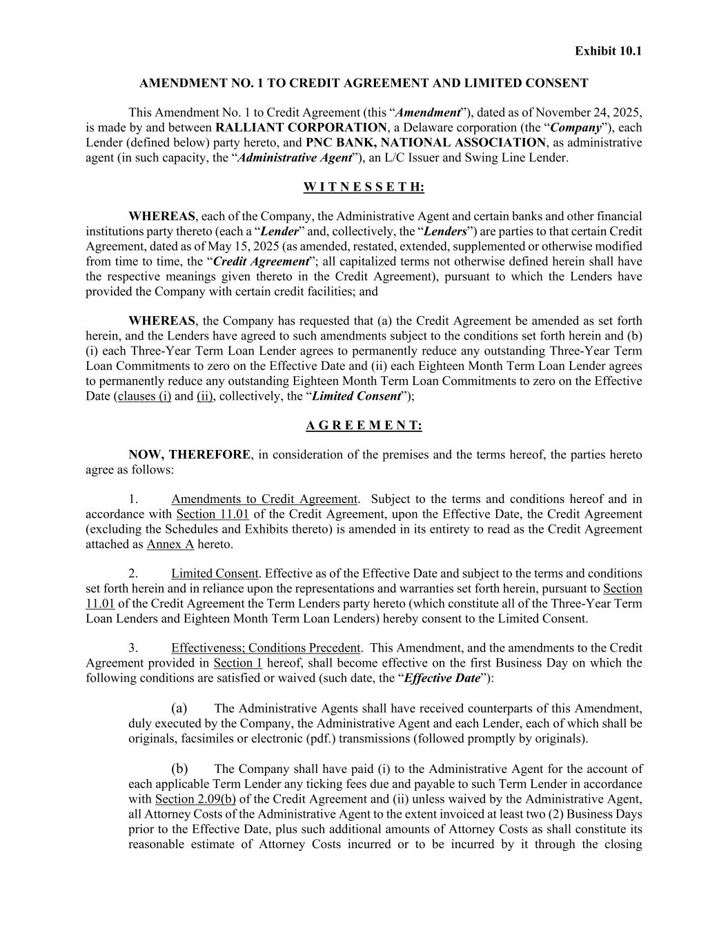 Exhibit 10.1 AMENDMENT NO. 1 TO CREDIT AGREEMENT AND LIMITED CONSENT This Amendment No. 1 to Credit Agreement (this “Amendment”), dated as of November 24, 2025, is made by and between RALLIANT CORPORATION, a Delaware corporation (the “Company”), each Lender (defined below) party hereto, and PNC BANK, NATIONAL ASSOCIATION, as administrative agent (in such capacity, the “Administrative Agent”), an L/C Issuer and Swing Line Lender. W I T N E S S E T H: WHEREAS, each of the Company, the Administrative Agent and certain banks and other financial institutions party thereto (each a “Lender” and, collectively, the “Lenders”) are parties to that certain Credit Agreement, dated as of May 15, 2025 (as amended, restated, extended, supplemented or otherwise modified from time to time, the “Credit Agreement”; all capitalized terms not otherwise defined herein shall have the respective meanings given thereto in the Credit Agreement), pursuant to which the Lenders have provided the Company with certain credit facilities; and WHEREAS, the Company has requested that (a) the Credit Agreement be amended as set forth herein, and the Lenders have agreed to such amendments subject to the conditions set forth herein and (b) (i) each Three-Year Term Loan Lender agrees to permanently reduce any outstanding Three-Year Term Loan Commitments to zero on the Effective Date and (ii) each Eighteen Month Term Loan Lender agrees to permanently reduce any outstanding Eighteen Month Term Loan Commitments to zero on the Effective Date (clauses (i) and (ii), collectively, the “Limited Consent”); A G R E E M E N T: NOW, THEREFORE, in consideration of the premises and the terms hereof, the parties hereto agree as follows: 1. Amendments to Credit Agreement. Subject to the terms and conditions hereof and in accordance with Section 11.01 of the Credit Agreement, upon the Effective Date, the Credit Agreement (excluding the Schedules and Exhibits thereto) is amended in its entirety to read as the Credit Agreement attached as Annex A hereto. 2. Limited Consent. Effective as of the Effective Date and subject to the terms and conditions set forth herein and in reliance upon the representations and warranties set forth herein, pursuant to Section 11.01 of the Credit Agreement the Term Lenders party hereto (which constitute all of the Three-Year Term Loan Lenders and Eighteen Month Term Loan Lenders) hereby consent to the Limited Consent. 3. Effectiveness; Conditions Precedent. This Amendment, and the amendments to the Credit Agreement provided in Section 1 hereof, shall become effective on the first Business Day on which the following conditions are satisfied or waived (such date, the “Effective Date”): (a) The Administrative Agents shall have received counterparts of this Amendment, duly executed by the Company, the Administrative Agent and each Lender, each of which shall be originals, facsimiles or electronic (pdf.) transmissions (followed promptly by originals). (b) The Company shall have paid (i) to the Administrative Agent for the account of each applicable Term Lender any ticking fees due and payable to such Term Lender in accordance with Section 2.09(b) of the Credit Agreement and (ii) unless waived by the Administrative Agent, all Attorney Costs of the Administrative Agent to the extent invoiced at least two (2) Business Days prior to the Effective Date, plus such additional amounts of Attorney Costs as shall constitute its reasonable estimate of Attorney Costs incurred or to be incurred by it through the closing