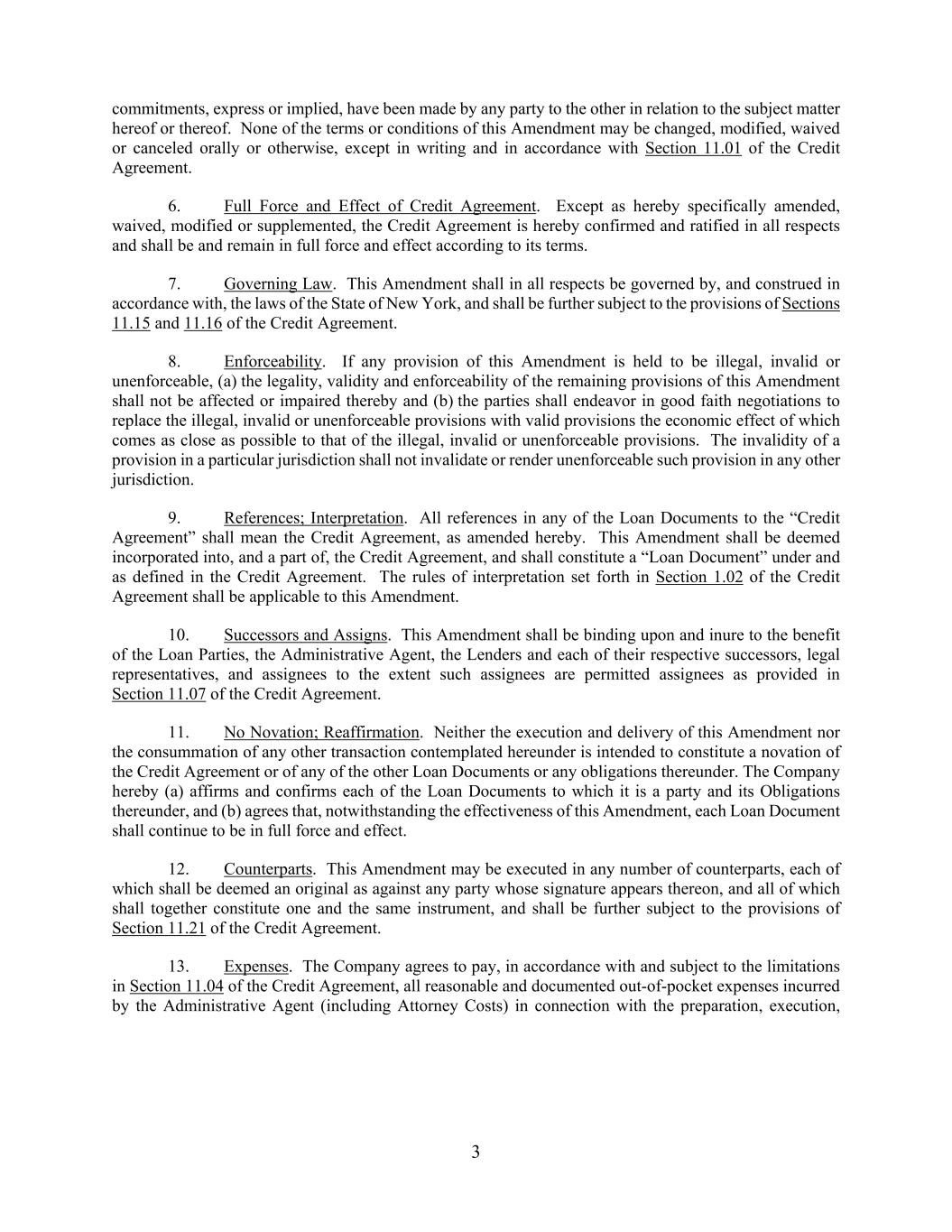 3 commitments, express or implied, have been made by any party to the other in relation to the subject matter hereof or thereof. None of the terms or conditions of this Amendment may be changed, modified, waived or canceled orally or otherwise, except in writing and in accordance with Section 11.01 of the Credit Agreement. 6. Full Force and Effect of Credit Agreement. Except as hereby specifically amended, waived, modified or supplemented, the Credit Agreement is hereby confirmed and ratified in all respects and shall be and remain in full force and effect according to its terms. 7. Governing Law. This Amendment shall in all respects be governed by, and construed in accordance with, the laws of the State of New York, and shall be further subject to the provisions of Sections 11.15 and 11.16 of the Credit Agreement. 8. Enforceability. If any provision of this Amendment is held to be illegal, invalid or unenforceable, (a) the legality, validity and enforceability of the remaining provisions of this Amendment shall not be affected or impaired thereby and (b) the parties shall endeavor in good faith negotiations to replace the illegal, invalid or unenforceable provisions with valid provisions the economic effect of which comes as close as possible to that of the illegal, invalid or unenforceable provisions. The invalidity of a provision in a particular jurisdiction shall not invalidate or render unenforceable such provision in any other jurisdiction. 9. References; Interpretation. All references in any of the Loan Documents to the “Credit Agreement” shall mean the Credit Agreement, as amended hereby. This Amendment shall be deemed incorporated into, and a part of, the Credit Agreement, and shall constitute a “Loan Document” under and as defined in the Credit Agreement. The rules of interpretation set forth in Section 1.02 of the Credit Agreement shall be applicable to this Amendment. 10. Successors and Assigns. This Amendment shall be binding upon and inure to the benefit of the Loan Parties, the Administrative Agent, the Lenders and each of their respective successors, legal representatives, and assignees to the extent such assignees are permitted assignees as provided in Section 11.07 of the Credit Agreement. 11. No Novation; Reaffirmation. Neither the execution and delivery of this Amendment nor the consummation of any other transaction contemplated hereunder is intended to constitute a novation of the Credit Agreement or of any of the other Loan Documents or any obligations thereunder. The Company hereby (a) affirms and confirms each of the Loan Documents to which it is a party and its Obligations thereunder, and (b) agrees that, notwithstanding the effectiveness of this Amendment, each Loan Document shall continue to be in full force and effect. 12. Counterparts. This Amendment may be executed in any number of counterparts, each of which shall be deemed an original as against any party whose signature appears thereon, and all of which shall together constitute one and the same instrument, and shall be further subject to the provisions of Section 11.21 of the Credit Agreement. 13. Expenses. The Company agrees to pay, in accordance with and subject to the limitations in Section 11.04 of the Credit Agreement, all reasonable and documented out-of-pocket expenses incurred by the Administrative Agent (including Attorney Costs) in connection with the preparation, execution,