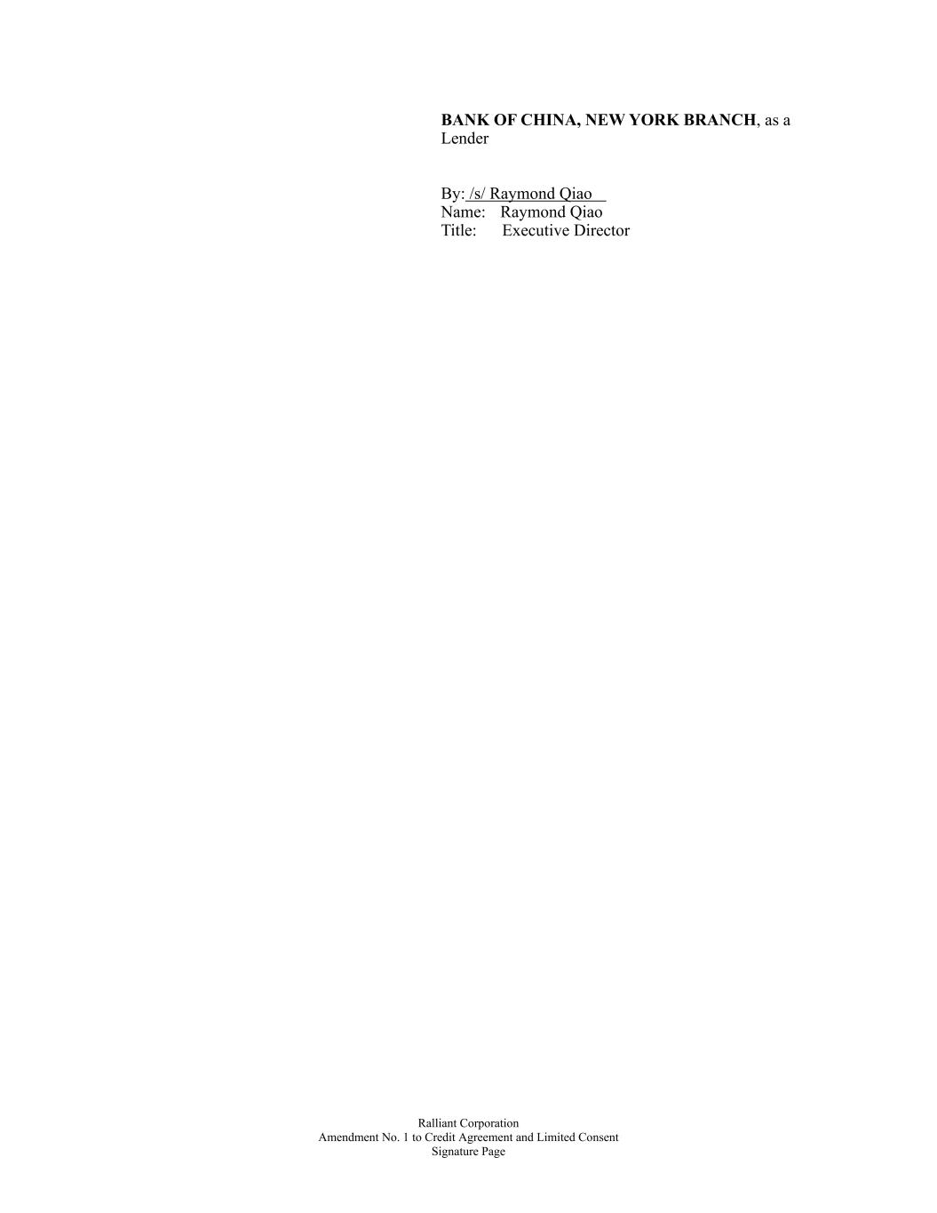 Ralliant Corporation Amendment No. 1 to Credit Agreement and Limited Consent Signature Page BANK OF CHINA, NEW YORK BRANCH, as a Lender By: /s/ Raymond Qiao Name: Raymond Qiao Title: Executive Director