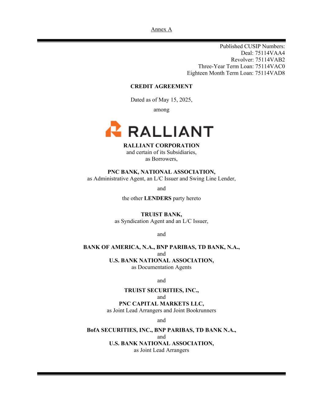 Annex A Published CUSIP Numbers: Deal: 75114VAA4 Revolver: 75114VAB2 Three-Year Term Loan: 75114VAC0 Eighteen Month Term Loan: 75114VAD8 CREDIT AGREEMENT Dated as of May 15, 2025, among RALLIANT CORPORATION and certain of its Subsidiaries, as Borrowers, PNC BANK, NATIONAL ASSOCIATION, as Administrative Agent, an L/C Issuer and Swing Line Lender, and the other LENDERS party hereto TRUIST BANK, as Syndication Agent and an L/C Issuer, and BANK OF AMERICA, N.A., BNP PARIBAS, TD BANK, N.A., and U.S. BANK NATIONAL ASSOCIATION, as Documentation Agents and TRUIST SECURITIES, INC., and PNC CAPITAL MARKETS LLC, as Joint Lead Arrangers and Joint Bookrunners and BofA SECURITIES, INC., BNP PARIBAS, TD BANK N.A., and U.S. BANK NATIONAL ASSOCIATION, as Joint Lead Arrangers