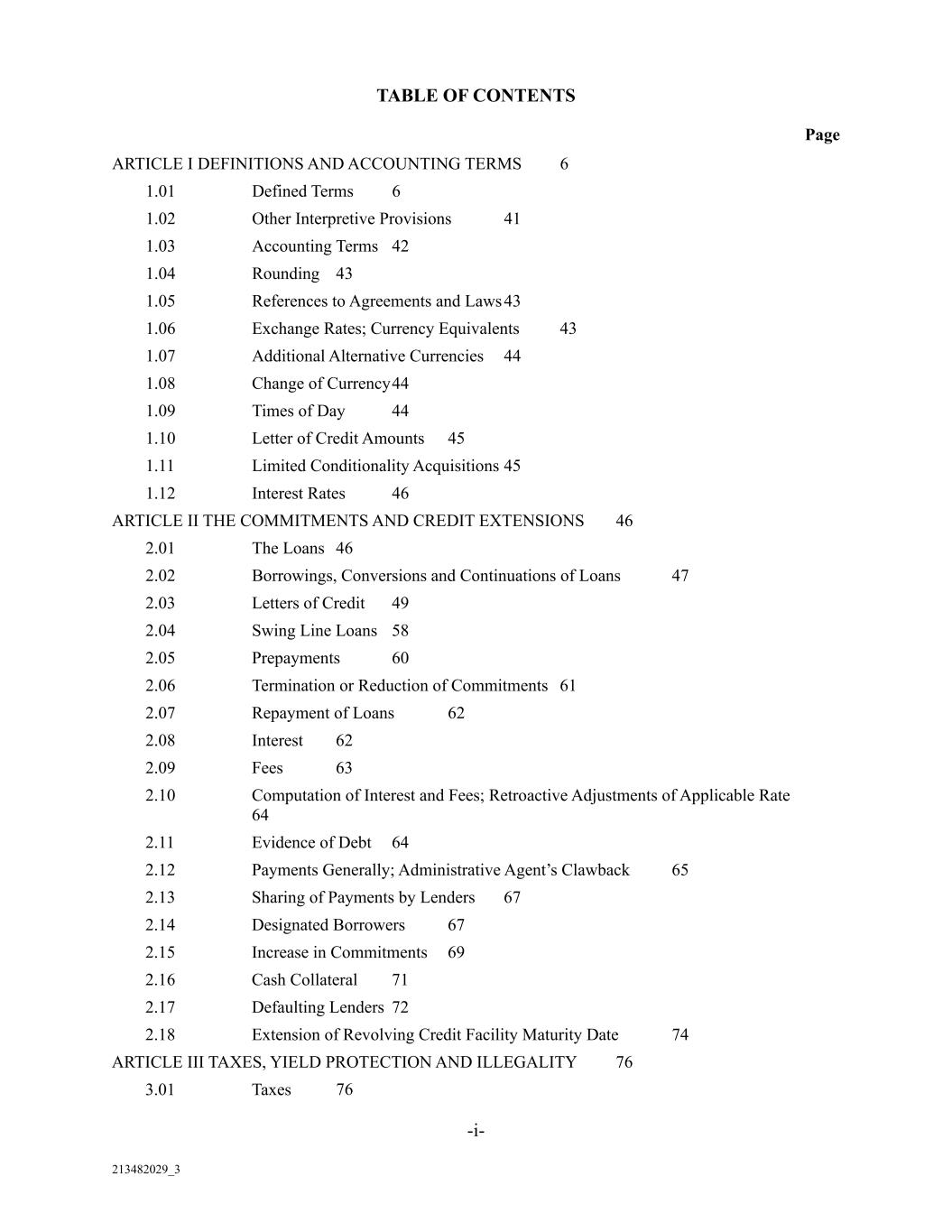 TABLE OF CONTENTS -i- 213482029_3 Page ARTICLE I DEFINITIONS AND ACCOUNTING TERMS 6 1.01 Defined Terms 6 1.02 Other Interpretive Provisions 41 1.03 Accounting Terms 42 1.04 Rounding 43 1.05 References to Agreements and Laws 43 1.06 Exchange Rates; Currency Equivalents 43 1.07 Additional Alternative Currencies 44 1.08 Change of Currency 44 1.09 Times of Day 44 1.10 Letter of Credit Amounts 45 1.11 Limited Conditionality Acquisitions 45 1.12 Interest Rates 46 ARTICLE II THE COMMITMENTS AND CREDIT EXTENSIONS 46 2.01 The Loans 46 2.02 Borrowings, Conversions and Continuations of Loans 47 2.03 Letters of Credit 49 2.04 Swing Line Loans 58 2.05 Prepayments 60 2.06 Termination or Reduction of Commitments 61 2.07 Repayment of Loans 62 2.08 Interest 62 2.09 Fees 63 2.10 Computation of Interest and Fees; Retroactive Adjustments of Applicable Rate 64 2.11 Evidence of Debt 64 2.12 Payments Generally; Administrative Agent’s Clawback 65 2.13 Sharing of Payments by Lenders 67 2.14 Designated Borrowers 67 2.15 Increase in Commitments 69 2.16 Cash Collateral 71 2.17 Defaulting Lenders 72 2.18 Extension of Revolving Credit Facility Maturity Date 74 ARTICLE III TAXES, YIELD PROTECTION AND ILLEGALITY 76 3.01 Taxes 76
