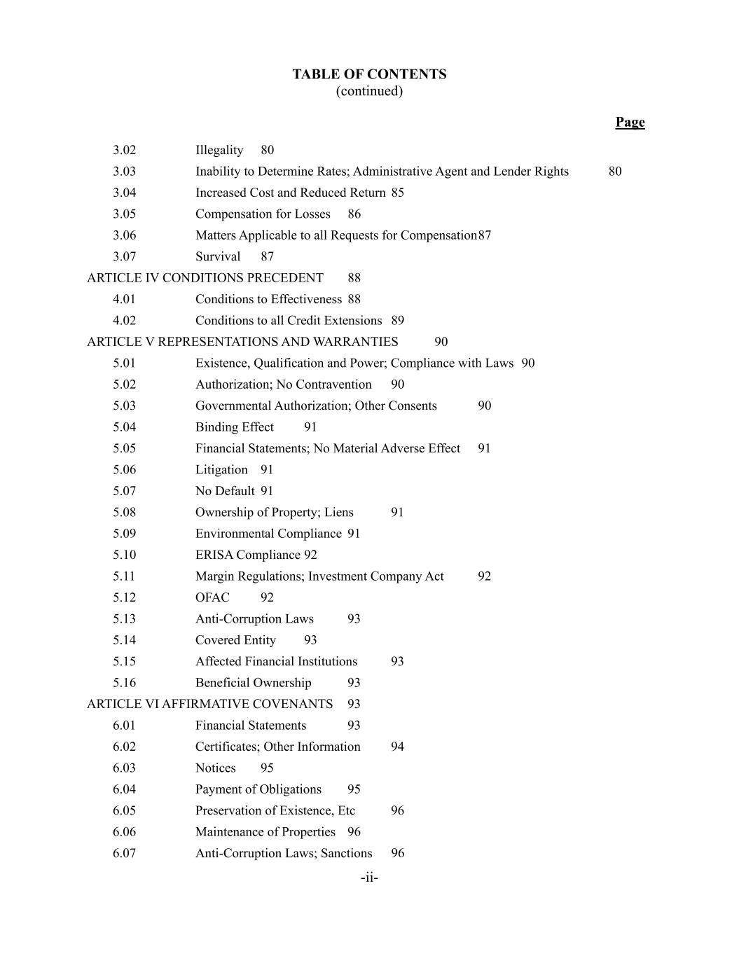 TABLE OF CONTENTS (continued) Page -ii- 3.02 Illegality 80 3.03 Inability to Determine Rates; Administrative Agent and Lender Rights 80 3.04 Increased Cost and Reduced Return 85 3.05 Compensation for Losses 86 3.06 Matters Applicable to all Requests for Compensation 87 3.07 Survival 87 ARTICLE IV CONDITIONS PRECEDENT 88 4.01 Conditions to Effectiveness 88 4.02 Conditions to all Credit Extensions 89 ARTICLE V REPRESENTATIONS AND WARRANTIES 90 5.01 Existence, Qualification and Power; Compliance with Laws 90 5.02 Authorization; No Contravention 90 5.03 Governmental Authorization; Other Consents 90 5.04 Binding Effect 91 5.05 Financial Statements; No Material Adverse Effect 91 5.06 Litigation 91 5.07 No Default 91 5.08 Ownership of Property; Liens 91 5.09 Environmental Compliance 91 5.10 ERISA Compliance 92 5.11 Margin Regulations; Investment Company Act 92 5.12 OFAC 92 5.13 Anti-Corruption Laws 93 5.14 Covered Entity 93 5.15 Affected Financial Institutions 93 5.16 Beneficial Ownership 93 ARTICLE VI AFFIRMATIVE COVENANTS 93 6.01 Financial Statements 93 6.02 Certificates; Other Information 94 6.03 Notices 95 6.04 Payment of Obligations 95 6.05 Preservation of Existence, Etc 96 6.06 Maintenance of Properties 96 6.07 Anti-Corruption Laws; Sanctions 96
