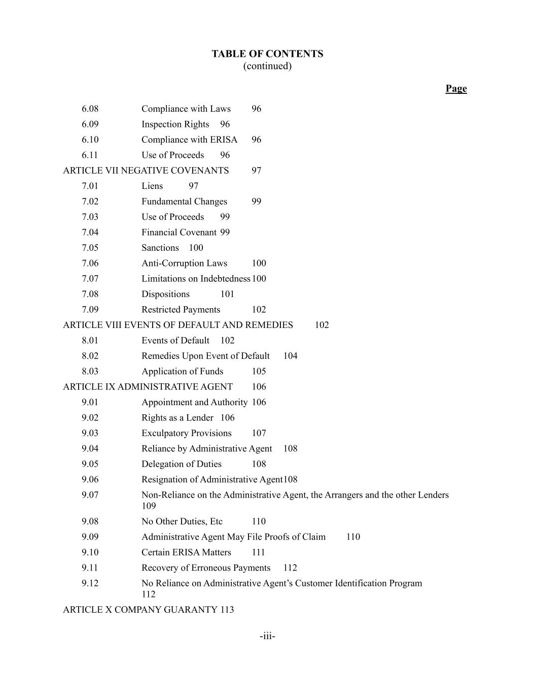 TABLE OF CONTENTS (continued) Page -iii- 6.08 Compliance with Laws 96 6.09 Inspection Rights 96 6.10 Compliance with ERISA 96 6.11 Use of Proceeds 96 ARTICLE VII NEGATIVE COVENANTS 97 7.01 Liens 97 7.02 Fundamental Changes 99 7.03 Use of Proceeds 99 7.04 Financial Covenant 99 7.05 Sanctions 100 7.06 Anti-Corruption Laws 100 7.07 Limitations on Indebtedness 100 7.08 Dispositions 101 7.09 Restricted Payments 102 ARTICLE VIII EVENTS OF DEFAULT AND REMEDIES 102 8.01 Events of Default 102 8.02 Remedies Upon Event of Default 104 8.03 Application of Funds 105 ARTICLE IX ADMINISTRATIVE AGENT 106 9.01 Appointment and Authority 106 9.02 Rights as a Lender 106 9.03 Exculpatory Provisions 107 9.04 Reliance by Administrative Agent 108 9.05 Delegation of Duties 108 9.06 Resignation of Administrative Agent 108 9.07 Non-Reliance on the Administrative Agent, the Arrangers and the other Lenders 109 9.08 No Other Duties, Etc 110 9.09 Administrative Agent May File Proofs of Claim 110 9.10 Certain ERISA Matters 111 9.11 Recovery of Erroneous Payments 112 9.12 No Reliance on Administrative Agent’s Customer Identification Program 112 ARTICLE X COMPANY GUARANTY 113