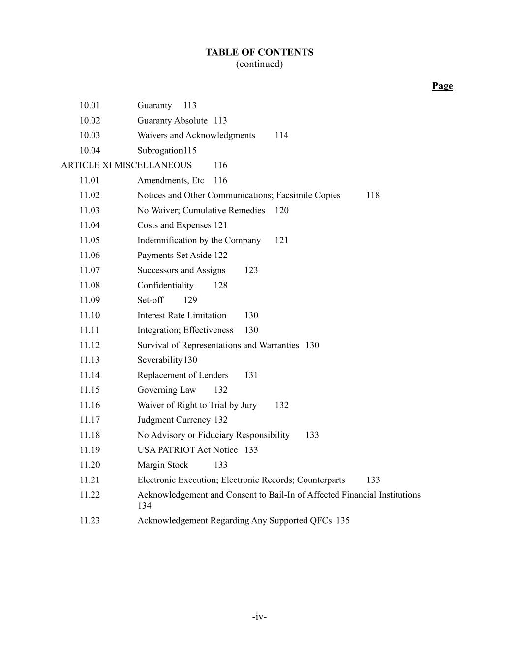 TABLE OF CONTENTS (continued) Page -iv- 10.01 Guaranty 113 10.02 Guaranty Absolute 113 10.03 Waivers and Acknowledgments 114 10.04 Subrogation 115 ARTICLE XI MISCELLANEOUS 116 11.01 Amendments, Etc 116 11.02 Notices and Other Communications; Facsimile Copies 118 11.03 No Waiver; Cumulative Remedies 120 11.04 Costs and Expenses 121 11.05 Indemnification by the Company 121 11.06 Payments Set Aside 122 11.07 Successors and Assigns 123 11.08 Confidentiality 128 11.09 Set-off 129 11.10 Interest Rate Limitation 130 11.11 Integration; Effectiveness 130 11.12 Survival of Representations and Warranties 130 11.13 Severability 130 11.14 Replacement of Lenders 131 11.15 Governing Law 132 11.16 Waiver of Right to Trial by Jury 132 11.17 Judgment Currency 132 11.18 No Advisory or Fiduciary Responsibility 133 11.19 USA PATRIOT Act Notice 133 11.20 Margin Stock 133 11.21 Electronic Execution; Electronic Records; Counterparts 133 11.22 Acknowledgement and Consent to Bail-In of Affected Financial Institutions 134 11.23 Acknowledgement Regarding Any Supported QFCs 135