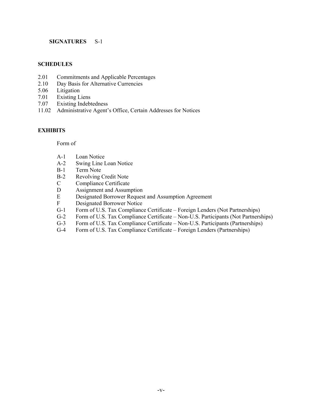 -v- SIGNATURES S-1 SCHEDULES 2.01 Commitments and Applicable Percentages 2.10 Day Basis for Alternative Currencies 5.06 Litigation 7.01 Existing Liens 7.07 Existing Indebtedness 11.02 Administrative Agent’s Office, Certain Addresses for Notices EXHIBITS Form of A-1 Loan Notice A-2 Swing Line Loan Notice B-1 Term Note B-2 Revolving Credit Note C Compliance Certificate D Assignment and Assumption E Designated Borrower Request and Assumption Agreement F Designated Borrower Notice G-1 Form of U.S. Tax Compliance Certificate – Foreign Lenders (Not Partnerships) G-2 Form of U.S. Tax Compliance Certificate – Non-U.S. Participants (Not Partnerships) G-3 Form of U.S. Tax Compliance Certificate – Non-U.S. Participants (Partnerships) G-4 Form of U.S. Tax Compliance Certificate – Foreign Lenders (Partnerships)