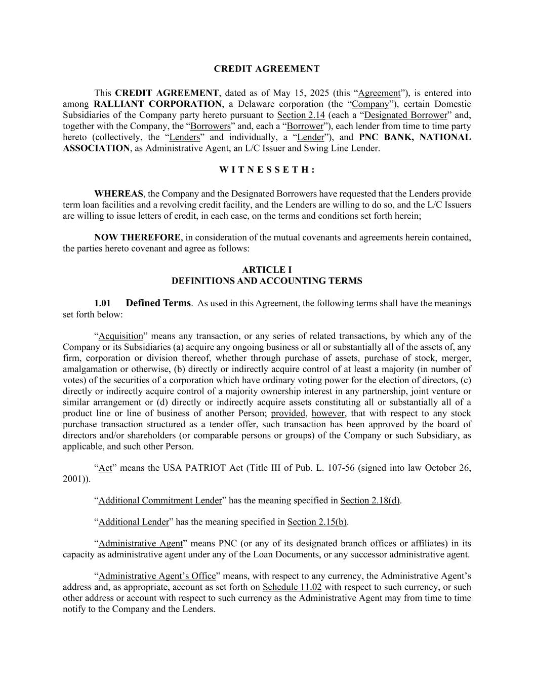 CREDIT AGREEMENT This CREDIT AGREEMENT, dated as of May 15, 2025 (this “Agreement”), is entered into among RALLIANT CORPORATION, a Delaware corporation (the “Company”), certain Domestic Subsidiaries of the Company party hereto pursuant to Section 2.14 (each a “Designated Borrower” and, together with the Company, the “Borrowers” and, each a “Borrower”), each lender from time to time party hereto (collectively, the “Lenders” and individually, a “Lender”), and PNC BANK, NATIONAL ASSOCIATION, as Administrative Agent, an L/C Issuer and Swing Line Lender. W I T N E S S E T H : WHEREAS, the Company and the Designated Borrowers have requested that the Lenders provide term loan facilities and a revolving credit facility, and the Lenders are willing to do so, and the L/C Issuers are willing to issue letters of credit, in each case, on the terms and conditions set forth herein; NOW THEREFORE, in consideration of the mutual covenants and agreements herein contained, the parties hereto covenant and agree as follows: ARTICLE I DEFINITIONS AND ACCOUNTING TERMS 1.01 Defined Terms. As used in this Agreement, the following terms shall have the meanings set forth below: “Acquisition” means any transaction, or any series of related transactions, by which any of the Company or its Subsidiaries (a) acquire any ongoing business or all or substantially all of the assets of, any firm, corporation or division thereof, whether through purchase of assets, purchase of stock, merger, amalgamation or otherwise, (b) directly or indirectly acquire control of at least a majority (in number of votes) of the securities of a corporation which have ordinary voting power for the election of directors, (c) directly or indirectly acquire control of a majority ownership interest in any partnership, joint venture or similar arrangement or (d) directly or indirectly acquire assets constituting all or substantially all of a product line or line of business of another Person; provided, however, that with respect to any stock purchase transaction structured as a tender offer, such transaction has been approved by the board of directors and/or shareholders (or comparable persons or groups) of the Company or such Subsidiary, as applicable, and such other Person. “Act” means the USA PATRIOT Act (Title III of Pub. L. 107-56 (signed into law October 26, 2001)). “Additional Commitment Lender” has the meaning specified in Section 2.18(d). “Additional Lender” has the meaning specified in Section 2.15(b). “Administrative Agent” means PNC (or any of its designated branch offices or affiliates) in its capacity as administrative agent under any of the Loan Documents, or any successor administrative agent. “Administrative Agent’s Office” means, with respect to any currency, the Administrative Agent’s address and, as appropriate, account as set forth on Schedule 11.02 with respect to such currency, or such other address or account with respect to such currency as the Administrative Agent may from time to time notify to the Company and the Lenders.