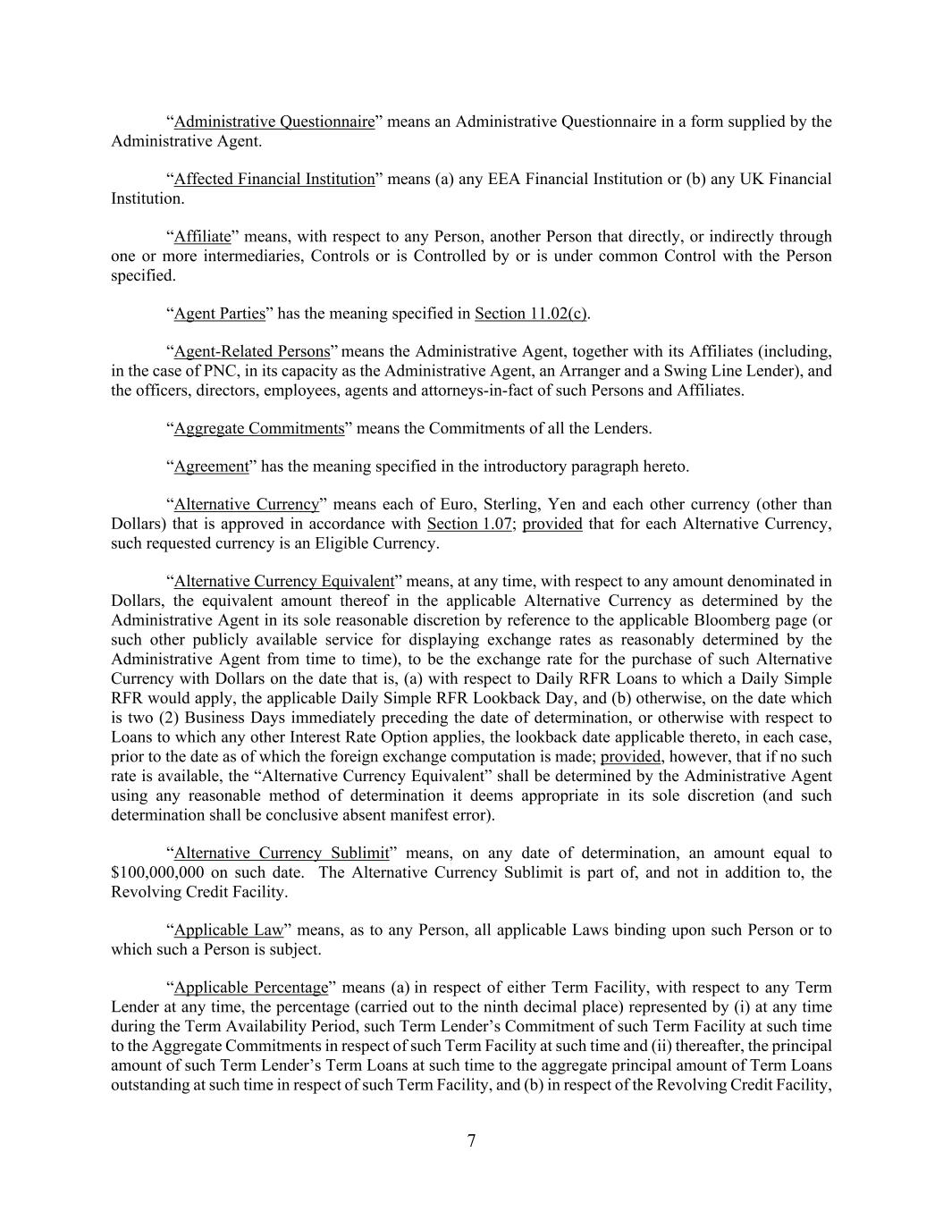 7 “Administrative Questionnaire” means an Administrative Questionnaire in a form supplied by the Administrative Agent. “Affected Financial Institution” means (a) any EEA Financial Institution or (b) any UK Financial Institution. “Affiliate” means, with respect to any Person, another Person that directly, or indirectly through one or more intermediaries, Controls or is Controlled by or is under common Control with the Person specified. “Agent Parties” has the meaning specified in Section 11.02(c). “Agent-Related Persons” means the Administrative Agent, together with its Affiliates (including, in the case of PNC, in its capacity as the Administrative Agent, an Arranger and a Swing Line Lender), and the officers, directors, employees, agents and attorneys-in-fact of such Persons and Affiliates. “Aggregate Commitments” means the Commitments of all the Lenders. “Agreement” has the meaning specified in the introductory paragraph hereto. “Alternative Currency” means each of Euro, Sterling, Yen and each other currency (other than Dollars) that is approved in accordance with Section 1.07; provided that for each Alternative Currency, such requested currency is an Eligible Currency. “Alternative Currency Equivalent” means, at any time, with respect to any amount denominated in Dollars, the equivalent amount thereof in the applicable Alternative Currency as determined by the Administrative Agent in its sole reasonable discretion by reference to the applicable Bloomberg page (or such other publicly available service for displaying exchange rates as reasonably determined by the Administrative Agent from time to time), to be the exchange rate for the purchase of such Alternative Currency with Dollars on the date that is, (a) with respect to Daily RFR Loans to which a Daily Simple RFR would apply, the applicable Daily Simple RFR Lookback Day, and (b) otherwise, on the date which is two (2) Business Days immediately preceding the date of determination, or otherwise with respect to Loans to which any other Interest Rate Option applies, the lookback date applicable thereto, in each case, prior to the date as of which the foreign exchange computation is made; provided, however, that if no such rate is available, the “Alternative Currency Equivalent” shall be determined by the Administrative Agent using any reasonable method of determination it deems appropriate in its sole discretion (and such determination shall be conclusive absent manifest error). “Alternative Currency Sublimit” means, on any date of determination, an amount equal to $100,000,000 on such date. The Alternative Currency Sublimit is part of, and not in addition to, the Revolving Credit Facility. “Applicable Law” means, as to any Person, all applicable Laws binding upon such Person or to which such a Person is subject. “Applicable Percentage” means (a) in respect of either Term Facility, with respect to any Term Lender at any time, the percentage (carried out to the ninth decimal place) represented by (i) at any time during the Term Availability Period, such Term Lender’s Commitment of such Term Facility at such time to the Aggregate Commitments in respect of such Term Facility at such time and (ii) thereafter, the principal amount of such Term Lender’s Term Loans at such time to the aggregate principal amount of Term Loans outstanding at such time in respect of such Term Facility, and (b) in respect of the Revolving Credit Facility,
