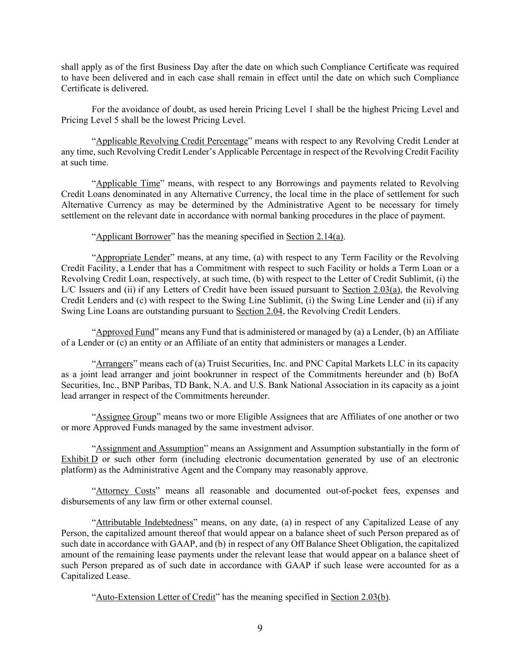 9 shall apply as of the first Business Day after the date on which such Compliance Certificate was required to have been delivered and in each case shall remain in effect until the date on which such Compliance Certificate is delivered. For the avoidance of doubt, as used herein Pricing Level 1 shall be the highest Pricing Level and Pricing Level 5 shall be the lowest Pricing Level. “Applicable Revolving Credit Percentage” means with respect to any Revolving Credit Lender at any time, such Revolving Credit Lender’s Applicable Percentage in respect of the Revolving Credit Facility at such time. “Applicable Time” means, with respect to any Borrowings and payments related to Revolving Credit Loans denominated in any Alternative Currency, the local time in the place of settlement for such Alternative Currency as may be determined by the Administrative Agent to be necessary for timely settlement on the relevant date in accordance with normal banking procedures in the place of payment. “Applicant Borrower” has the meaning specified in Section 2.14(a). “Appropriate Lender” means, at any time, (a) with respect to any Term Facility or the Revolving Credit Facility, a Lender that has a Commitment with respect to such Facility or holds a Term Loan or a Revolving Credit Loan, respectively, at such time, (b) with respect to the Letter of Credit Sublimit, (i) the L/C Issuers and (ii) if any Letters of Credit have been issued pursuant to Section 2.03(a), the Revolving Credit Lenders and (c) with respect to the Swing Line Sublimit, (i) the Swing Line Lender and (ii) if any Swing Line Loans are outstanding pursuant to Section 2.04, the Revolving Credit Lenders. “Approved Fund” means any Fund that is administered or managed by (a) a Lender, (b) an Affiliate of a Lender or (c) an entity or an Affiliate of an entity that administers or manages a Lender. “Arrangers” means each of (a) Truist Securities, Inc. and PNC Capital Markets LLC in its capacity as a joint lead arranger and joint bookrunner in respect of the Commitments hereunder and (b) BofA Securities, Inc., BNP Paribas, TD Bank, N.A. and U.S. Bank National Association in its capacity as a joint lead arranger in respect of the Commitments hereunder. “Assignee Group” means two or more Eligible Assignees that are Affiliates of one another or two or more Approved Funds managed by the same investment advisor. “Assignment and Assumption” means an Assignment and Assumption substantially in the form of Exhibit D or such other form (including electronic documentation generated by use of an electronic platform) as the Administrative Agent and the Company may reasonably approve. “Attorney Costs” means all reasonable and documented out-of-pocket fees, expenses and disbursements of any law firm or other external counsel. “Attributable Indebtedness” means, on any date, (a) in respect of any Capitalized Lease of any Person, the capitalized amount thereof that would appear on a balance sheet of such Person prepared as of such date in accordance with GAAP, and (b) in respect of any Off Balance Sheet Obligation, the capitalized amount of the remaining lease payments under the relevant lease that would appear on a balance sheet of such Person prepared as of such date in accordance with GAAP if such lease were accounted for as a Capitalized Lease. “Auto-Extension Letter of Credit” has the meaning specified in Section 2.03(b).
