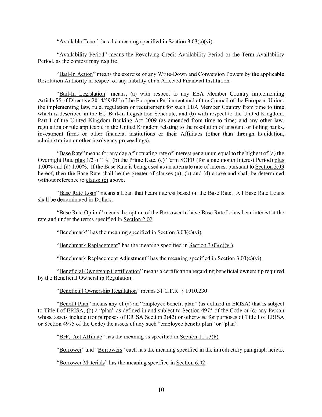 10 “Available Tenor” has the meaning specified in Section 3.03(c)(vi). “Availability Period” means the Revolving Credit Availability Period or the Term Availability Period, as the context may require. “Bail-In Action” means the exercise of any Write-Down and Conversion Powers by the applicable Resolution Authority in respect of any liability of an Affected Financial Institution. “Bail-In Legislation” means, (a) with respect to any EEA Member Country implementing Article 55 of Directive 2014/59/EU of the European Parliament and of the Council of the European Union, the implementing law, rule, regulation or requirement for such EEA Member Country from time to time which is described in the EU Bail-In Legislation Schedule, and (b) with respect to the United Kingdom, Part I of the United Kingdom Banking Act 2009 (as amended from time to time) and any other law, regulation or rule applicable in the United Kingdom relating to the resolution of unsound or failing banks, investment firms or other financial institutions or their Affiliates (other than through liquidation, administration or other insolvency proceedings). “Base Rate” means for any day a fluctuating rate of interest per annum equal to the highest of (a) the Overnight Rate plus 1/2 of 1%, (b) the Prime Rate, (c) Term SOFR (for a one month Interest Period) plus 1.00% and (d) 1.00%. If the Base Rate is being used as an alternate rate of interest pursuant to Section 3.03 hereof, then the Base Rate shall be the greater of clauses (a), (b) and (d) above and shall be determined without reference to clause (c) above. “Base Rate Loan” means a Loan that bears interest based on the Base Rate. All Base Rate Loans shall be denominated in Dollars. “Base Rate Option” means the option of the Borrower to have Base Rate Loans bear interest at the rate and under the terms specified in Section 2.02. “Benchmark” has the meaning specified in Section 3.03(c)(vi). “Benchmark Replacement” has the meaning specified in Section 3.03(c)(vi). “Benchmark Replacement Adjustment” has the meaning specified in Section 3.03(c)(vi). “Beneficial Ownership Certification” means a certification regarding beneficial ownership required by the Beneficial Ownership Regulation. “Beneficial Ownership Regulation” means 31 C.F.R. § 1010.230. “Benefit Plan” means any of (a) an “employee benefit plan” (as defined in ERISA) that is subject to Title I of ERISA, (b) a “plan” as defined in and subject to Section 4975 of the Code or (c) any Person whose assets include (for purposes of ERISA Section 3(42) or otherwise for purposes of Title I of ERISA or Section 4975 of the Code) the assets of any such “employee benefit plan” or “plan”. “BHC Act Affiliate” has the meaning as specified in Section 11.23(b). “Borrower” and “Borrowers” each has the meaning specified in the introductory paragraph hereto. “Borrower Materials” has the meaning specified in Section 6.02.
