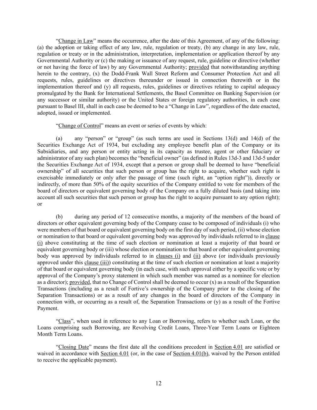 12 “Change in Law” means the occurrence, after the date of this Agreement, of any of the following: (a) the adoption or taking effect of any law, rule, regulation or treaty, (b) any change in any law, rule, regulation or treaty or in the administration, interpretation, implementation or application thereof by any Governmental Authority or (c) the making or issuance of any request, rule, guideline or directive (whether or not having the force of law) by any Governmental Authority; provided that notwithstanding anything herein to the contrary, (x) the Dodd-Frank Wall Street Reform and Consumer Protection Act and all requests, rules, guidelines or directives thereunder or issued in connection therewith or in the implementation thereof and (y) all requests, rules, guidelines or directives relating to capital adequacy promulgated by the Bank for International Settlements, the Basel Committee on Banking Supervision (or any successor or similar authority) or the United States or foreign regulatory authorities, in each case pursuant to Basel III, shall in each case be deemed to be a “Change in Law”, regardless of the date enacted, adopted, issued or implemented. “Change of Control” means an event or series of events by which: (a) any “person” or “group” (as such terms are used in Sections 13(d) and 14(d) of the Securities Exchange Act of 1934, but excluding any employee benefit plan of the Company or its Subsidiaries, and any person or entity acting in its capacity as trustee, agent or other fiduciary or administrator of any such plan) becomes the “beneficial owner” (as defined in Rules 13d-3 and 13d-5 under the Securities Exchange Act of 1934, except that a person or group shall be deemed to have “beneficial ownership” of all securities that such person or group has the right to acquire, whether such right is exercisable immediately or only after the passage of time (such right, an “option right”)), directly or indirectly, of more than 50% of the equity securities of the Company entitled to vote for members of the board of directors or equivalent governing body of the Company on a fully diluted basis (and taking into account all such securities that such person or group has the right to acquire pursuant to any option right); or (b) during any period of 12 consecutive months, a majority of the members of the board of directors or other equivalent governing body of the Company cease to be composed of individuals (i) who were members of that board or equivalent governing body on the first day of such period, (ii) whose election or nomination to that board or equivalent governing body was approved by individuals referred to in clause (i) above constituting at the time of such election or nomination at least a majority of that board or equivalent governing body or (iii) whose election or nomination to that board or other equivalent governing body was approved by individuals referred to in clauses (i) and (ii) above (or individuals previously approved under this clause (iii)) constituting at the time of such election or nomination at least a majority of that board or equivalent governing body (in each case, with such approval either by a specific vote or by approval of the Company’s proxy statement in which such member was named as a nominee for election as a director); provided, that no Change of Control shall be deemed to occur (x) as a result of the Separation Transactions (including as a result of Fortive’s ownership of the Company prior to the closing of the Separation Transactions) or as a result of any changes in the board of directors of the Company in connection with, or occurring as a result of, the Separation Transactions or (y) as a result of the Fortive Payment. “Class”, when used in reference to any Loan or Borrowing, refers to whether such Loan, or the Loans comprising such Borrowing, are Revolving Credit Loans, Three-Year Term Loans or Eighteen Month Term Loans. “Closing Date” means the first date all the conditions precedent in Section 4.01 are satisfied or waived in accordance with Section 4.01 (or, in the case of Section 4.01(b), waived by the Person entitled to receive the applicable payment).