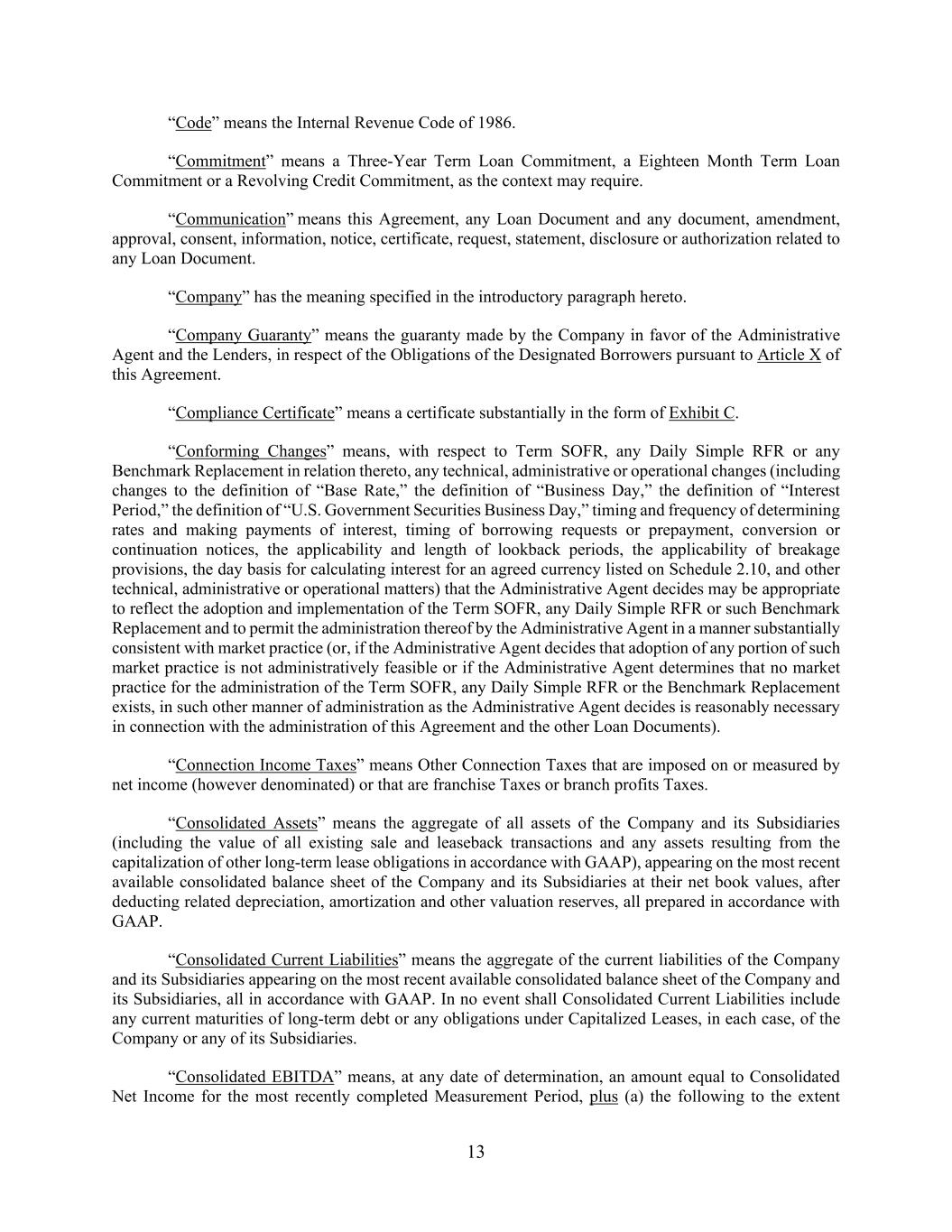 13 “Code” means the Internal Revenue Code of 1986. “Commitment” means a Three-Year Term Loan Commitment, a Eighteen Month Term Loan Commitment or a Revolving Credit Commitment, as the context may require. “Communication” means this Agreement, any Loan Document and any document, amendment, approval, consent, information, notice, certificate, request, statement, disclosure or authorization related to any Loan Document. “Company” has the meaning specified in the introductory paragraph hereto. “Company Guaranty” means the guaranty made by the Company in favor of the Administrative Agent and the Lenders, in respect of the Obligations of the Designated Borrowers pursuant to Article X of this Agreement. “Compliance Certificate” means a certificate substantially in the form of Exhibit C. “Conforming Changes” means, with respect to Term SOFR, any Daily Simple RFR or any Benchmark Replacement in relation thereto, any technical, administrative or operational changes (including changes to the definition of “Base Rate,” the definition of “Business Day,” the definition of “Interest Period,” the definition of “U.S. Government Securities Business Day,” timing and frequency of determining rates and making payments of interest, timing of borrowing requests or prepayment, conversion or continuation notices, the applicability and length of lookback periods, the applicability of breakage provisions, the day basis for calculating interest for an agreed currency listed on Schedule 2.10, and other technical, administrative or operational matters) that the Administrative Agent decides may be appropriate to reflect the adoption and implementation of the Term SOFR, any Daily Simple RFR or such Benchmark Replacement and to permit the administration thereof by the Administrative Agent in a manner substantially consistent with market practice (or, if the Administrative Agent decides that adoption of any portion of such market practice is not administratively feasible or if the Administrative Agent determines that no market practice for the administration of the Term SOFR, any Daily Simple RFR or the Benchmark Replacement exists, in such other manner of administration as the Administrative Agent decides is reasonably necessary in connection with the administration of this Agreement and the other Loan Documents). “Connection Income Taxes” means Other Connection Taxes that are imposed on or measured by net income (however denominated) or that are franchise Taxes or branch profits Taxes. “Consolidated Assets” means the aggregate of all assets of the Company and its Subsidiaries (including the value of all existing sale and leaseback transactions and any assets resulting from the capitalization of other long-term lease obligations in accordance with GAAP), appearing on the most recent available consolidated balance sheet of the Company and its Subsidiaries at their net book values, after deducting related depreciation, amortization and other valuation reserves, all prepared in accordance with GAAP. “Consolidated Current Liabilities” means the aggregate of the current liabilities of the Company and its Subsidiaries appearing on the most recent available consolidated balance sheet of the Company and its Subsidiaries, all in accordance with GAAP. In no event shall Consolidated Current Liabilities include any current maturities of long-term debt or any obligations under Capitalized Leases, in each case, of the Company or any of its Subsidiaries. “Consolidated EBITDA” means, at any date of determination, an amount equal to Consolidated Net Income for the most recently completed Measurement Period, plus (a) the following to the extent