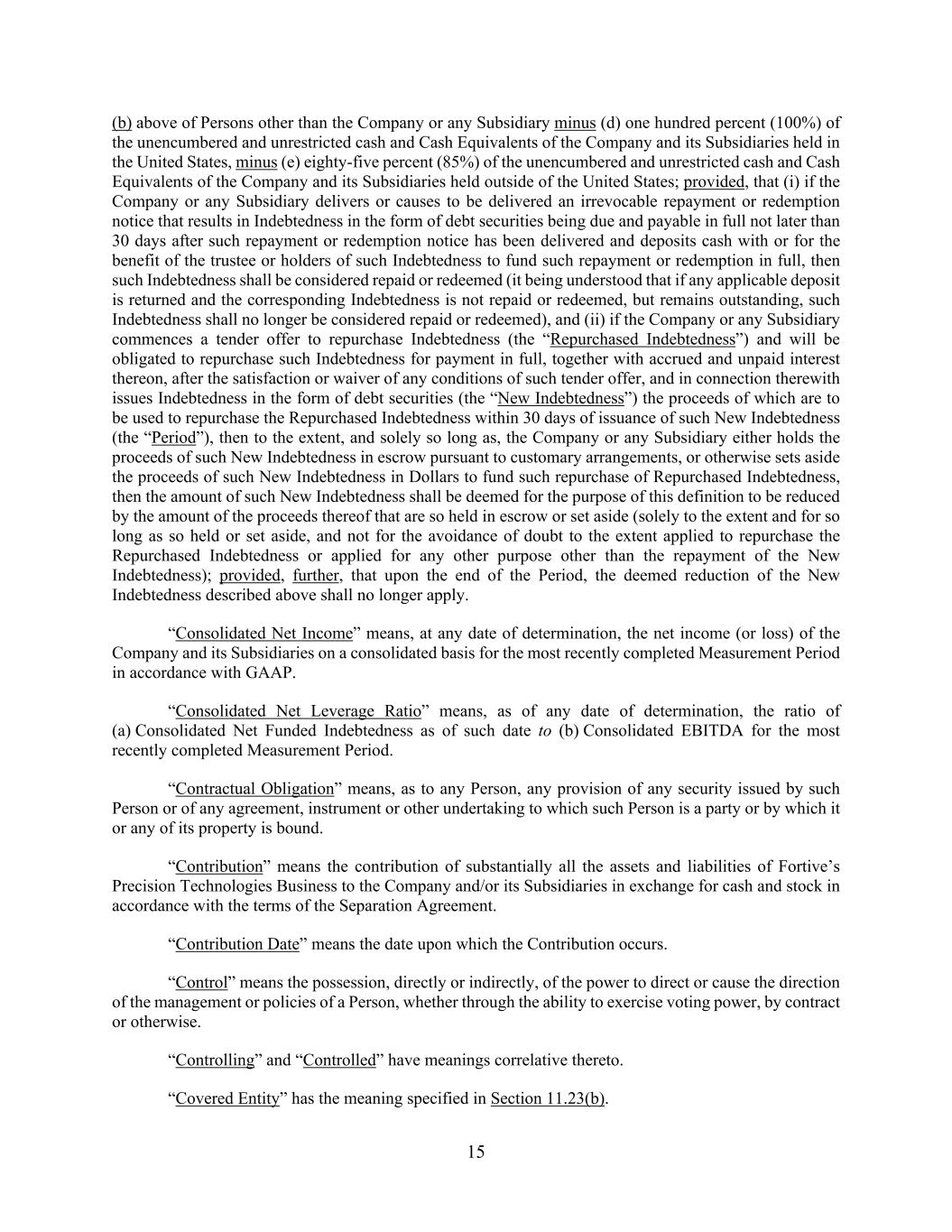 15 (b) above of Persons other than the Company or any Subsidiary minus (d) one hundred percent (100%) of the unencumbered and unrestricted cash and Cash Equivalents of the Company and its Subsidiaries held in the United States, minus (e) eighty-five percent (85%) of the unencumbered and unrestricted cash and Cash Equivalents of the Company and its Subsidiaries held outside of the United States; provided, that (i) if the Company or any Subsidiary delivers or causes to be delivered an irrevocable repayment or redemption notice that results in Indebtedness in the form of debt securities being due and payable in full not later than 30 days after such repayment or redemption notice has been delivered and deposits cash with or for the benefit of the trustee or holders of such Indebtedness to fund such repayment or redemption in full, then such Indebtedness shall be considered repaid or redeemed (it being understood that if any applicable deposit is returned and the corresponding Indebtedness is not repaid or redeemed, but remains outstanding, such Indebtedness shall no longer be considered repaid or redeemed), and (ii) if the Company or any Subsidiary commences a tender offer to repurchase Indebtedness (the “Repurchased Indebtedness”) and will be obligated to repurchase such Indebtedness for payment in full, together with accrued and unpaid interest thereon, after the satisfaction or waiver of any conditions of such tender offer, and in connection therewith issues Indebtedness in the form of debt securities (the “New Indebtedness”) the proceeds of which are to be used to repurchase the Repurchased Indebtedness within 30 days of issuance of such New Indebtedness (the “Period”), then to the extent, and solely so long as, the Company or any Subsidiary either holds the proceeds of such New Indebtedness in escrow pursuant to customary arrangements, or otherwise sets aside the proceeds of such New Indebtedness in Dollars to fund such repurchase of Repurchased Indebtedness, then the amount of such New Indebtedness shall be deemed for the purpose of this definition to be reduced by the amount of the proceeds thereof that are so held in escrow or set aside (solely to the extent and for so long as so held or set aside, and not for the avoidance of doubt to the extent applied to repurchase the Repurchased Indebtedness or applied for any other purpose other than the repayment of the New Indebtedness); provided, further, that upon the end of the Period, the deemed reduction of the New Indebtedness described above shall no longer apply. “Consolidated Net Income” means, at any date of determination, the net income (or loss) of the Company and its Subsidiaries on a consolidated basis for the most recently completed Measurement Period in accordance with GAAP. “Consolidated Net Leverage Ratio” means, as of any date of determination, the ratio of (a) Consolidated Net Funded Indebtedness as of such date to (b) Consolidated EBITDA for the most recently completed Measurement Period. “Contractual Obligation” means, as to any Person, any provision of any security issued by such Person or of any agreement, instrument or other undertaking to which such Person is a party or by which it or any of its property is bound. “Contribution” means the contribution of substantially all the assets and liabilities of Fortive’s Precision Technologies Business to the Company and/or its Subsidiaries in exchange for cash and stock in accordance with the terms of the Separation Agreement. “Contribution Date” means the date upon which the Contribution occurs. “Control” means the possession, directly or indirectly, of the power to direct or cause the direction of the management or policies of a Person, whether through the ability to exercise voting power, by contract or otherwise. “Controlling” and “Controlled” have meanings correlative thereto. “Covered Entity” has the meaning specified in Section 11.23(b).