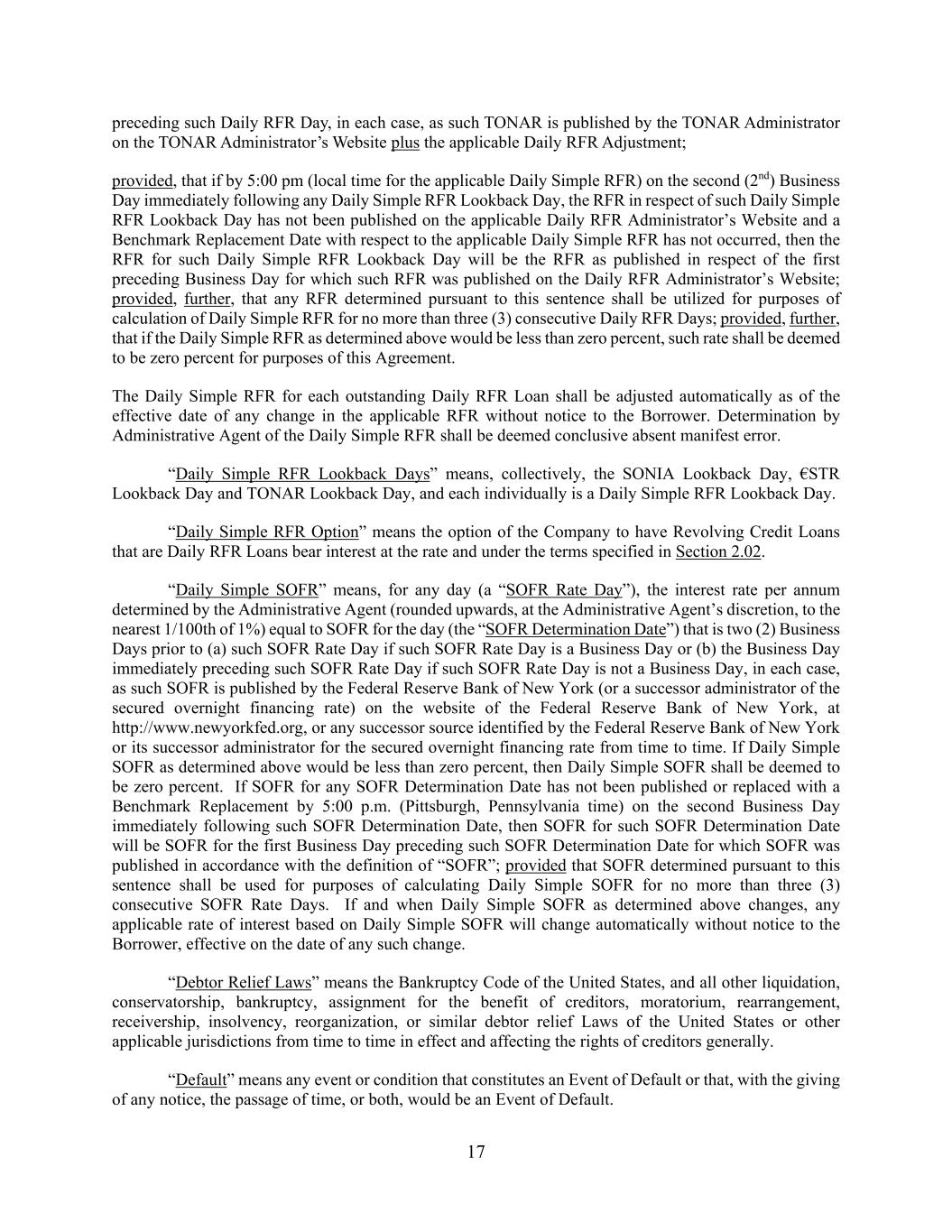 17 preceding such Daily RFR Day, in each case, as such TONAR is published by the TONAR Administrator on the TONAR Administrator’s Website plus the applicable Daily RFR Adjustment; provided, that if by 5:00 pm (local time for the applicable Daily Simple RFR) on the second (2nd) Business Day immediately following any Daily Simple RFR Lookback Day, the RFR in respect of such Daily Simple RFR Lookback Day has not been published on the applicable Daily RFR Administrator’s Website and a Benchmark Replacement Date with respect to the applicable Daily Simple RFR has not occurred, then the RFR for such Daily Simple RFR Lookback Day will be the RFR as published in respect of the first preceding Business Day for which such RFR was published on the Daily RFR Administrator’s Website; provided, further, that any RFR determined pursuant to this sentence shall be utilized for purposes of calculation of Daily Simple RFR for no more than three (3) consecutive Daily RFR Days; provided, further, that if the Daily Simple RFR as determined above would be less than zero percent, such rate shall be deemed to be zero percent for purposes of this Agreement. The Daily Simple RFR for each outstanding Daily RFR Loan shall be adjusted automatically as of the effective date of any change in the applicable RFR without notice to the Borrower. Determination by Administrative Agent of the Daily Simple RFR shall be deemed conclusive absent manifest error. “Daily Simple RFR Lookback Days” means, collectively, the SONIA Lookback Day, €STR Lookback Day and TONAR Lookback Day, and each individually is a Daily Simple RFR Lookback Day. “Daily Simple RFR Option” means the option of the Company to have Revolving Credit Loans that are Daily RFR Loans bear interest at the rate and under the terms specified in Section 2.02. “Daily Simple SOFR” means, for any day (a “SOFR Rate Day”), the interest rate per annum determined by the Administrative Agent (rounded upwards, at the Administrative Agent’s discretion, to the nearest 1/100th of 1%) equal to SOFR for the day (the “SOFR Determination Date”) that is two (2) Business Days prior to (a) such SOFR Rate Day if such SOFR Rate Day is a Business Day or (b) the Business Day immediately preceding such SOFR Rate Day if such SOFR Rate Day is not a Business Day, in each case, as such SOFR is published by the Federal Reserve Bank of New York (or a successor administrator of the secured overnight financing rate) on the website of the Federal Reserve Bank of New York, at http://www.newyorkfed.org, or any successor source identified by the Federal Reserve Bank of New York or its successor administrator for the secured overnight financing rate from time to time. If Daily Simple SOFR as determined above would be less than zero percent, then Daily Simple SOFR shall be deemed to be zero percent. If SOFR for any SOFR Determination Date has not been published or replaced with a Benchmark Replacement by 5:00 p.m. (Pittsburgh, Pennsylvania time) on the second Business Day immediately following such SOFR Determination Date, then SOFR for such SOFR Determination Date will be SOFR for the first Business Day preceding such SOFR Determination Date for which SOFR was published in accordance with the definition of “SOFR”; provided that SOFR determined pursuant to this sentence shall be used for purposes of calculating Daily Simple SOFR for no more than three (3) consecutive SOFR Rate Days. If and when Daily Simple SOFR as determined above changes, any applicable rate of interest based on Daily Simple SOFR will change automatically without notice to the Borrower, effective on the date of any such change. “Debtor Relief Laws” means the Bankruptcy Code of the United States, and all other liquidation, conservatorship, bankruptcy, assignment for the benefit of creditors, moratorium, rearrangement, receivership, insolvency, reorganization, or similar debtor relief Laws of the United States or other applicable jurisdictions from time to time in effect and affecting the rights of creditors generally. “Default” means any event or condition that constitutes an Event of Default or that, with the giving of any notice, the passage of time, or both, would be an Event of Default.