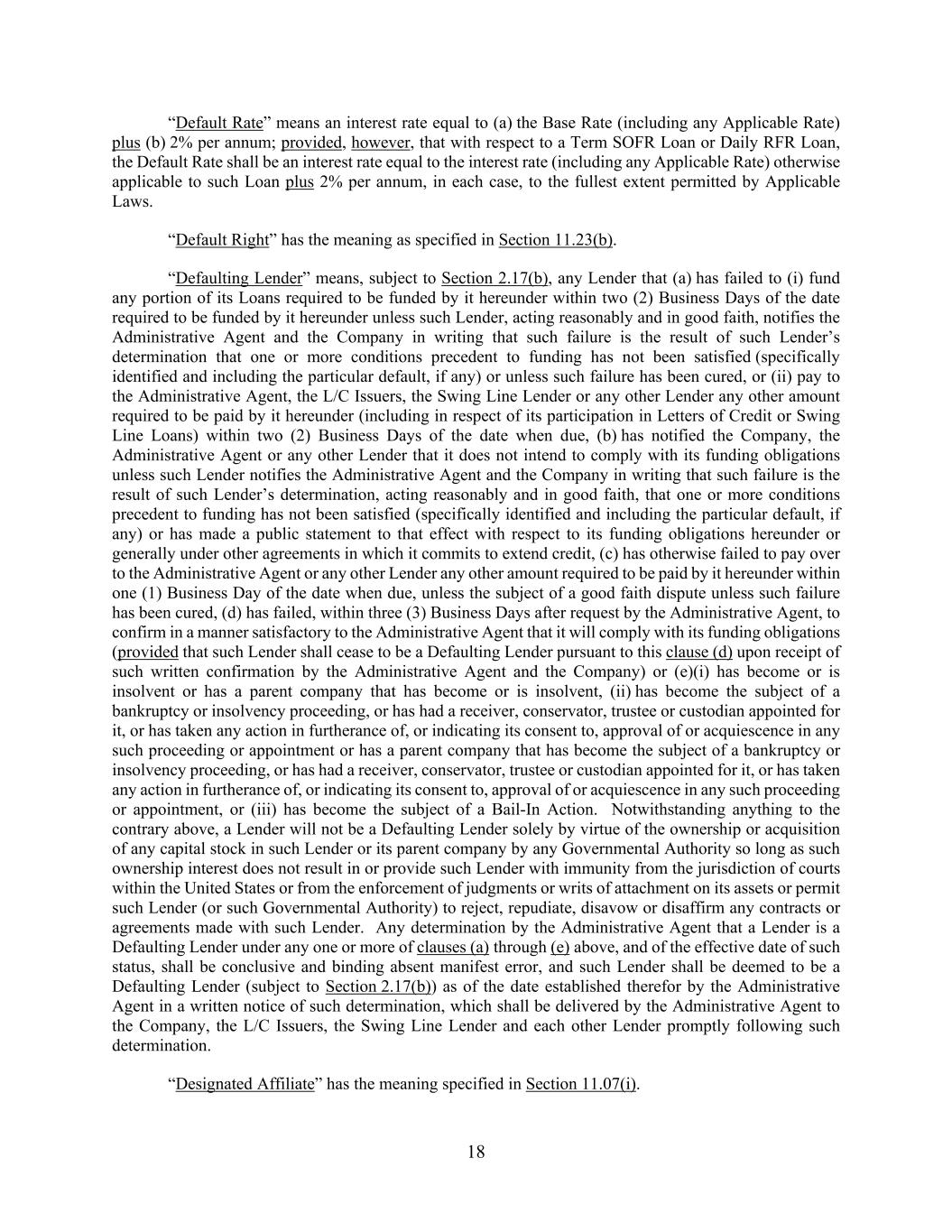 18 “Default Rate” means an interest rate equal to (a) the Base Rate (including any Applicable Rate) plus (b) 2% per annum; provided, however, that with respect to a Term SOFR Loan or Daily RFR Loan, the Default Rate shall be an interest rate equal to the interest rate (including any Applicable Rate) otherwise applicable to such Loan plus 2% per annum, in each case, to the fullest extent permitted by Applicable Laws. “Default Right” has the meaning as specified in Section 11.23(b). “Defaulting Lender” means, subject to Section 2.17(b), any Lender that (a) has failed to (i) fund any portion of its Loans required to be funded by it hereunder within two (2) Business Days of the date required to be funded by it hereunder unless such Lender, acting reasonably and in good faith, notifies the Administrative Agent and the Company in writing that such failure is the result of such Lender’s determination that one or more conditions precedent to funding has not been satisfied (specifically identified and including the particular default, if any) or unless such failure has been cured, or (ii) pay to the Administrative Agent, the L/C Issuers, the Swing Line Lender or any other Lender any other amount required to be paid by it hereunder (including in respect of its participation in Letters of Credit or Swing Line Loans) within two (2) Business Days of the date when due, (b) has notified the Company, the Administrative Agent or any other Lender that it does not intend to comply with its funding obligations unless such Lender notifies the Administrative Agent and the Company in writing that such failure is the result of such Lender’s determination, acting reasonably and in good faith, that one or more conditions precedent to funding has not been satisfied (specifically identified and including the particular default, if any) or has made a public statement to that effect with respect to its funding obligations hereunder or generally under other agreements in which it commits to extend credit, (c) has otherwise failed to pay over to the Administrative Agent or any other Lender any other amount required to be paid by it hereunder within one (1) Business Day of the date when due, unless the subject of a good faith dispute unless such failure has been cured, (d) has failed, within three (3) Business Days after request by the Administrative Agent, to confirm in a manner satisfactory to the Administrative Agent that it will comply with its funding obligations (provided that such Lender shall cease to be a Defaulting Lender pursuant to this clause (d) upon receipt of such written confirmation by the Administrative Agent and the Company) or (e)(i) has become or is insolvent or has a parent company that has become or is insolvent, (ii) has become the subject of a bankruptcy or insolvency proceeding, or has had a receiver, conservator, trustee or custodian appointed for it, or has taken any action in furtherance of, or indicating its consent to, approval of or acquiescence in any such proceeding or appointment or has a parent company that has become the subject of a bankruptcy or insolvency proceeding, or has had a receiver, conservator, trustee or custodian appointed for it, or has taken any action in furtherance of, or indicating its consent to, approval of or acquiescence in any such proceeding or appointment, or (iii) has become the subject of a Bail-In Action. Notwithstanding anything to the contrary above, a Lender will not be a Defaulting Lender solely by virtue of the ownership or acquisition of any capital stock in such Lender or its parent company by any Governmental Authority so long as such ownership interest does not result in or provide such Lender with immunity from the jurisdiction of courts within the United States or from the enforcement of judgments or writs of attachment on its assets or permit such Lender (or such Governmental Authority) to reject, repudiate, disavow or disaffirm any contracts or agreements made with such Lender. Any determination by the Administrative Agent that a Lender is a Defaulting Lender under any one or more of clauses (a) through (e) above, and of the effective date of such status, shall be conclusive and binding absent manifest error, and such Lender shall be deemed to be a Defaulting Lender (subject to Section 2.17(b)) as of the date established therefor by the Administrative Agent in a written notice of such determination, which shall be delivered by the Administrative Agent to the Company, the L/C Issuers, the Swing Line Lender and each other Lender promptly following such determination. “Designated Affiliate” has the meaning specified in Section 11.07(i).