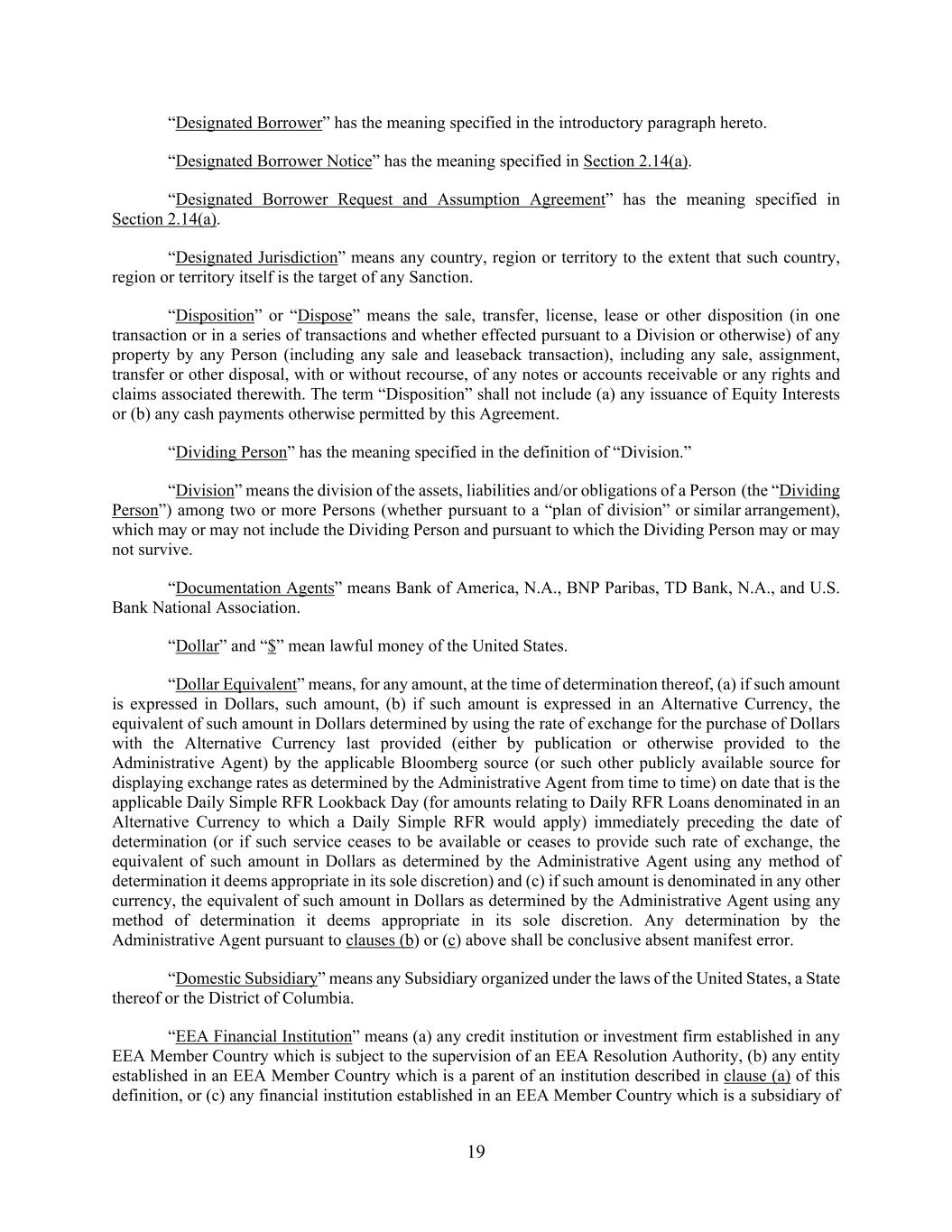 19 “Designated Borrower” has the meaning specified in the introductory paragraph hereto. “Designated Borrower Notice” has the meaning specified in Section 2.14(a). “Designated Borrower Request and Assumption Agreement” has the meaning specified in Section 2.14(a). “Designated Jurisdiction” means any country, region or territory to the extent that such country, region or territory itself is the target of any Sanction. “Disposition” or “Dispose” means the sale, transfer, license, lease or other disposition (in one transaction or in a series of transactions and whether effected pursuant to a Division or otherwise) of any property by any Person (including any sale and leaseback transaction), including any sale, assignment, transfer or other disposal, with or without recourse, of any notes or accounts receivable or any rights and claims associated therewith. The term “Disposition” shall not include (a) any issuance of Equity Interests or (b) any cash payments otherwise permitted by this Agreement. “Dividing Person” has the meaning specified in the definition of “Division.” “Division” means the division of the assets, liabilities and/or obligations of a Person (the “Dividing Person”) among two or more Persons (whether pursuant to a “plan of division” or similar arrangement), which may or may not include the Dividing Person and pursuant to which the Dividing Person may or may not survive. “Documentation Agents” means Bank of America, N.A., BNP Paribas, TD Bank, N.A., and U.S. Bank National Association. “Dollar” and “$” mean lawful money of the United States. “Dollar Equivalent” means, for any amount, at the time of determination thereof, (a) if such amount is expressed in Dollars, such amount, (b) if such amount is expressed in an Alternative Currency, the equivalent of such amount in Dollars determined by using the rate of exchange for the purchase of Dollars with the Alternative Currency last provided (either by publication or otherwise provided to the Administrative Agent) by the applicable Bloomberg source (or such other publicly available source for displaying exchange rates as determined by the Administrative Agent from time to time) on date that is the applicable Daily Simple RFR Lookback Day (for amounts relating to Daily RFR Loans denominated in an Alternative Currency to which a Daily Simple RFR would apply) immediately preceding the date of determination (or if such service ceases to be available or ceases to provide such rate of exchange, the equivalent of such amount in Dollars as determined by the Administrative Agent using any method of determination it deems appropriate in its sole discretion) and (c) if such amount is denominated in any other currency, the equivalent of such amount in Dollars as determined by the Administrative Agent using any method of determination it deems appropriate in its sole discretion. Any determination by the Administrative Agent pursuant to clauses (b) or (c) above shall be conclusive absent manifest error. “Domestic Subsidiary” means any Subsidiary organized under the laws of the United States, a State thereof or the District of Columbia. “EEA Financial Institution” means (a) any credit institution or investment firm established in any EEA Member Country which is subject to the supervision of an EEA Resolution Authority, (b) any entity established in an EEA Member Country which is a parent of an institution described in clause (a) of this definition, or (c) any financial institution established in an EEA Member Country which is a subsidiary of