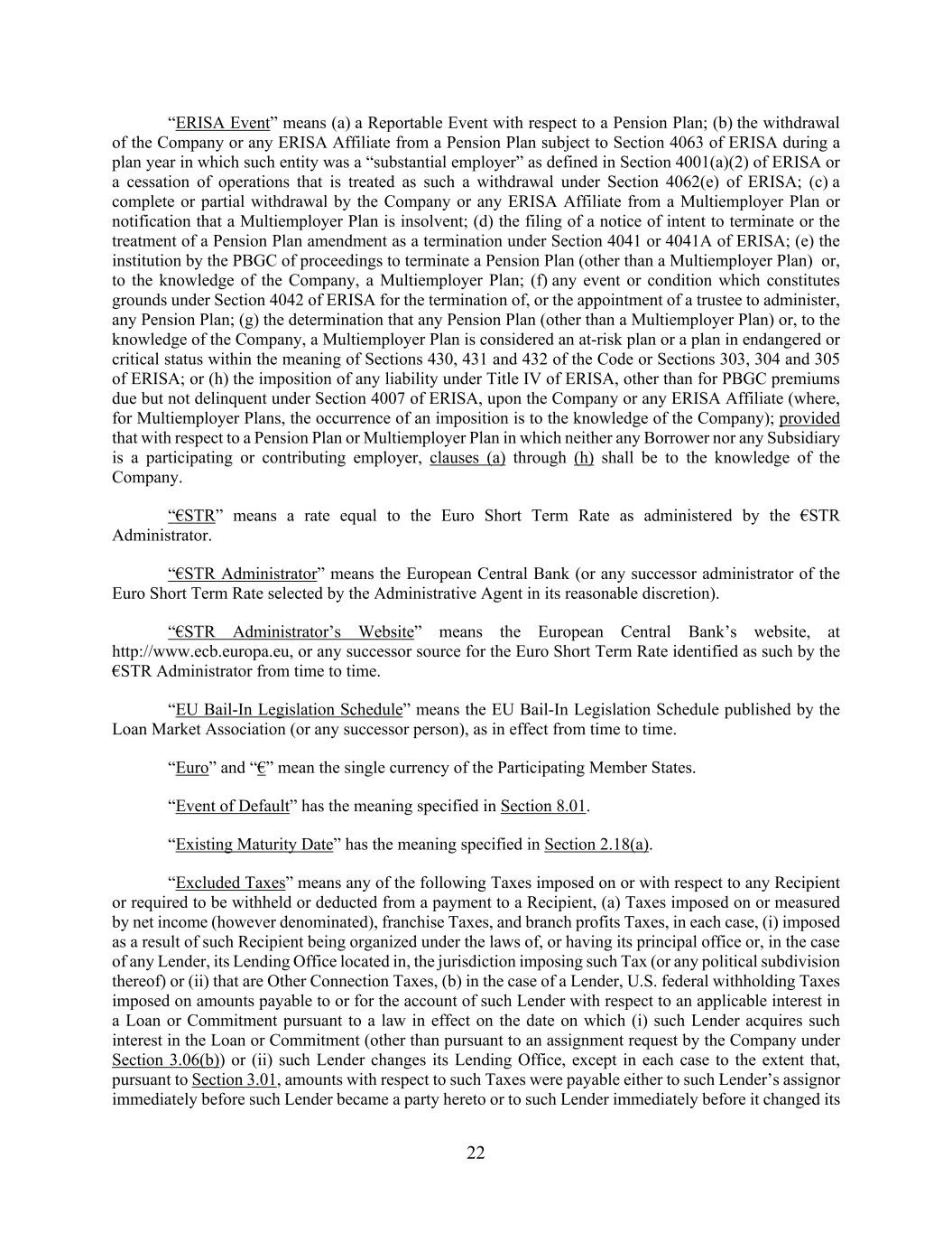 22 “ERISA Event” means (a) a Reportable Event with respect to a Pension Plan; (b) the withdrawal of the Company or any ERISA Affiliate from a Pension Plan subject to Section 4063 of ERISA during a plan year in which such entity was a “substantial employer” as defined in Section 4001(a)(2) of ERISA or a cessation of operations that is treated as such a withdrawal under Section 4062(e) of ERISA; (c) a complete or partial withdrawal by the Company or any ERISA Affiliate from a Multiemployer Plan or notification that a Multiemployer Plan is insolvent; (d) the filing of a notice of intent to terminate or the treatment of a Pension Plan amendment as a termination under Section 4041 or 4041A of ERISA; (e) the institution by the PBGC of proceedings to terminate a Pension Plan (other than a Multiemployer Plan) or, to the knowledge of the Company, a Multiemployer Plan; (f) any event or condition which constitutes grounds under Section 4042 of ERISA for the termination of, or the appointment of a trustee to administer, any Pension Plan; (g) the determination that any Pension Plan (other than a Multiemployer Plan) or, to the knowledge of the Company, a Multiemployer Plan is considered an at-risk plan or a plan in endangered or critical status within the meaning of Sections 430, 431 and 432 of the Code or Sections 303, 304 and 305 of ERISA; or (h) the imposition of any liability under Title IV of ERISA, other than for PBGC premiums due but not delinquent under Section 4007 of ERISA, upon the Company or any ERISA Affiliate (where, for Multiemployer Plans, the occurrence of an imposition is to the knowledge of the Company); provided that with respect to a Pension Plan or Multiemployer Plan in which neither any Borrower nor any Subsidiary is a participating or contributing employer, clauses (a) through (h) shall be to the knowledge of the Company. “€STR” means a rate equal to the Euro Short Term Rate as administered by the €STR Administrator. “€STR Administrator” means the European Central Bank (or any successor administrator of the Euro Short Term Rate selected by the Administrative Agent in its reasonable discretion). “€STR Administrator’s Website” means the European Central Bank’s website, at http://www.ecb.europa.eu, or any successor source for the Euro Short Term Rate identified as such by the €STR Administrator from time to time. “EU Bail-In Legislation Schedule” means the EU Bail-In Legislation Schedule published by the Loan Market Association (or any successor person), as in effect from time to time. “Euro” and “€” mean the single currency of the Participating Member States. “Event of Default” has the meaning specified in Section 8.01. “Existing Maturity Date” has the meaning specified in Section 2.18(a). “Excluded Taxes” means any of the following Taxes imposed on or with respect to any Recipient or required to be withheld or deducted from a payment to a Recipient, (a) Taxes imposed on or measured by net income (however denominated), franchise Taxes, and branch profits Taxes, in each case, (i) imposed as a result of such Recipient being organized under the laws of, or having its principal office or, in the case of any Lender, its Lending Office located in, the jurisdiction imposing such Tax (or any political subdivision thereof) or (ii) that are Other Connection Taxes, (b) in the case of a Lender, U.S. federal withholding Taxes imposed on amounts payable to or for the account of such Lender with respect to an applicable interest in a Loan or Commitment pursuant to a law in effect on the date on which (i) such Lender acquires such interest in the Loan or Commitment (other than pursuant to an assignment request by the Company under Section 3.06(b)) or (ii) such Lender changes its Lending Office, except in each case to the extent that, pursuant to Section 3.01, amounts with respect to such Taxes were payable either to such Lender’s assignor immediately before such Lender became a party hereto or to such Lender immediately before it changed its
