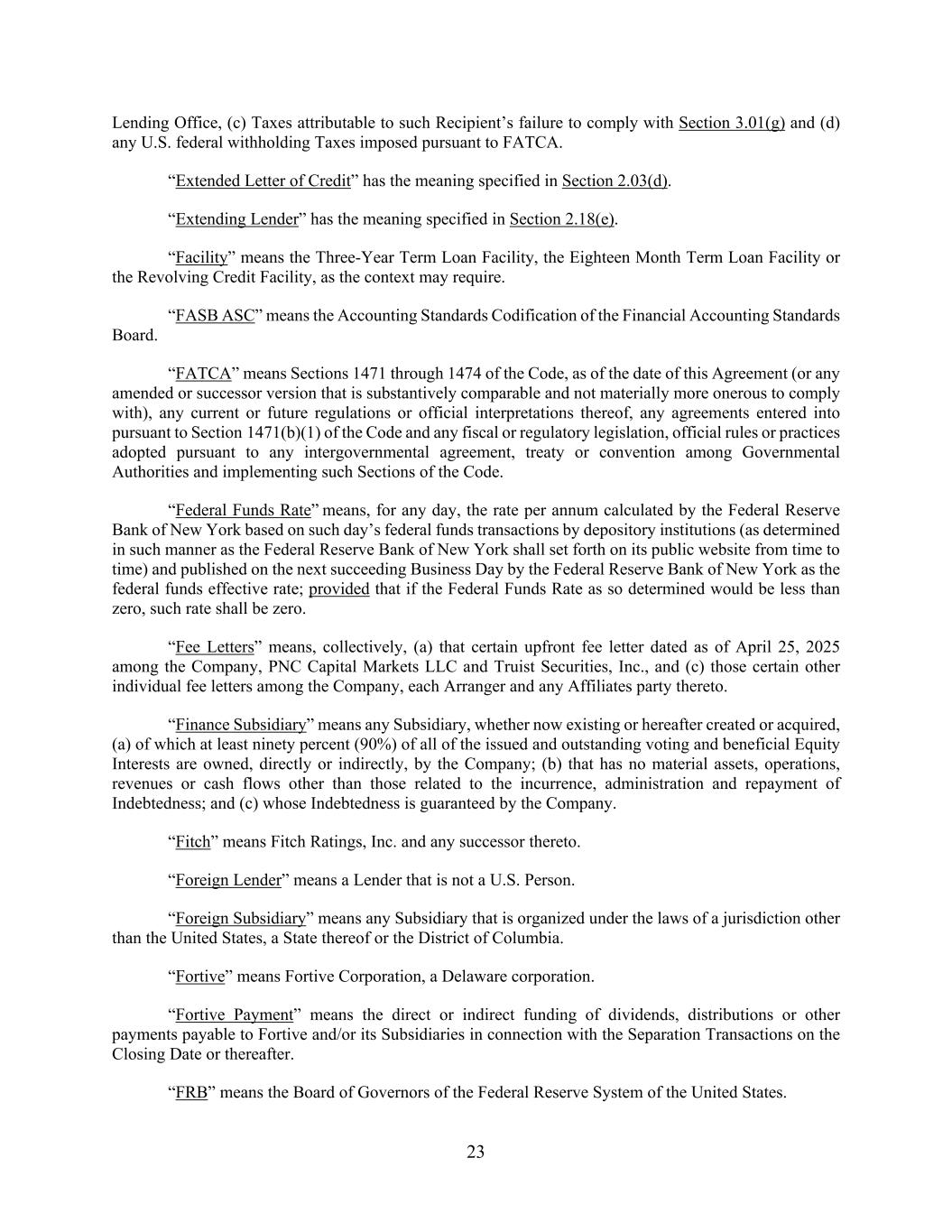 23 Lending Office, (c) Taxes attributable to such Recipient’s failure to comply with Section 3.01(g) and (d) any U.S. federal withholding Taxes imposed pursuant to FATCA. “Extended Letter of Credit” has the meaning specified in Section 2.03(d). “Extending Lender” has the meaning specified in Section 2.18(e). “Facility” means the Three-Year Term Loan Facility, the Eighteen Month Term Loan Facility or the Revolving Credit Facility, as the context may require. “FASB ASC” means the Accounting Standards Codification of the Financial Accounting Standards Board. “FATCA” means Sections 1471 through 1474 of the Code, as of the date of this Agreement (or any amended or successor version that is substantively comparable and not materially more onerous to comply with), any current or future regulations or official interpretations thereof, any agreements entered into pursuant to Section 1471(b)(1) of the Code and any fiscal or regulatory legislation, official rules or practices adopted pursuant to any intergovernmental agreement, treaty or convention among Governmental Authorities and implementing such Sections of the Code. “Federal Funds Rate” means, for any day, the rate per annum calculated by the Federal Reserve Bank of New York based on such day’s federal funds transactions by depository institutions (as determined in such manner as the Federal Reserve Bank of New York shall set forth on its public website from time to time) and published on the next succeeding Business Day by the Federal Reserve Bank of New York as the federal funds effective rate; provided that if the Federal Funds Rate as so determined would be less than zero, such rate shall be zero. “Fee Letters” means, collectively, (a) that certain upfront fee letter dated as of April 25, 2025 among the Company, PNC Capital Markets LLC and Truist Securities, Inc., and (c) those certain other individual fee letters among the Company, each Arranger and any Affiliates party thereto. “Finance Subsidiary” means any Subsidiary, whether now existing or hereafter created or acquired, (a) of which at least ninety percent (90%) of all of the issued and outstanding voting and beneficial Equity Interests are owned, directly or indirectly, by the Company; (b) that has no material assets, operations, revenues or cash flows other than those related to the incurrence, administration and repayment of Indebtedness; and (c) whose Indebtedness is guaranteed by the Company. “Fitch” means Fitch Ratings, Inc. and any successor thereto. “Foreign Lender” means a Lender that is not a U.S. Person. “Foreign Subsidiary” means any Subsidiary that is organized under the laws of a jurisdiction other than the United States, a State thereof or the District of Columbia. “Fortive” means Fortive Corporation, a Delaware corporation. “Fortive Payment” means the direct or indirect funding of dividends, distributions or other payments payable to Fortive and/or its Subsidiaries in connection with the Separation Transactions on the Closing Date or thereafter. “FRB” means the Board of Governors of the Federal Reserve System of the United States.