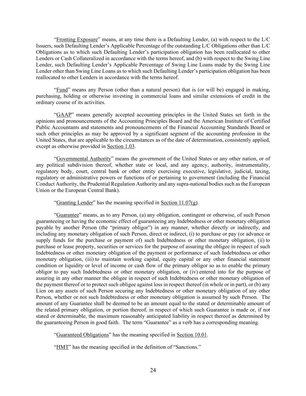 24 “Fronting Exposure” means, at any time there is a Defaulting Lender, (a) with respect to the L/C Issuers, such Defaulting Lender’s Applicable Percentage of the outstanding L/C Obligations other than L/C Obligations as to which such Defaulting Lender’s participation obligation has been reallocated to other Lenders or Cash Collateralized in accordance with the terms hereof, and (b) with respect to the Swing Line Lender, such Defaulting Lender’s Applicable Percentage of Swing Line Loans made by the Swing Line Lender other than Swing Line Loans as to which such Defaulting Lender’s participation obligation has been reallocated to other Lenders in accordance with the terms hereof. “Fund” means any Person (other than a natural person) that is (or will be) engaged in making, purchasing, holding or otherwise investing in commercial loans and similar extensions of credit in the ordinary course of its activities. “GAAP” means generally accepted accounting principles in the United States set forth in the opinions and pronouncements of the Accounting Principles Board and the American Institute of Certified Public Accountants and statements and pronouncements of the Financial Accounting Standards Board or such other principles as may be approved by a significant segment of the accounting profession in the United States, that are applicable to the circumstances as of the date of determination, consistently applied, except as otherwise provided in Section 1.03. “Governmental Authority” means the government of the United States or any other nation, or of any political subdivision thereof, whether state or local, and any agency, authority, instrumentality, regulatory body, court, central bank or other entity exercising executive, legislative, judicial, taxing, regulatory or administrative powers or functions of or pertaining to government (including the Financial Conduct Authority, the Prudential Regulation Authority and any supra-national bodies such as the European Union or the European Central Bank). “Granting Lender” has the meaning specified in Section 11.07(g). “Guarantee” means, as to any Person, (a) any obligation, contingent or otherwise, of such Person guaranteeing or having the economic effect of guaranteeing any Indebtedness or other monetary obligation payable by another Person (the “primary obligor”) in any manner, whether directly or indirectly, and including any monetary obligation of such Person, direct or indirect, (i) to purchase or pay (or advance or supply funds for the purchase or payment of) such Indebtedness or other monetary obligation, (ii) to purchase or lease property, securities or services for the purpose of assuring the obligee in respect of such Indebtedness or other monetary obligation of the payment or performance of such Indebtedness or other monetary obligation, (iii) to maintain working capital, equity capital or any other financial statement condition or liquidity or level of income or cash flow of the primary obligor so as to enable the primary obligor to pay such Indebtedness or other monetary obligation, or (iv) entered into for the purpose of assuring in any other manner the obligee in respect of such Indebtedness or other monetary obligation of the payment thereof or to protect such obligee against loss in respect thereof (in whole or in part), or (b) any Lien on any assets of such Person securing any Indebtedness or other monetary obligation of any other Person, whether or not such Indebtedness or other monetary obligation is assumed by such Person. The amount of any Guarantee shall be deemed to be an amount equal to the stated or determinable amount of the related primary obligation, or portion thereof, in respect of which such Guarantee is made or, if not stated or determinable, the maximum reasonably anticipated liability in respect thereof as determined by the guaranteeing Person in good faith. The term “Guarantee” as a verb has a corresponding meaning. “Guaranteed Obligations” has the meaning specified in Section 10.01. “HMT” has the meaning specified in the definition of “Sanctions.”