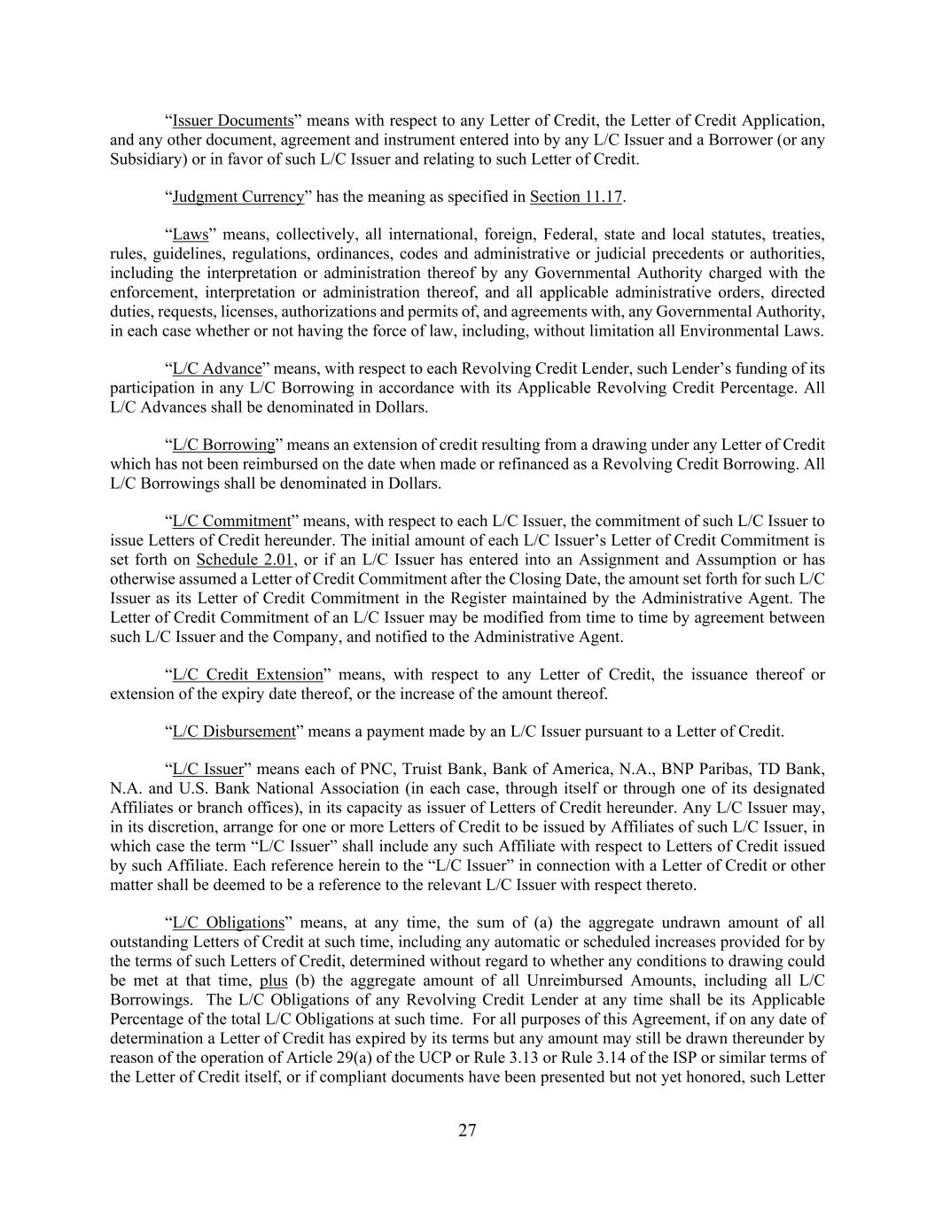 27 “Issuer Documents” means with respect to any Letter of Credit, the Letter of Credit Application, and any other document, agreement and instrument entered into by any L/C Issuer and a Borrower (or any Subsidiary) or in favor of such L/C Issuer and relating to such Letter of Credit. “Judgment Currency” has the meaning as specified in Section 11.17. “Laws” means, collectively, all international, foreign, Federal, state and local statutes, treaties, rules, guidelines, regulations, ordinances, codes and administrative or judicial precedents or authorities, including the interpretation or administration thereof by any Governmental Authority charged with the enforcement, interpretation or administration thereof, and all applicable administrative orders, directed duties, requests, licenses, authorizations and permits of, and agreements with, any Governmental Authority, in each case whether or not having the force of law, including, without limitation all Environmental Laws. “L/C Advance” means, with respect to each Revolving Credit Lender, such Lender’s funding of its participation in any L/C Borrowing in accordance with its Applicable Revolving Credit Percentage. All L/C Advances shall be denominated in Dollars. “L/C Borrowing” means an extension of credit resulting from a drawing under any Letter of Credit which has not been reimbursed on the date when made or refinanced as a Revolving Credit Borrowing. All L/C Borrowings shall be denominated in Dollars. “L/C Commitment” means, with respect to each L/C Issuer, the commitment of such L/C Issuer to issue Letters of Credit hereunder. The initial amount of each L/C Issuer’s Letter of Credit Commitment is set forth on Schedule 2.01, or if an L/C Issuer has entered into an Assignment and Assumption or has otherwise assumed a Letter of Credit Commitment after the Closing Date, the amount set forth for such L/C Issuer as its Letter of Credit Commitment in the Register maintained by the Administrative Agent. The Letter of Credit Commitment of an L/C Issuer may be modified from time to time by agreement between such L/C Issuer and the Company, and notified to the Administrative Agent. “L/C Credit Extension” means, with respect to any Letter of Credit, the issuance thereof or extension of the expiry date thereof, or the increase of the amount thereof. “L/C Disbursement” means a payment made by an L/C Issuer pursuant to a Letter of Credit. “L/C Issuer” means each of PNC, Truist Bank, Bank of America, N.A., BNP Paribas, TD Bank, N.A. and U.S. Bank National Association (in each case, through itself or through one of its designated Affiliates or branch offices), in its capacity as issuer of Letters of Credit hereunder. Any L/C Issuer may, in its discretion, arrange for one or more Letters of Credit to be issued by Affiliates of such L/C Issuer, in which case the term “L/C Issuer” shall include any such Affiliate with respect to Letters of Credit issued by such Affiliate. Each reference herein to the “L/C Issuer” in connection with a Letter of Credit or other matter shall be deemed to be a reference to the relevant L/C Issuer with respect thereto. “L/C Obligations” means, at any time, the sum of (a) the aggregate undrawn amount of all outstanding Letters of Credit at such time, including any automatic or scheduled increases provided for by the terms of such Letters of Credit, determined without regard to whether any conditions to drawing could be met at that time, plus (b) the aggregate amount of all Unreimbursed Amounts, including all L/C Borrowings. The L/C Obligations of any Revolving Credit Lender at any time shall be its Applicable Percentage of the total L/C Obligations at such time. For all purposes of this Agreement, if on any date of determination a Letter of Credit has expired by its terms but any amount may still be drawn thereunder by reason of the operation of Article 29(a) of the UCP or Rule 3.13 or Rule 3.14 of the ISP or similar terms of the Letter of Credit itself, or if compliant documents have been presented but not yet honored, such Letter