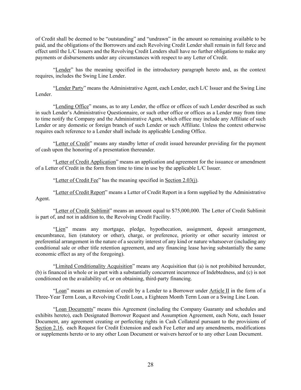 28 of Credit shall be deemed to be “outstanding” and “undrawn” in the amount so remaining available to be paid, and the obligations of the Borrowers and each Revolving Credit Lender shall remain in full force and effect until the L/C Issuers and the Revolving Credit Lenders shall have no further obligations to make any payments or disbursements under any circumstances with respect to any Letter of Credit. “Lender” has the meaning specified in the introductory paragraph hereto and, as the context requires, includes the Swing Line Lender. “Lender Party” means the Administrative Agent, each Lender, each L/C Issuer and the Swing Line Lender. “Lending Office” means, as to any Lender, the office or offices of such Lender described as such in such Lender’s Administrative Questionnaire, or such other office or offices as a Lender may from time to time notify the Company and the Administrative Agent, which office may include any Affiliate of such Lender or any domestic or foreign branch of such Lender or such Affiliate. Unless the context otherwise requires each reference to a Lender shall include its applicable Lending Office. “Letter of Credit” means any standby letter of credit issued hereunder providing for the payment of cash upon the honoring of a presentation thereunder. “Letter of Credit Application” means an application and agreement for the issuance or amendment of a Letter of Credit in the form from time to time in use by the applicable L/C Issuer. “Letter of Credit Fee” has the meaning specified in Section 2.03(j). “Letter of Credit Report” means a Letter of Credit Report in a form supplied by the Administrative Agent. “Letter of Credit Sublimit” means an amount equal to $75,000,000. The Letter of Credit Sublimit is part of, and not in addition to, the Revolving Credit Facility. “Lien” means any mortgage, pledge, hypothecation, assignment, deposit arrangement, encumbrance, lien (statutory or other), charge, or preference, priority or other security interest or preferential arrangement in the nature of a security interest of any kind or nature whatsoever (including any conditional sale or other title retention agreement, and any financing lease having substantially the same economic effect as any of the foregoing). “Limited Conditionality Acquisition” means any Acquisition that (a) is not prohibited hereunder, (b) is financed in whole or in part with a substantially concurrent incurrence of Indebtedness, and (c) is not conditioned on the availability of, or on obtaining, third-party financing. “Loan” means an extension of credit by a Lender to a Borrower under Article II in the form of a Three-Year Term Loan, a Revolving Credit Loan, a Eighteen Month Term Loan or a Swing Line Loan. “Loan Documents” means this Agreement (including the Company Guaranty and schedules and exhibits hereto), each Designated Borrower Request and Assumption Agreement, each Note, each Issuer Document, any agreement creating or perfecting rights in Cash Collateral pursuant to the provisions of Section 2.16, each Request for Credit Extension and each Fee Letter and any amendments, modifications or supplements hereto or to any other Loan Document or waivers hereof or to any other Loan Document.