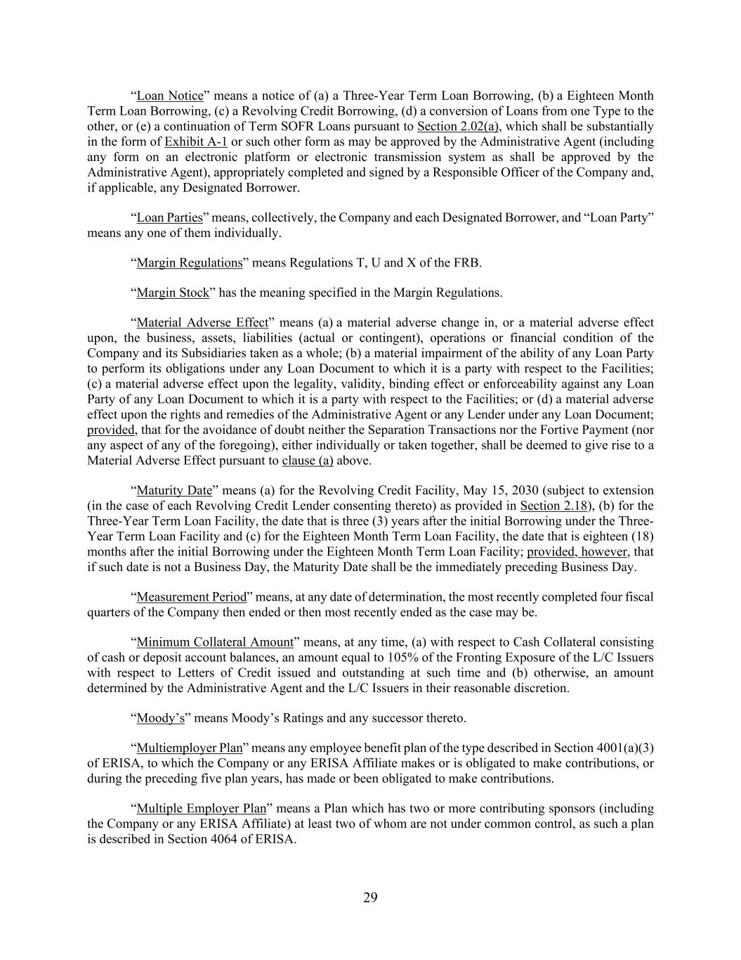 29 “Loan Notice” means a notice of (a) a Three-Year Term Loan Borrowing, (b) a Eighteen Month Term Loan Borrowing, (c) a Revolving Credit Borrowing, (d) a conversion of Loans from one Type to the other, or (e) a continuation of Term SOFR Loans pursuant to Section 2.02(a), which shall be substantially in the form of Exhibit A-1 or such other form as may be approved by the Administrative Agent (including any form on an electronic platform or electronic transmission system as shall be approved by the Administrative Agent), appropriately completed and signed by a Responsible Officer of the Company and, if applicable, any Designated Borrower. “Loan Parties” means, collectively, the Company and each Designated Borrower, and “Loan Party” means any one of them individually. “Margin Regulations” means Regulations T, U and X of the FRB. “Margin Stock” has the meaning specified in the Margin Regulations. “Material Adverse Effect” means (a) a material adverse change in, or a material adverse effect upon, the business, assets, liabilities (actual or contingent), operations or financial condition of the Company and its Subsidiaries taken as a whole; (b) a material impairment of the ability of any Loan Party to perform its obligations under any Loan Document to which it is a party with respect to the Facilities; (c) a material adverse effect upon the legality, validity, binding effect or enforceability against any Loan Party of any Loan Document to which it is a party with respect to the Facilities; or (d) a material adverse effect upon the rights and remedies of the Administrative Agent or any Lender under any Loan Document; provided, that for the avoidance of doubt neither the Separation Transactions nor the Fortive Payment (nor any aspect of any of the foregoing), either individually or taken together, shall be deemed to give rise to a Material Adverse Effect pursuant to clause (a) above. “Maturity Date” means (a) for the Revolving Credit Facility, May 15, 2030 (subject to extension (in the case of each Revolving Credit Lender consenting thereto) as provided in Section 2.18), (b) for the Three-Year Term Loan Facility, the date that is three (3) years after the initial Borrowing under the Three- Year Term Loan Facility and (c) for the Eighteen Month Term Loan Facility, the date that is eighteen (18) months after the initial Borrowing under the Eighteen Month Term Loan Facility; provided, however, that if such date is not a Business Day, the Maturity Date shall be the immediately preceding Business Day. “Measurement Period” means, at any date of determination, the most recently completed four fiscal quarters of the Company then ended or then most recently ended as the case may be. “Minimum Collateral Amount” means, at any time, (a) with respect to Cash Collateral consisting of cash or deposit account balances, an amount equal to 105% of the Fronting Exposure of the L/C Issuers with respect to Letters of Credit issued and outstanding at such time and (b) otherwise, an amount determined by the Administrative Agent and the L/C Issuers in their reasonable discretion. “Moody’s” means Moody’s Ratings and any successor thereto. “Multiemployer Plan” means any employee benefit plan of the type described in Section 4001(a)(3) of ERISA, to which the Company or any ERISA Affiliate makes or is obligated to make contributions, or during the preceding five plan years, has made or been obligated to make contributions. “Multiple Employer Plan” means a Plan which has two or more contributing sponsors (including the Company or any ERISA Affiliate) at least two of whom are not under common control, as such a plan is described in Section 4064 of ERISA.