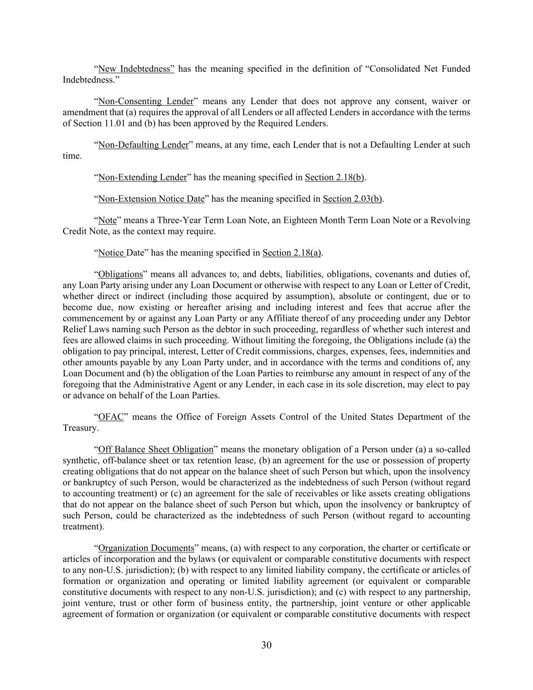 30 “New Indebtedness” has the meaning specified in the definition of “Consolidated Net Funded Indebtedness.” “Non-Consenting Lender” means any Lender that does not approve any consent, waiver or amendment that (a) requires the approval of all Lenders or all affected Lenders in accordance with the terms of Section 11.01 and (b) has been approved by the Required Lenders. “Non-Defaulting Lender” means, at any time, each Lender that is not a Defaulting Lender at such time. “Non-Extending Lender” has the meaning specified in Section 2.18(b). “Non-Extension Notice Date” has the meaning specified in Section 2.03(b). “Note” means a Three-Year Term Loan Note, an Eighteen Month Term Loan Note or a Revolving Credit Note, as the context may require. “Notice Date” has the meaning specified in Section 2.18(a). “Obligations” means all advances to, and debts, liabilities, obligations, covenants and duties of, any Loan Party arising under any Loan Document or otherwise with respect to any Loan or Letter of Credit, whether direct or indirect (including those acquired by assumption), absolute or contingent, due or to become due, now existing or hereafter arising and including interest and fees that accrue after the commencement by or against any Loan Party or any Affiliate thereof of any proceeding under any Debtor Relief Laws naming such Person as the debtor in such proceeding, regardless of whether such interest and fees are allowed claims in such proceeding. Without limiting the foregoing, the Obligations include (a) the obligation to pay principal, interest, Letter of Credit commissions, charges, expenses, fees, indemnities and other amounts payable by any Loan Party under, and in accordance with the terms and conditions of, any Loan Document and (b) the obligation of the Loan Parties to reimburse any amount in respect of any of the foregoing that the Administrative Agent or any Lender, in each case in its sole discretion, may elect to pay or advance on behalf of the Loan Parties. “OFAC” means the Office of Foreign Assets Control of the United States Department of the Treasury. “Off Balance Sheet Obligation” means the monetary obligation of a Person under (a) a so-called synthetic, off-balance sheet or tax retention lease, (b) an agreement for the use or possession of property creating obligations that do not appear on the balance sheet of such Person but which, upon the insolvency or bankruptcy of such Person, would be characterized as the indebtedness of such Person (without regard to accounting treatment) or (c) an agreement for the sale of receivables or like assets creating obligations that do not appear on the balance sheet of such Person but which, upon the insolvency or bankruptcy of such Person, could be characterized as the indebtedness of such Person (without regard to accounting treatment). “Organization Documents” means, (a) with respect to any corporation, the charter or certificate or articles of incorporation and the bylaws (or equivalent or comparable constitutive documents with respect to any non-U.S. jurisdiction); (b) with respect to any limited liability company, the certificate or articles of formation or organization and operating or limited liability agreement (or equivalent or comparable constitutive documents with respect to any non-U.S. jurisdiction); and (c) with respect to any partnership, joint venture, trust or other form of business entity, the partnership, joint venture or other applicable agreement of formation or organization (or equivalent or comparable constitutive documents with respect