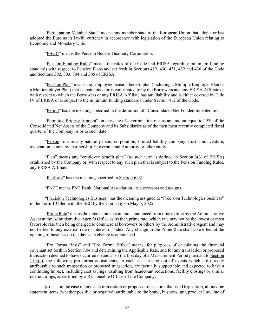 32 “Participating Member State” means any member state of the European Union that adopts or has adopted the Euro as its lawful currency in accordance with legislation of the European Union relating to Economic and Monetary Union. “PBGC” means the Pension Benefit Guaranty Corporation. “Pension Funding Rules” means the rules of the Code and ERISA regarding minimum funding standards with respect to Pension Plans and set forth in Sections 412, 430, 431, 432 and 436 of the Code and Sections 302, 303, 304 and 305 of ERISA. “Pension Plan” means any employee pension benefit plan (including a Multiple Employer Plan or a Multiemployer Plan) that is maintained or is contributed to by the Borrowers and any ERISA Affiliate or with respect to which the Borrowers or any ERISA Affiliate has any liability and is either covered by Title IV of ERISA or is subject to the minimum funding standards under Section 412 of the Code. “Period” has the meaning specified in the definition of “Consolidated Net Funded Indebtedness.” “Permitted Priority Amount” on any date of determination means an amount equal to 15% of the Consolidated Net Assets of the Company and its Subsidiaries as of the then most recently completed fiscal quarter of the Company prior to such date. “Person” means any natural person, corporation, limited liability company, trust, joint venture, association, company, partnership, Governmental Authority or other entity. “Plan” means any “employee benefit plan” (as such term is defined in Section 3(3) of ERISA) established by the Company or, with respect to any such plan that is subject to the Pension Funding Rules, any ERISA Affiliate. “Platform” has the meaning specified in Section 6.02. “PNC” means PNC Bank, National Association, its successors and assigns. “Precision Technologies Business” has the meaning assigned to “Precision Technologies business” in the Form 10 filed with the SEC by the Company on May 5, 2025. “Prime Rate” means the interest rate per annum announced from time to time by the Administrative Agent at the Administrative Agent’s Office as its then prime rate, which rate may not be the lowest or most favorable rate then being charged to commercial borrowers or others by the Administrative Agent and may not be tied to any external rate of interest or index. Any change in the Prime Rate shall take effect at the opening of business on the day such change is announced. “Pro Forma Basis” and “Pro Forma Effect” means, for purposes of calculating the financial covenant set forth in Section 7.04 and determining the Applicable Rate, and for any transaction or proposed transaction deemed to have occurred on and as of the first day of a Measurement Period pursuant to Section 1.03(c), the following pro forma adjustments, in each case arising out of events which are directly attributable to such transaction or proposed transaction, are factually supportable and expected to have a continuing impact, including cost savings resulting from headcount reductions, facility closings or similar restructurings, as certified by a Responsible Officer of the Company: (a) in the case of any such transaction or proposed transaction that is a Disposition, all income statement items (whether positive or negative) attributable to the brand, business unit, product line, line of