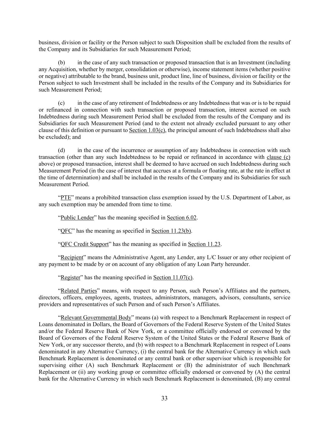 33 business, division or facility or the Person subject to such Disposition shall be excluded from the results of the Company and its Subsidiaries for such Measurement Period; (b) in the case of any such transaction or proposed transaction that is an Investment (including any Acquisition, whether by merger, consolidation or otherwise), income statement items (whether positive or negative) attributable to the brand, business unit, product line, line of business, division or facility or the Person subject to such Investment shall be included in the results of the Company and its Subsidiaries for such Measurement Period; (c) in the case of any retirement of Indebtedness or any Indebtedness that was or is to be repaid or refinanced in connection with such transaction or proposed transaction, interest accrued on such Indebtedness during such Measurement Period shall be excluded from the results of the Company and its Subsidiaries for such Measurement Period (and to the extent not already excluded pursuant to any other clause of this definition or pursuant to Section 1.03(c), the principal amount of such Indebtedness shall also be excluded); and (d) in the case of the incurrence or assumption of any Indebtedness in connection with such transaction (other than any such Indebtedness to be repaid or refinanced in accordance with clause (c) above) or proposed transaction, interest shall be deemed to have accrued on such Indebtedness during such Measurement Period (in the case of interest that accrues at a formula or floating rate, at the rate in effect at the time of determination) and shall be included in the results of the Company and its Subsidiaries for such Measurement Period. “PTE” means a prohibited transaction class exemption issued by the U.S. Department of Labor, as any such exemption may be amended from time to time. “Public Lender” has the meaning specified in Section 6.02. “QFC” has the meaning as specified in Section 11.23(b). “QFC Credit Support” has the meaning as specified in Section 11.23. “Recipient” means the Administrative Agent, any Lender, any L/C Issuer or any other recipient of any payment to be made by or on account of any obligation of any Loan Party hereunder. “Register” has the meaning specified in Section 11.07(c). “Related Parties” means, with respect to any Person, such Person’s Affiliates and the partners, directors, officers, employees, agents, trustees, administrators, managers, advisors, consultants, service providers and representatives of such Person and of such Person’s Affiliates. “Relevant Governmental Body” means (a) with respect to a Benchmark Replacement in respect of Loans denominated in Dollars, the Board of Governors of the Federal Reserve System of the United States and/or the Federal Reserve Bank of New York, or a committee officially endorsed or convened by the Board of Governors of the Federal Reserve System of the United States or the Federal Reserve Bank of New York, or any successor thereto, and (b) with respect to a Benchmark Replacement in respect of Loans denominated in any Alternative Currency, (i) the central bank for the Alternative Currency in which such Benchmark Replacement is denominated or any central bank or other supervisor which is responsible for supervising either (A) such Benchmark Replacement or (B) the administrator of such Benchmark Replacement or (ii) any working group or committee officially endorsed or convened by (A) the central bank for the Alternative Currency in which such Benchmark Replacement is denominated, (B) any central