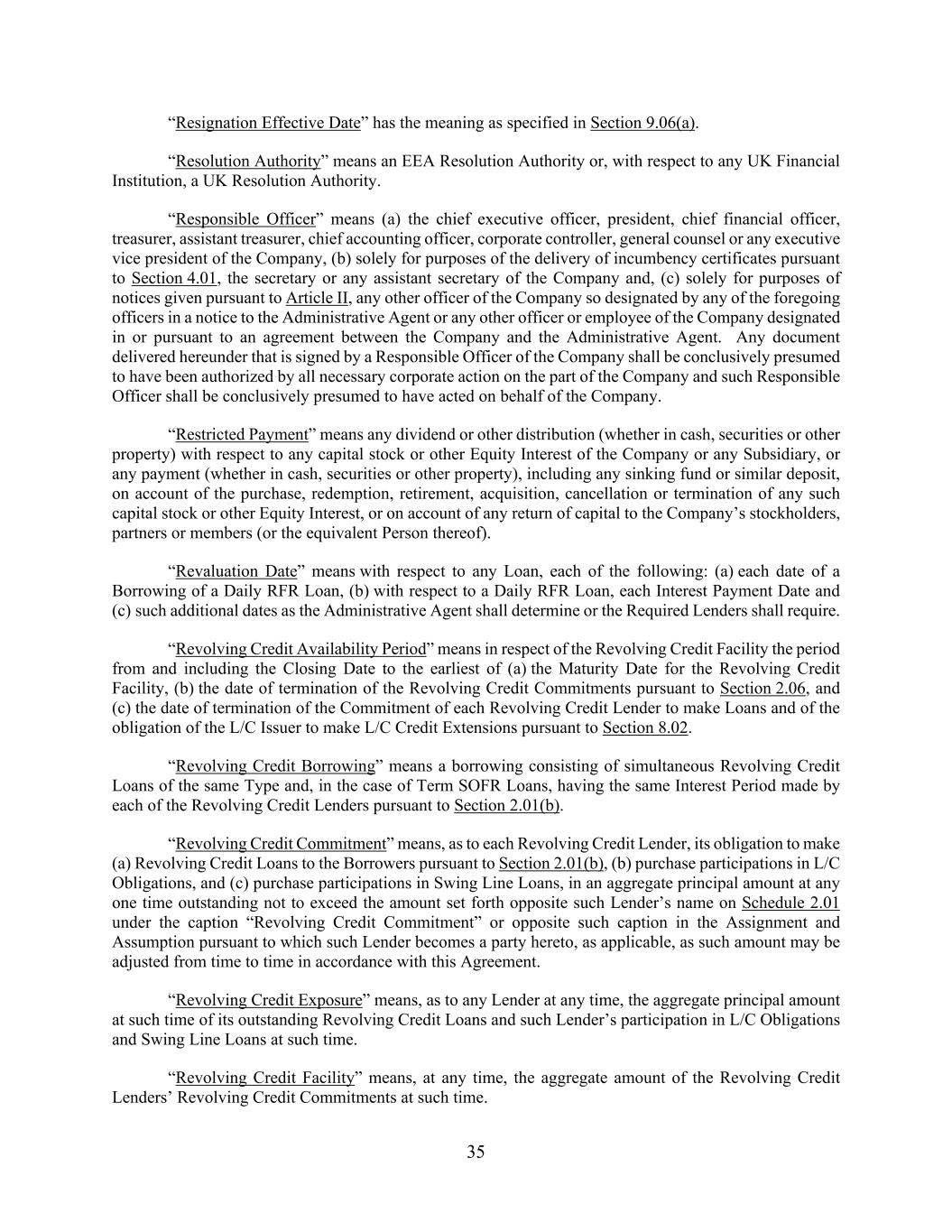 35 “Resignation Effective Date” has the meaning as specified in Section 9.06(a). “Resolution Authority” means an EEA Resolution Authority or, with respect to any UK Financial Institution, a UK Resolution Authority. “Responsible Officer” means (a) the chief executive officer, president, chief financial officer, treasurer, assistant treasurer, chief accounting officer, corporate controller, general counsel or any executive vice president of the Company, (b) solely for purposes of the delivery of incumbency certificates pursuant to Section 4.01, the secretary or any assistant secretary of the Company and, (c) solely for purposes of notices given pursuant to Article II, any other officer of the Company so designated by any of the foregoing officers in a notice to the Administrative Agent or any other officer or employee of the Company designated in or pursuant to an agreement between the Company and the Administrative Agent. Any document delivered hereunder that is signed by a Responsible Officer of the Company shall be conclusively presumed to have been authorized by all necessary corporate action on the part of the Company and such Responsible Officer shall be conclusively presumed to have acted on behalf of the Company. “Restricted Payment” means any dividend or other distribution (whether in cash, securities or other property) with respect to any capital stock or other Equity Interest of the Company or any Subsidiary, or any payment (whether in cash, securities or other property), including any sinking fund or similar deposit, on account of the purchase, redemption, retirement, acquisition, cancellation or termination of any such capital stock or other Equity Interest, or on account of any return of capital to the Company’s stockholders, partners or members (or the equivalent Person thereof). “Revaluation Date” means with respect to any Loan, each of the following: (a) each date of a Borrowing of a Daily RFR Loan, (b) with respect to a Daily RFR Loan, each Interest Payment Date and (c) such additional dates as the Administrative Agent shall determine or the Required Lenders shall require. “Revolving Credit Availability Period” means in respect of the Revolving Credit Facility the period from and including the Closing Date to the earliest of (a) the Maturity Date for the Revolving Credit Facility, (b) the date of termination of the Revolving Credit Commitments pursuant to Section 2.06, and (c) the date of termination of the Commitment of each Revolving Credit Lender to make Loans and of the obligation of the L/C Issuer to make L/C Credit Extensions pursuant to Section 8.02. “Revolving Credit Borrowing” means a borrowing consisting of simultaneous Revolving Credit Loans of the same Type and, in the case of Term SOFR Loans, having the same Interest Period made by each of the Revolving Credit Lenders pursuant to Section 2.01(b). “Revolving Credit Commitment” means, as to each Revolving Credit Lender, its obligation to make (a) Revolving Credit Loans to the Borrowers pursuant to Section 2.01(b), (b) purchase participations in L/C Obligations, and (c) purchase participations in Swing Line Loans, in an aggregate principal amount at any one time outstanding not to exceed the amount set forth opposite such Lender’s name on Schedule 2.01 under the caption “Revolving Credit Commitment” or opposite such caption in the Assignment and Assumption pursuant to which such Lender becomes a party hereto, as applicable, as such amount may be adjusted from time to time in accordance with this Agreement. “Revolving Credit Exposure” means, as to any Lender at any time, the aggregate principal amount at such time of its outstanding Revolving Credit Loans and such Lender’s participation in L/C Obligations and Swing Line Loans at such time. “Revolving Credit Facility” means, at any time, the aggregate amount of the Revolving Credit Lenders’ Revolving Credit Commitments at such time.