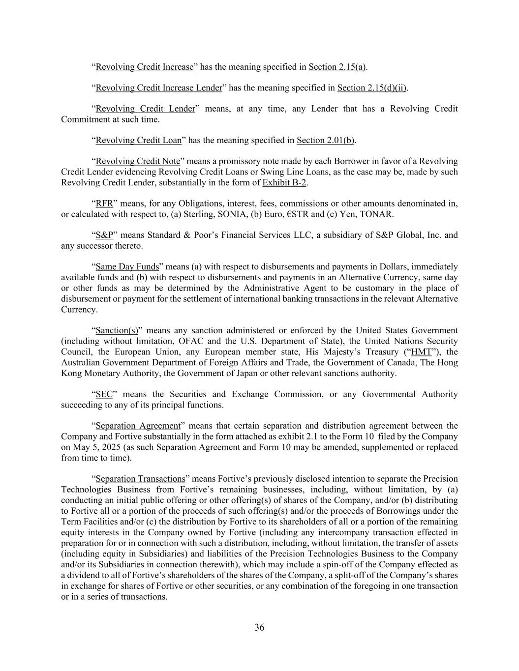 36 “Revolving Credit Increase” has the meaning specified in Section 2.15(a). “Revolving Credit Increase Lender” has the meaning specified in Section 2.15(d)(ii). “Revolving Credit Lender” means, at any time, any Lender that has a Revolving Credit Commitment at such time. “Revolving Credit Loan” has the meaning specified in Section 2.01(b). “Revolving Credit Note” means a promissory note made by each Borrower in favor of a Revolving Credit Lender evidencing Revolving Credit Loans or Swing Line Loans, as the case may be, made by such Revolving Credit Lender, substantially in the form of Exhibit B-2. “RFR” means, for any Obligations, interest, fees, commissions or other amounts denominated in, or calculated with respect to, (a) Sterling, SONIA, (b) Euro, €STR and (c) Yen, TONAR. “S&P” means Standard & Poor’s Financial Services LLC, a subsidiary of S&P Global, Inc. and any successor thereto. “Same Day Funds” means (a) with respect to disbursements and payments in Dollars, immediately available funds and (b) with respect to disbursements and payments in an Alternative Currency, same day or other funds as may be determined by the Administrative Agent to be customary in the place of disbursement or payment for the settlement of international banking transactions in the relevant Alternative Currency. “Sanction(s)” means any sanction administered or enforced by the United States Government (including without limitation, OFAC and the U.S. Department of State), the United Nations Security Council, the European Union, any European member state, His Majesty’s Treasury (“HMT”), the Australian Government Department of Foreign Affairs and Trade, the Government of Canada, The Hong Kong Monetary Authority, the Government of Japan or other relevant sanctions authority. “SEC” means the Securities and Exchange Commission, or any Governmental Authority succeeding to any of its principal functions. “Separation Agreement” means that certain separation and distribution agreement between the Company and Fortive substantially in the form attached as exhibit 2.1 to the Form 10 filed by the Company on May 5, 2025 (as such Separation Agreement and Form 10 may be amended, supplemented or replaced from time to time). “Separation Transactions” means Fortive’s previously disclosed intention to separate the Precision Technologies Business from Fortive’s remaining businesses, including, without limitation, by (a) conducting an initial public offering or other offering(s) of shares of the Company, and/or (b) distributing to Fortive all or a portion of the proceeds of such offering(s) and/or the proceeds of Borrowings under the Term Facilities and/or (c) the distribution by Fortive to its shareholders of all or a portion of the remaining equity interests in the Company owned by Fortive (including any intercompany transaction effected in preparation for or in connection with such a distribution, including, without limitation, the transfer of assets (including equity in Subsidiaries) and liabilities of the Precision Technologies Business to the Company and/or its Subsidiaries in connection therewith), which may include a spin-off of the Company effected as a dividend to all of Fortive’s shareholders of the shares of the Company, a split-off of the Company’s shares in exchange for shares of Fortive or other securities, or any combination of the foregoing in one transaction or in a series of transactions.