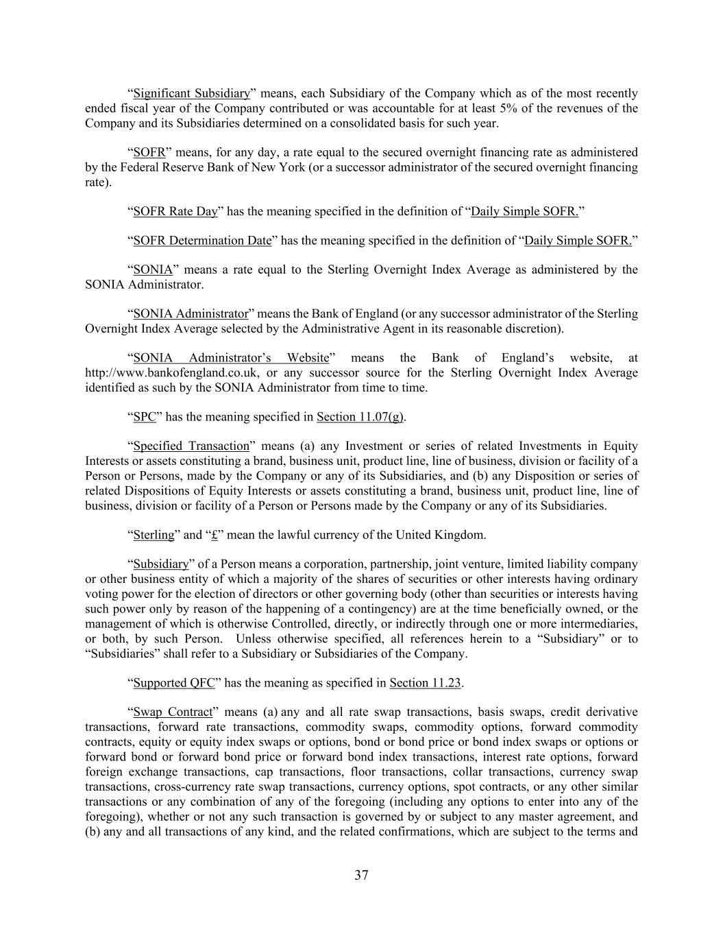 37 “Significant Subsidiary” means, each Subsidiary of the Company which as of the most recently ended fiscal year of the Company contributed or was accountable for at least 5% of the revenues of the Company and its Subsidiaries determined on a consolidated basis for such year. “SOFR” means, for any day, a rate equal to the secured overnight financing rate as administered by the Federal Reserve Bank of New York (or a successor administrator of the secured overnight financing rate). “SOFR Rate Day” has the meaning specified in the definition of “Daily Simple SOFR.” “SOFR Determination Date” has the meaning specified in the definition of “Daily Simple SOFR.” “SONIA” means a rate equal to the Sterling Overnight Index Average as administered by the SONIA Administrator. “SONIA Administrator” means the Bank of England (or any successor administrator of the Sterling Overnight Index Average selected by the Administrative Agent in its reasonable discretion). “SONIA Administrator’s Website” means the Bank of England’s website, at http://www.bankofengland.co.uk, or any successor source for the Sterling Overnight Index Average identified as such by the SONIA Administrator from time to time. “SPC” has the meaning specified in Section 11.07(g). “Specified Transaction” means (a) any Investment or series of related Investments in Equity Interests or assets constituting a brand, business unit, product line, line of business, division or facility of a Person or Persons, made by the Company or any of its Subsidiaries, and (b) any Disposition or series of related Dispositions of Equity Interests or assets constituting a brand, business unit, product line, line of business, division or facility of a Person or Persons made by the Company or any of its Subsidiaries. “Sterling” and “£” mean the lawful currency of the United Kingdom. “Subsidiary” of a Person means a corporation, partnership, joint venture, limited liability company or other business entity of which a majority of the shares of securities or other interests having ordinary voting power for the election of directors or other governing body (other than securities or interests having such power only by reason of the happening of a contingency) are at the time beneficially owned, or the management of which is otherwise Controlled, directly, or indirectly through one or more intermediaries, or both, by such Person. Unless otherwise specified, all references herein to a “Subsidiary” or to “Subsidiaries” shall refer to a Subsidiary or Subsidiaries of the Company. “Supported QFC” has the meaning as specified in Section 11.23. “Swap Contract” means (a) any and all rate swap transactions, basis swaps, credit derivative transactions, forward rate transactions, commodity swaps, commodity options, forward commodity contracts, equity or equity index swaps or options, bond or bond price or bond index swaps or options or forward bond or forward bond price or forward bond index transactions, interest rate options, forward foreign exchange transactions, cap transactions, floor transactions, collar transactions, currency swap transactions, cross-currency rate swap transactions, currency options, spot contracts, or any other similar transactions or any combination of any of the foregoing (including any options to enter into any of the foregoing), whether or not any such transaction is governed by or subject to any master agreement, and (b) any and all transactions of any kind, and the related confirmations, which are subject to the terms and