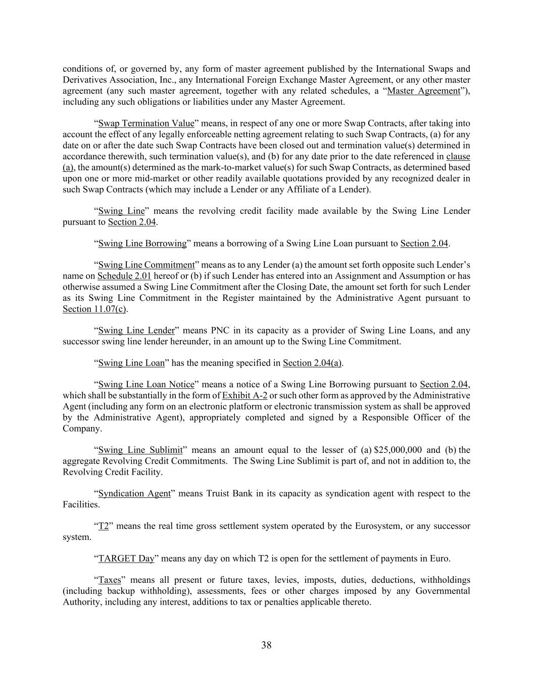 38 conditions of, or governed by, any form of master agreement published by the International Swaps and Derivatives Association, Inc., any International Foreign Exchange Master Agreement, or any other master agreement (any such master agreement, together with any related schedules, a “Master Agreement”), including any such obligations or liabilities under any Master Agreement. “Swap Termination Value” means, in respect of any one or more Swap Contracts, after taking into account the effect of any legally enforceable netting agreement relating to such Swap Contracts, (a) for any date on or after the date such Swap Contracts have been closed out and termination value(s) determined in accordance therewith, such termination value(s), and (b) for any date prior to the date referenced in clause (a), the amount(s) determined as the mark-to-market value(s) for such Swap Contracts, as determined based upon one or more mid-market or other readily available quotations provided by any recognized dealer in such Swap Contracts (which may include a Lender or any Affiliate of a Lender). “Swing Line” means the revolving credit facility made available by the Swing Line Lender pursuant to Section 2.04. “Swing Line Borrowing” means a borrowing of a Swing Line Loan pursuant to Section 2.04. “Swing Line Commitment” means as to any Lender (a) the amount set forth opposite such Lender’s name on Schedule 2.01 hereof or (b) if such Lender has entered into an Assignment and Assumption or has otherwise assumed a Swing Line Commitment after the Closing Date, the amount set forth for such Lender as its Swing Line Commitment in the Register maintained by the Administrative Agent pursuant to Section 11.07(c). “Swing Line Lender” means PNC in its capacity as a provider of Swing Line Loans, and any successor swing line lender hereunder, in an amount up to the Swing Line Commitment. “Swing Line Loan” has the meaning specified in Section 2.04(a). “Swing Line Loan Notice” means a notice of a Swing Line Borrowing pursuant to Section 2.04, which shall be substantially in the form of Exhibit A-2 or such other form as approved by the Administrative Agent (including any form on an electronic platform or electronic transmission system as shall be approved by the Administrative Agent), appropriately completed and signed by a Responsible Officer of the Company. “Swing Line Sublimit” means an amount equal to the lesser of (a) $25,000,000 and (b) the aggregate Revolving Credit Commitments. The Swing Line Sublimit is part of, and not in addition to, the Revolving Credit Facility. “Syndication Agent” means Truist Bank in its capacity as syndication agent with respect to the Facilities. “T2” means the real time gross settlement system operated by the Eurosystem, or any successor system. “TARGET Day” means any day on which T2 is open for the settlement of payments in Euro. “Taxes” means all present or future taxes, levies, imposts, duties, deductions, withholdings (including backup withholding), assessments, fees or other charges imposed by any Governmental Authority, including any interest, additions to tax or penalties applicable thereto.