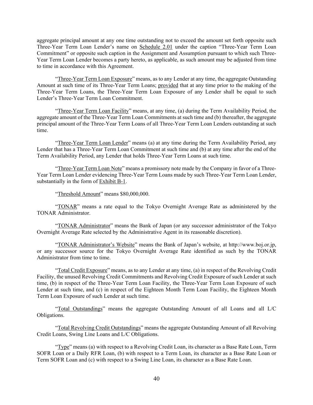 40 aggregate principal amount at any one time outstanding not to exceed the amount set forth opposite such Three-Year Term Loan Lender’s name on Schedule 2.01 under the caption “Three-Year Term Loan Commitment” or opposite such caption in the Assignment and Assumption pursuant to which such Three- Year Term Loan Lender becomes a party hereto, as applicable, as such amount may be adjusted from time to time in accordance with this Agreement. “Three-Year Term Loan Exposure” means, as to any Lender at any time, the aggregate Outstanding Amount at such time of its Three-Year Term Loans; provided that at any time prior to the making of the Three-Year Term Loans, the Three-Year Term Loan Exposure of any Lender shall be equal to such Lender’s Three-Year Term Loan Commitment. “Three-Year Term Loan Facility” means, at any time, (a) during the Term Availability Period, the aggregate amount of the Three-Year Term Loan Commitments at such time and (b) thereafter, the aggregate principal amount of the Three-Year Term Loans of all Three-Year Term Loan Lenders outstanding at such time. “Three-Year Term Loan Lender” means (a) at any time during the Term Availability Period, any Lender that has a Three-Year Term Loan Commitment at such time and (b) at any time after the end of the Term Availability Period, any Lender that holds Three-Year Term Loans at such time. “Three-Year Term Loan Note” means a promissory note made by the Company in favor of a Three- Year Term Loan Lender evidencing Three-Year Term Loans made by such Three-Year Term Loan Lender, substantially in the form of Exhibit B-1. “Threshold Amount” means $80,000,000. “TONAR” means a rate equal to the Tokyo Overnight Average Rate as administered by the TONAR Administrator. “TONAR Administrator” means the Bank of Japan (or any successor administrator of the Tokyo Overnight Average Rate selected by the Administrative Agent in its reasonable discretion). “TONAR Administrator’s Website” means the Bank of Japan’s website, at http://www.boj.or.jp, or any successor source for the Tokyo Overnight Average Rate identified as such by the TONAR Administrator from time to time. “Total Credit Exposure” means, as to any Lender at any time, (a) in respect of the Revolving Credit Facility, the unused Revolving Credit Commitments and Revolving Credit Exposure of such Lender at such time, (b) in respect of the Three-Year Term Loan Facility, the Three-Year Term Loan Exposure of such Lender at such time, and (c) in respect of the Eighteen Month Term Loan Facility, the Eighteen Month Term Loan Exposure of such Lender at such time. “Total Outstandings” means the aggregate Outstanding Amount of all Loans and all L/C Obligations. “Total Revolving Credit Outstandings” means the aggregate Outstanding Amount of all Revolving Credit Loans, Swing Line Loans and L/C Obligations. “Type” means (a) with respect to a Revolving Credit Loan, its character as a Base Rate Loan, Term SOFR Loan or a Daily RFR Loan, (b) with respect to a Term Loan, its character as a Base Rate Loan or Term SOFR Loan and (c) with respect to a Swing Line Loan, its character as a Base Rate Loan.