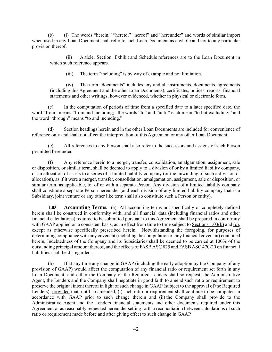 42 (b) (i) The words “herein,” “hereto,” “hereof” and “hereunder” and words of similar import when used in any Loan Document shall refer to such Loan Document as a whole and not to any particular provision thereof. (ii) Article, Section, Exhibit and Schedule references are to the Loan Document in which such reference appears. (iii) The term “including” is by way of example and not limitation. (iv) The term “documents” includes any and all instruments, documents, agreements (including this Agreement and the other Loan Documents), certificates, notices, reports, financial statements and other writings, however evidenced, whether in physical or electronic form. (c) In the computation of periods of time from a specified date to a later specified date, the word “from” means “from and including;” the words “to” and “until” each mean “to but excluding;” and the word “through” means “to and including.” (d) Section headings herein and in the other Loan Documents are included for convenience of reference only and shall not affect the interpretation of this Agreement or any other Loan Document. (e) All references to any Person shall also refer to the successors and assigns of such Person permitted hereunder. (f) Any reference herein to a merger, transfer, consolidation, amalgamation, assignment, sale or disposition, or similar term, shall be deemed to apply to a division of or by a limited liability company, or an allocation of assets to a series of a limited liability company (or the unwinding of such a division or allocation), as if it were a merger, transfer, consolidation, amalgamation, assignment, sale or disposition, or similar term, as applicable, to, of or with a separate Person. Any division of a limited liability company shall constitute a separate Person hereunder (and each division of any limited liability company that is a Subsidiary, joint venture or any other like term shall also constitute such a Person or entity). 1.03 Accounting Terms. (a) All accounting terms not specifically or completely defined herein shall be construed in conformity with, and all financial data (including financial ratios and other financial calculations) required to be submitted pursuant to this Agreement shall be prepared in conformity with GAAP applied on a consistent basis, as in effect from time to time subject to Sections 1.03(b) and (c), except as otherwise specifically prescribed herein. Notwithstanding the foregoing, for purposes of determining compliance with any covenant (including the computation of any financial covenant) contained herein, Indebtedness of the Company and its Subsidiaries shall be deemed to be carried at 100% of the outstanding principal amount thereof, and the effects of FASB ASC 825 and FASB ASC 470-20 on financial liabilities shall be disregarded. (b) If at any time any change in GAAP (including the early adoption by the Company of any provision of GAAP) would affect the computation of any financial ratio or requirement set forth in any Loan Document, and either the Company or the Required Lenders shall so request, the Administrative Agent, the Lenders and the Company shall negotiate in good faith to amend such ratio or requirement to preserve the original intent thereof in light of such change in GAAP (subject to the approval of the Required Lenders); provided that, until so amended, (i) such ratio or requirement shall continue to be computed in accordance with GAAP prior to such change therein and (ii) the Company shall provide to the Administrative Agent and the Lenders financial statements and other documents required under this Agreement or as reasonably requested hereunder setting forth a reconciliation between calculations of such ratio or requirement made before and after giving effect to such change in GAAP.