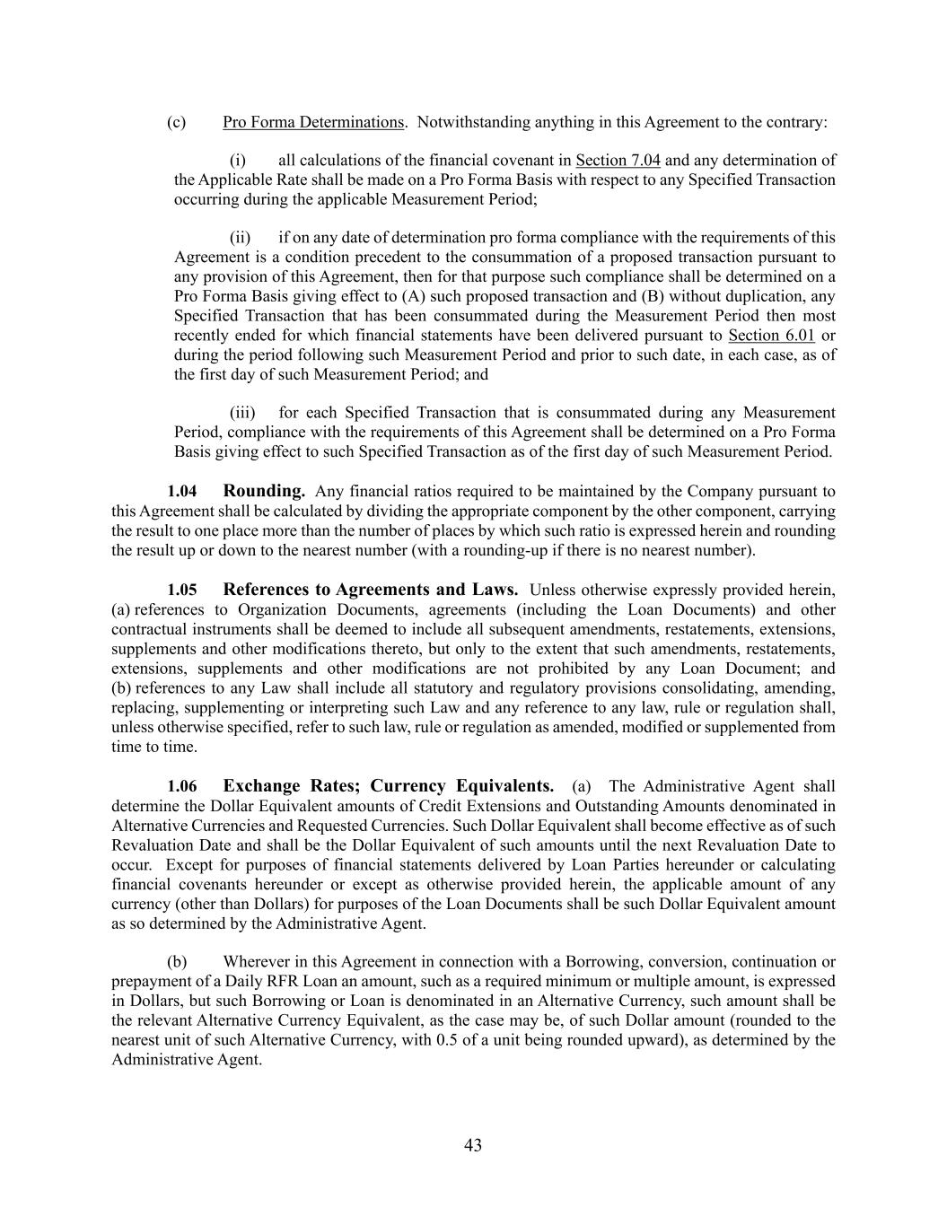 43 (c) Pro Forma Determinations. Notwithstanding anything in this Agreement to the contrary: (i) all calculations of the financial covenant in Section 7.04 and any determination of the Applicable Rate shall be made on a Pro Forma Basis with respect to any Specified Transaction occurring during the applicable Measurement Period; (ii) if on any date of determination pro forma compliance with the requirements of this Agreement is a condition precedent to the consummation of a proposed transaction pursuant to any provision of this Agreement, then for that purpose such compliance shall be determined on a Pro Forma Basis giving effect to (A) such proposed transaction and (B) without duplication, any Specified Transaction that has been consummated during the Measurement Period then most recently ended for which financial statements have been delivered pursuant to Section 6.01 or during the period following such Measurement Period and prior to such date, in each case, as of the first day of such Measurement Period; and (iii) for each Specified Transaction that is consummated during any Measurement Period, compliance with the requirements of this Agreement shall be determined on a Pro Forma Basis giving effect to such Specified Transaction as of the first day of such Measurement Period. 1.04 Rounding. Any financial ratios required to be maintained by the Company pursuant to this Agreement shall be calculated by dividing the appropriate component by the other component, carrying the result to one place more than the number of places by which such ratio is expressed herein and rounding the result up or down to the nearest number (with a rounding-up if there is no nearest number). 1.05 References to Agreements and Laws. Unless otherwise expressly provided herein, (a) references to Organization Documents, agreements (including the Loan Documents) and other contractual instruments shall be deemed to include all subsequent amendments, restatements, extensions, supplements and other modifications thereto, but only to the extent that such amendments, restatements, extensions, supplements and other modifications are not prohibited by any Loan Document; and (b) references to any Law shall include all statutory and regulatory provisions consolidating, amending, replacing, supplementing or interpreting such Law and any reference to any law, rule or regulation shall, unless otherwise specified, refer to such law, rule or regulation as amended, modified or supplemented from time to time. 1.06 Exchange Rates; Currency Equivalents. (a) The Administrative Agent shall determine the Dollar Equivalent amounts of Credit Extensions and Outstanding Amounts denominated in Alternative Currencies and Requested Currencies. Such Dollar Equivalent shall become effective as of such Revaluation Date and shall be the Dollar Equivalent of such amounts until the next Revaluation Date to occur. Except for purposes of financial statements delivered by Loan Parties hereunder or calculating financial covenants hereunder or except as otherwise provided herein, the applicable amount of any currency (other than Dollars) for purposes of the Loan Documents shall be such Dollar Equivalent amount as so determined by the Administrative Agent. (b) Wherever in this Agreement in connection with a Borrowing, conversion, continuation or prepayment of a Daily RFR Loan an amount, such as a required minimum or multiple amount, is expressed in Dollars, but such Borrowing or Loan is denominated in an Alternative Currency, such amount shall be the relevant Alternative Currency Equivalent, as the case may be, of such Dollar amount (rounded to the nearest unit of such Alternative Currency, with 0.5 of a unit being rounded upward), as determined by the Administrative Agent.