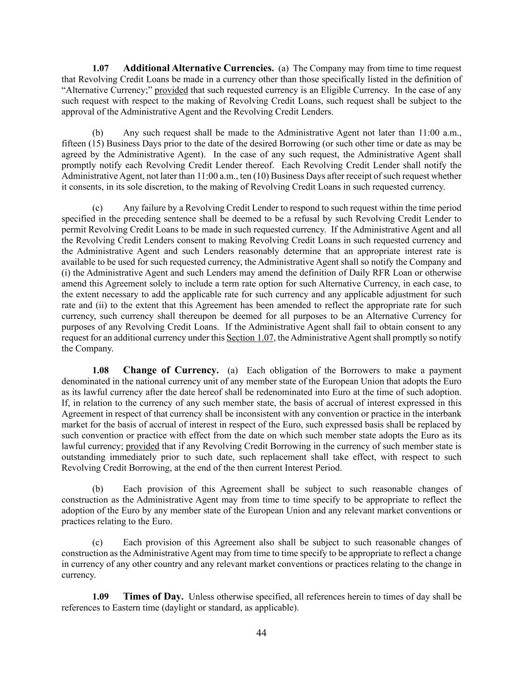 44 1.07 Additional Alternative Currencies. (a) The Company may from time to time request that Revolving Credit Loans be made in a currency other than those specifically listed in the definition of “Alternative Currency;” provided that such requested currency is an Eligible Currency. In the case of any such request with respect to the making of Revolving Credit Loans, such request shall be subject to the approval of the Administrative Agent and the Revolving Credit Lenders. (b) Any such request shall be made to the Administrative Agent not later than 11:00 a.m., fifteen (15) Business Days prior to the date of the desired Borrowing (or such other time or date as may be agreed by the Administrative Agent). In the case of any such request, the Administrative Agent shall promptly notify each Revolving Credit Lender thereof. Each Revolving Credit Lender shall notify the Administrative Agent, not later than 11:00 a.m., ten (10) Business Days after receipt of such request whether it consents, in its sole discretion, to the making of Revolving Credit Loans in such requested currency. (c) Any failure by a Revolving Credit Lender to respond to such request within the time period specified in the preceding sentence shall be deemed to be a refusal by such Revolving Credit Lender to permit Revolving Credit Loans to be made in such requested currency. If the Administrative Agent and all the Revolving Credit Lenders consent to making Revolving Credit Loans in such requested currency and the Administrative Agent and such Lenders reasonably determine that an appropriate interest rate is available to be used for such requested currency, the Administrative Agent shall so notify the Company and (i) the Administrative Agent and such Lenders may amend the definition of Daily RFR Loan or otherwise amend this Agreement solely to include a term rate option for such Alternative Currency, in each case, to the extent necessary to add the applicable rate for such currency and any applicable adjustment for such rate and (ii) to the extent that this Agreement has been amended to reflect the appropriate rate for such currency, such currency shall thereupon be deemed for all purposes to be an Alternative Currency for purposes of any Revolving Credit Loans. If the Administrative Agent shall fail to obtain consent to any request for an additional currency under this Section 1.07, the Administrative Agent shall promptly so notify the Company. 1.08 Change of Currency. (a) Each obligation of the Borrowers to make a payment denominated in the national currency unit of any member state of the European Union that adopts the Euro as its lawful currency after the date hereof shall be redenominated into Euro at the time of such adoption. If, in relation to the currency of any such member state, the basis of accrual of interest expressed in this Agreement in respect of that currency shall be inconsistent with any convention or practice in the interbank market for the basis of accrual of interest in respect of the Euro, such expressed basis shall be replaced by such convention or practice with effect from the date on which such member state adopts the Euro as its lawful currency; provided that if any Revolving Credit Borrowing in the currency of such member state is outstanding immediately prior to such date, such replacement shall take effect, with respect to such Revolving Credit Borrowing, at the end of the then current Interest Period. (b) Each provision of this Agreement shall be subject to such reasonable changes of construction as the Administrative Agent may from time to time specify to be appropriate to reflect the adoption of the Euro by any member state of the European Union and any relevant market conventions or practices relating to the Euro. (c) Each provision of this Agreement also shall be subject to such reasonable changes of construction as the Administrative Agent may from time to time specify to be appropriate to reflect a change in currency of any other country and any relevant market conventions or practices relating to the change in currency. 1.09 Times of Day. Unless otherwise specified, all references herein to times of day shall be references to Eastern time (daylight or standard, as applicable).