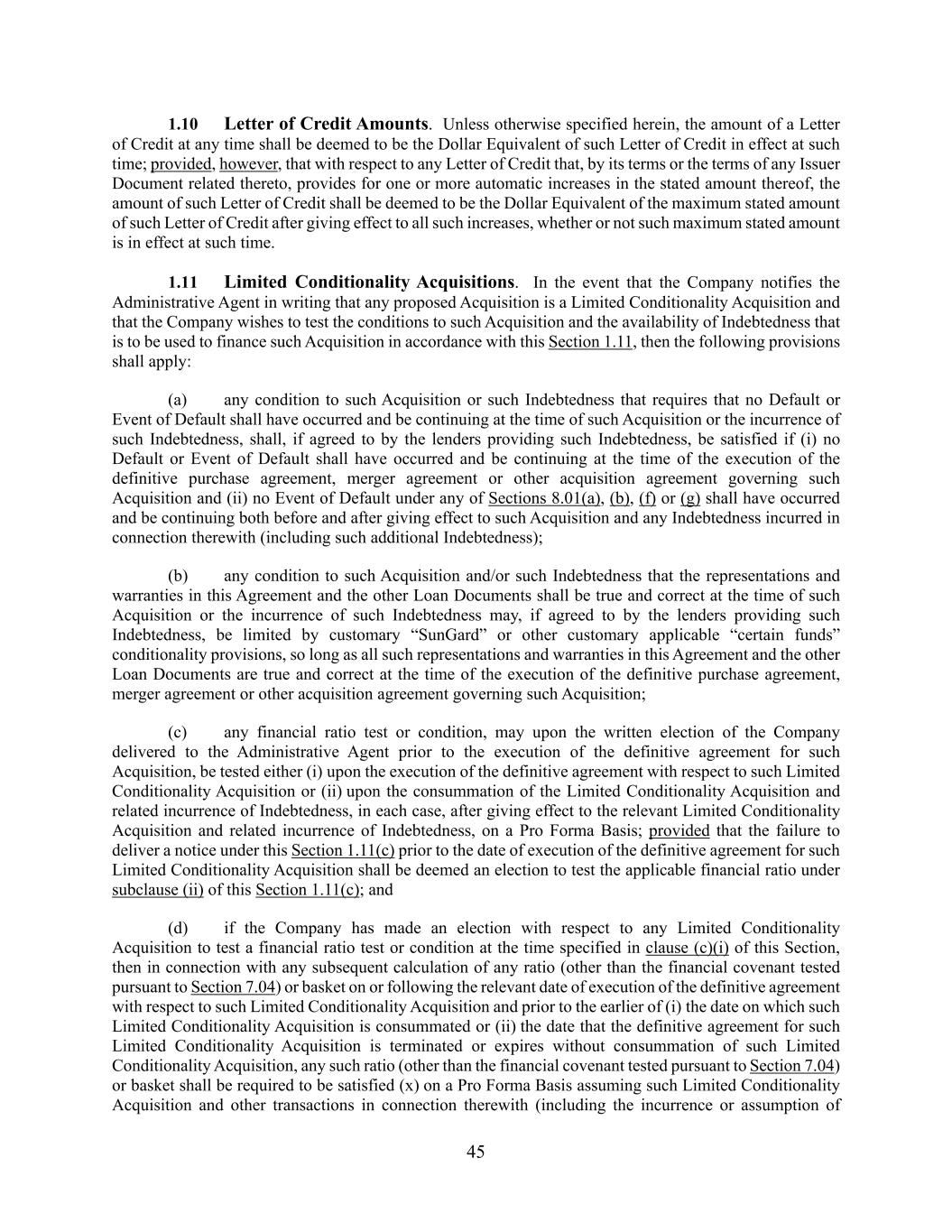 45 1.10 Letter of Credit Amounts. Unless otherwise specified herein, the amount of a Letter of Credit at any time shall be deemed to be the Dollar Equivalent of such Letter of Credit in effect at such time; provided, however, that with respect to any Letter of Credit that, by its terms or the terms of any Issuer Document related thereto, provides for one or more automatic increases in the stated amount thereof, the amount of such Letter of Credit shall be deemed to be the Dollar Equivalent of the maximum stated amount of such Letter of Credit after giving effect to all such increases, whether or not such maximum stated amount is in effect at such time. 1.11 Limited Conditionality Acquisitions. In the event that the Company notifies the Administrative Agent in writing that any proposed Acquisition is a Limited Conditionality Acquisition and that the Company wishes to test the conditions to such Acquisition and the availability of Indebtedness that is to be used to finance such Acquisition in accordance with this Section 1.11, then the following provisions shall apply: (a) any condition to such Acquisition or such Indebtedness that requires that no Default or Event of Default shall have occurred and be continuing at the time of such Acquisition or the incurrence of such Indebtedness, shall, if agreed to by the lenders providing such Indebtedness, be satisfied if (i) no Default or Event of Default shall have occurred and be continuing at the time of the execution of the definitive purchase agreement, merger agreement or other acquisition agreement governing such Acquisition and (ii) no Event of Default under any of Sections 8.01(a), (b), (f) or (g) shall have occurred and be continuing both before and after giving effect to such Acquisition and any Indebtedness incurred in connection therewith (including such additional Indebtedness); (b) any condition to such Acquisition and/or such Indebtedness that the representations and warranties in this Agreement and the other Loan Documents shall be true and correct at the time of such Acquisition or the incurrence of such Indebtedness may, if agreed to by the lenders providing such Indebtedness, be limited by customary “SunGard” or other customary applicable “certain funds” conditionality provisions, so long as all such representations and warranties in this Agreement and the other Loan Documents are true and correct at the time of the execution of the definitive purchase agreement, merger agreement or other acquisition agreement governing such Acquisition; (c) any financial ratio test or condition, may upon the written election of the Company delivered to the Administrative Agent prior to the execution of the definitive agreement for such Acquisition, be tested either (i) upon the execution of the definitive agreement with respect to such Limited Conditionality Acquisition or (ii) upon the consummation of the Limited Conditionality Acquisition and related incurrence of Indebtedness, in each case, after giving effect to the relevant Limited Conditionality Acquisition and related incurrence of Indebtedness, on a Pro Forma Basis; provided that the failure to deliver a notice under this Section 1.11(c) prior to the date of execution of the definitive agreement for such Limited Conditionality Acquisition shall be deemed an election to test the applicable financial ratio under subclause (ii) of this Section 1.11(c); and (d) if the Company has made an election with respect to any Limited Conditionality Acquisition to test a financial ratio test or condition at the time specified in clause (c)(i) of this Section, then in connection with any subsequent calculation of any ratio (other than the financial covenant tested pursuant to Section 7.04) or basket on or following the relevant date of execution of the definitive agreement with respect to such Limited Conditionality Acquisition and prior to the earlier of (i) the date on which such Limited Conditionality Acquisition is consummated or (ii) the date that the definitive agreement for such Limited Conditionality Acquisition is terminated or expires without consummation of such Limited Conditionality Acquisition, any such ratio (other than the financial covenant tested pursuant to Section 7.04) or basket shall be required to be satisfied (x) on a Pro Forma Basis assuming such Limited Conditionality Acquisition and other transactions in connection therewith (including the incurrence or assumption of