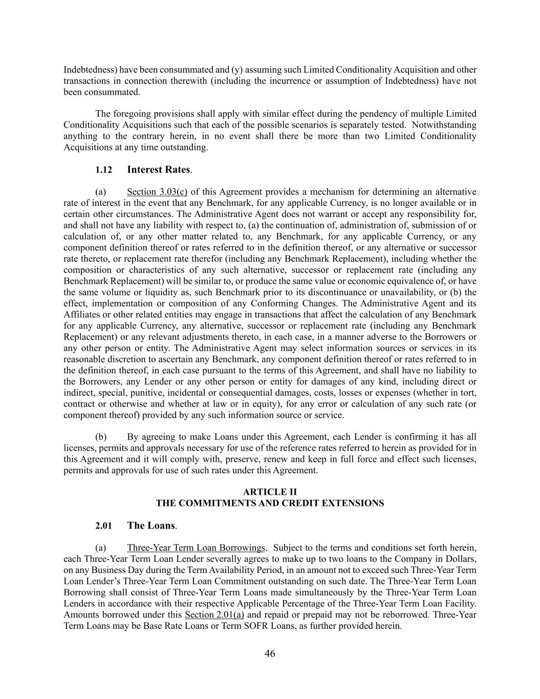 46 Indebtedness) have been consummated and (y) assuming such Limited Conditionality Acquisition and other transactions in connection therewith (including the incurrence or assumption of Indebtedness) have not been consummated. The foregoing provisions shall apply with similar effect during the pendency of multiple Limited Conditionality Acquisitions such that each of the possible scenarios is separately tested. Notwithstanding anything to the contrary herein, in no event shall there be more than two Limited Conditionality Acquisitions at any time outstanding. 1.12 Interest Rates. (a) Section 3.03(c) of this Agreement provides a mechanism for determining an alternative rate of interest in the event that any Benchmark, for any applicable Currency, is no longer available or in certain other circumstances. The Administrative Agent does not warrant or accept any responsibility for, and shall not have any liability with respect to, (a) the continuation of, administration of, submission of or calculation of, or any other matter related to, any Benchmark, for any applicable Currency, or any component definition thereof or rates referred to in the definition thereof, or any alternative or successor rate thereto, or replacement rate therefor (including any Benchmark Replacement), including whether the composition or characteristics of any such alternative, successor or replacement rate (including any Benchmark Replacement) will be similar to, or produce the same value or economic equivalence of, or have the same volume or liquidity as, such Benchmark prior to its discontinuance or unavailability, or (b) the effect, implementation or composition of any Conforming Changes. The Administrative Agent and its Affiliates or other related entities may engage in transactions that affect the calculation of any Benchmark for any applicable Currency, any alternative, successor or replacement rate (including any Benchmark Replacement) or any relevant adjustments thereto, in each case, in a manner adverse to the Borrowers or any other person or entity. The Administrative Agent may select information sources or services in its reasonable discretion to ascertain any Benchmark, any component definition thereof or rates referred to in the definition thereof, in each case pursuant to the terms of this Agreement, and shall have no liability to the Borrowers, any Lender or any other person or entity for damages of any kind, including direct or indirect, special, punitive, incidental or consequential damages, costs, losses or expenses (whether in tort, contract or otherwise and whether at law or in equity), for any error or calculation of any such rate (or component thereof) provided by any such information source or service. (b) By agreeing to make Loans under this Agreement, each Lender is confirming it has all licenses, permits and approvals necessary for use of the reference rates referred to herein as provided for in this Agreement and it will comply with, preserve, renew and keep in full force and effect such licenses, permits and approvals for use of such rates under this Agreement. ARTICLE II THE COMMITMENTS AND CREDIT EXTENSIONS 2.01 The Loans. (a) Three-Year Term Loan Borrowings. Subject to the terms and conditions set forth herein, each Three-Year Term Loan Lender severally agrees to make up to two loans to the Company in Dollars, on any Business Day during the Term Availability Period, in an amount not to exceed such Three-Year Term Loan Lender’s Three-Year Term Loan Commitment outstanding on such date. The Three-Year Term Loan Borrowing shall consist of Three-Year Term Loans made simultaneously by the Three-Year Term Loan Lenders in accordance with their respective Applicable Percentage of the Three-Year Term Loan Facility. Amounts borrowed under this Section 2.01(a) and repaid or prepaid may not be reborrowed. Three-Year Term Loans may be Base Rate Loans or Term SOFR Loans, as further provided herein.