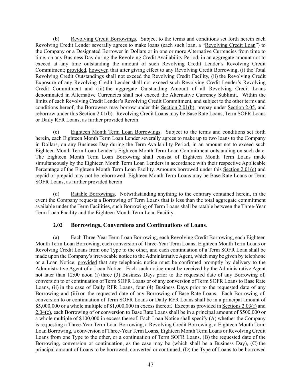 47 (b) Revolving Credit Borrowings. Subject to the terms and conditions set forth herein each Revolving Credit Lender severally agrees to make loans (each such loan, a “Revolving Credit Loan”) to the Company or a Designated Borrower in Dollars or in one or more Alternative Currencies from time to time, on any Business Day during the Revolving Credit Availability Period, in an aggregate amount not to exceed at any time outstanding the amount of such Revolving Credit Lender’s Revolving Credit Commitment; provided, however, that after giving effect to any Revolving Credit Borrowing, (i) the Total Revolving Credit Outstandings shall not exceed the Revolving Credit Facility, (ii) the Revolving Credit Exposure of any Revolving Credit Lender shall not exceed such Revolving Credit Lender’s Revolving Credit Commitment and (iii) the aggregate Outstanding Amount of all Revolving Credit Loans denominated in Alternative Currencies shall not exceed the Alternative Currency Sublimit. Within the limits of each Revolving Credit Lender’s Revolving Credit Commitment, and subject to the other terms and conditions hereof, the Borrowers may borrow under this Section 2.01(b), prepay under Section 2.05, and reborrow under this Section 2.01(b). Revolving Credit Loans may be Base Rate Loans, Term SOFR Loans or Daily RFR Loans, as further provided herein. (c) Eighteen Month Term Loan Borrowings. Subject to the terms and conditions set forth herein, each Eighteen Month Term Loan Lender severally agrees to make up to two loans to the Company in Dollars, on any Business Day during the Term Availability Period, in an amount not to exceed such Eighteen Month Term Loan Lender’s Eighteen Month Term Loan Commitment outstanding on such date. The Eighteen Month Term Loan Borrowing shall consist of Eighteen Month Term Loans made simultaneously by the Eighteen Month Term Loan Lenders in accordance with their respective Applicable Percentage of the Eighteen Month Term Loan Facility. Amounts borrowed under this Section 2.01(c) and repaid or prepaid may not be reborrowed. Eighteen Month Term Loans may be Base Rate Loans or Term SOFR Loans, as further provided herein. (d) Ratable Borrowings. Notwithstanding anything to the contrary contained herein, in the event the Company requests a Borrowing of Term Loans that is less than the total aggregate commitment available under the Term Facilities, such Borrowing of Term Loans shall be ratable between the Three-Year Term Loan Facility and the Eighteen Month Term Loan Facility. 2.02 Borrowings, Conversions and Continuations of Loans. (a) Each Three-Year Term Loan Borrowing, each Revolving Credit Borrowing, each Eighteen Month Term Loan Borrowing, each conversion of Three-Year Term Loans, Eighteen Month Term Loans or Revolving Credit Loans from one Type to the other, and each continuation of a Term SOFR Loan shall be made upon the Company’s irrevocable notice to the Administrative Agent, which may be given by telephone or a Loan Notice; provided that any telephonic notice must be confirmed promptly by delivery to the Administrative Agent of a Loan Notice. Each such notice must be received by the Administrative Agent not later than 12:00 noon (i) three (3) Business Days prior to the requested date of any Borrowing of, conversion to or continuation of Term SOFR Loans or of any conversion of Term SOFR Loans to Base Rate Loans, (ii) in the case of Daily RFR Loans, four (4) Business Days prior to the requested date of any Borrowing and (iii) on the requested date of any Borrowing of Base Rate Loans. Each Borrowing of, conversion to or continuation of Term SOFR Loans or Daily RFR Loans shall be in a principal amount of $5,000,000 or a whole multiple of $1,000,000 in excess thereof. Except as provided in Sections 2.03(f) and 2.04(c), each Borrowing of or conversion to Base Rate Loans shall be in a principal amount of $500,000 or a whole multiple of $100,000 in excess thereof. Each Loan Notice shall specify (A) whether the Company is requesting a Three-Year Term Loan Borrowing, a Revolving Credit Borrowing, a Eighteen Month Term Loan Borrowing, a conversion of Three-Year Term Loans, Eighteen Month Term Loans or Revolving Credit Loans from one Type to the other, or a continuation of Term SOFR Loans, (B) the requested date of the Borrowing, conversion or continuation, as the case may be (which shall be a Business Day), (C) the principal amount of Loans to be borrowed, converted or continued, (D) the Type of Loans to be borrowed