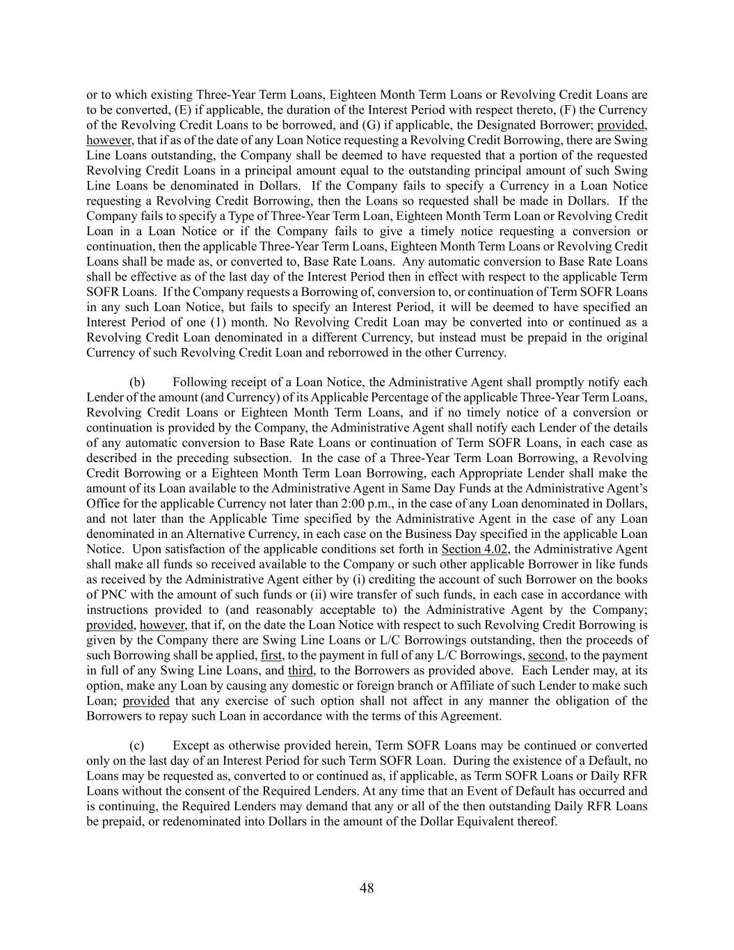 48 or to which existing Three-Year Term Loans, Eighteen Month Term Loans or Revolving Credit Loans are to be converted, (E) if applicable, the duration of the Interest Period with respect thereto, (F) the Currency of the Revolving Credit Loans to be borrowed, and (G) if applicable, the Designated Borrower; provided, however, that if as of the date of any Loan Notice requesting a Revolving Credit Borrowing, there are Swing Line Loans outstanding, the Company shall be deemed to have requested that a portion of the requested Revolving Credit Loans in a principal amount equal to the outstanding principal amount of such Swing Line Loans be denominated in Dollars. If the Company fails to specify a Currency in a Loan Notice requesting a Revolving Credit Borrowing, then the Loans so requested shall be made in Dollars. If the Company fails to specify a Type of Three-Year Term Loan, Eighteen Month Term Loan or Revolving Credit Loan in a Loan Notice or if the Company fails to give a timely notice requesting a conversion or continuation, then the applicable Three-Year Term Loans, Eighteen Month Term Loans or Revolving Credit Loans shall be made as, or converted to, Base Rate Loans. Any automatic conversion to Base Rate Loans shall be effective as of the last day of the Interest Period then in effect with respect to the applicable Term SOFR Loans. If the Company requests a Borrowing of, conversion to, or continuation of Term SOFR Loans in any such Loan Notice, but fails to specify an Interest Period, it will be deemed to have specified an Interest Period of one (1) month. No Revolving Credit Loan may be converted into or continued as a Revolving Credit Loan denominated in a different Currency, but instead must be prepaid in the original Currency of such Revolving Credit Loan and reborrowed in the other Currency. (b) Following receipt of a Loan Notice, the Administrative Agent shall promptly notify each Lender of the amount (and Currency) of its Applicable Percentage of the applicable Three-Year Term Loans, Revolving Credit Loans or Eighteen Month Term Loans, and if no timely notice of a conversion or continuation is provided by the Company, the Administrative Agent shall notify each Lender of the details of any automatic conversion to Base Rate Loans or continuation of Term SOFR Loans, in each case as described in the preceding subsection. In the case of a Three-Year Term Loan Borrowing, a Revolving Credit Borrowing or a Eighteen Month Term Loan Borrowing, each Appropriate Lender shall make the amount of its Loan available to the Administrative Agent in Same Day Funds at the Administrative Agent’s Office for the applicable Currency not later than 2:00 p.m., in the case of any Loan denominated in Dollars, and not later than the Applicable Time specified by the Administrative Agent in the case of any Loan denominated in an Alternative Currency, in each case on the Business Day specified in the applicable Loan Notice. Upon satisfaction of the applicable conditions set forth in Section 4.02, the Administrative Agent shall make all funds so received available to the Company or such other applicable Borrower in like funds as received by the Administrative Agent either by (i) crediting the account of such Borrower on the books of PNC with the amount of such funds or (ii) wire transfer of such funds, in each case in accordance with instructions provided to (and reasonably acceptable to) the Administrative Agent by the Company; provided, however, that if, on the date the Loan Notice with respect to such Revolving Credit Borrowing is given by the Company there are Swing Line Loans or L/C Borrowings outstanding, then the proceeds of such Borrowing shall be applied, first, to the payment in full of any L/C Borrowings, second, to the payment in full of any Swing Line Loans, and third, to the Borrowers as provided above. Each Lender may, at its option, make any Loan by causing any domestic or foreign branch or Affiliate of such Lender to make such Loan; provided that any exercise of such option shall not affect in any manner the obligation of the Borrowers to repay such Loan in accordance with the terms of this Agreement. (c) Except as otherwise provided herein, Term SOFR Loans may be continued or converted only on the last day of an Interest Period for such Term SOFR Loan. During the existence of a Default, no Loans may be requested as, converted to or continued as, if applicable, as Term SOFR Loans or Daily RFR Loans without the consent of the Required Lenders. At any time that an Event of Default has occurred and is continuing, the Required Lenders may demand that any or all of the then outstanding Daily RFR Loans be prepaid, or redenominated into Dollars in the amount of the Dollar Equivalent thereof.