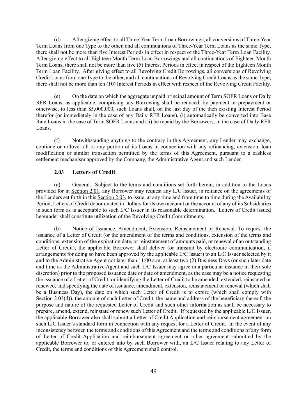 49 (d) After giving effect to all Three-Year Term Loan Borrowings, all conversions of Three-Year Term Loans from one Type to the other, and all continuations of Three-Year Term Loans as the same Type, there shall not be more than five Interest Periods in effect in respect of the Three-Year Term Loan Facility. After giving effect to all Eighteen Month Term Loan Borrowings and all continuations of Eighteen Month Term Loans, there shall not be more than five (5) Interest Periods in effect in respect of the Eighteen Month Term Loan Facility. After giving effect to all Revolving Credit Borrowings, all conversions of Revolving Credit Loans from one Type to the other, and all continuations of Revolving Credit Loans as the same Type, there shall not be more than ten (10) Interest Periods in effect with respect of the Revolving Credit Facility. (e) On the date on which the aggregate unpaid principal amount of Term SOFR Loans or Daily RFR Loans, as applicable, comprising any Borrowing shall be reduced, by payment or prepayment or otherwise, to less than $5,000,000, such Loans shall, on the last day of the then existing Interest Period therefor (or immediately in the case of any Daily RFR Loans), (i) automatically be converted into Base Rate Loans in the case of Term SOFR Loans and (ii) be repaid by the Borrowers, in the case of Daily RFR Loans. (f) Notwithstanding anything to the contrary in this Agreement, any Lender may exchange, continue or rollover all or any portion of its Loans in connection with any refinancing, extension, loan modification or similar transaction permitted by the terms of this Agreement, pursuant to a cashless settlement mechanism approved by the Company, the Administrative Agent and such Lender. 2.03 Letters of Credit. (a) General. Subject to the terms and conditions set forth herein, in addition to the Loans provided for in Section 2.01, any Borrower may request any L/C Issuer, in reliance on the agreements of the Lenders set forth in this Section 2.03, to issue, at any time and from time to time during the Availability Period, Letters of Credit denominated in Dollars for its own account or the account of any of its Subsidiaries in such form as is acceptable to such L/C Issuer in its reasonable determination. Letters of Credit issued hereunder shall constitute utilization of the Revolving Credit Commitments. (b) Notice of Issuance, Amendment, Extension, Reinstatement or Renewal. To request the issuance of a Letter of Credit (or the amendment of the terms and conditions, extension of the terms and conditions, extension of the expiration date, or reinstatement of amounts paid, or renewal of an outstanding Letter of Credit), the applicable Borrower shall deliver (or transmit by electronic communication, if arrangements for doing so have been approved by the applicable L/C Issuer) to an L/C Issuer selected by it and to the Administrative Agent not later than 11:00 a.m. at least two (2) Business Days (or such later date and time as the Administrative Agent and such L/C Issuer may agree in a particular instance in their sole discretion) prior to the proposed issuance date or date of amendment, as the case may be a notice requesting the issuance of a Letter of Credit, or identifying the Letter of Credit to be amended, extended, reinstated or renewed, and specifying the date of issuance, amendment, extension, reinstatement or renewal (which shall be a Business Day), the date on which such Letter of Credit is to expire (which shall comply with Section 2.03(d)), the amount of such Letter of Credit, the name and address of the beneficiary thereof, the purpose and nature of the requested Letter of Credit and such other information as shall be necessary to prepare, amend, extend, reinstate or renew such Letter of Credit. If requested by the applicable L/C Issuer, the applicable Borrower also shall submit a Letter of Credit Application and reimbursement agreement on such L/C Issuer’s standard form in connection with any request for a Letter of Credit. In the event of any inconsistency between the terms and conditions of this Agreement and the terms and conditions of any form of Letter of Credit Application and reimbursement agreement or other agreement submitted by the applicable Borrower to, or entered into by such Borrower with, an L/C Issuer relating to any Letter of Credit, the terms and conditions of this Agreement shall control.