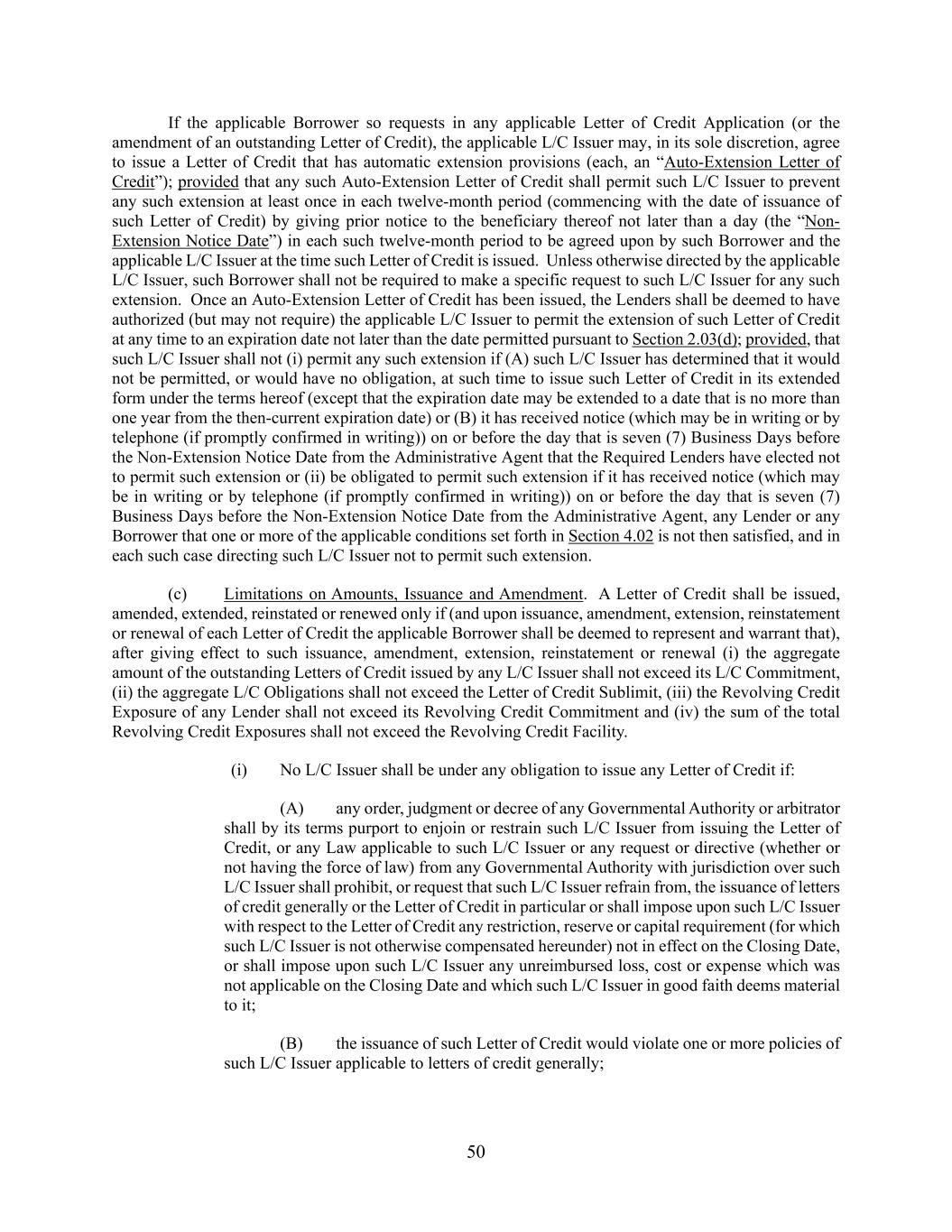 50 If the applicable Borrower so requests in any applicable Letter of Credit Application (or the amendment of an outstanding Letter of Credit), the applicable L/C Issuer may, in its sole discretion, agree to issue a Letter of Credit that has automatic extension provisions (each, an “Auto-Extension Letter of Credit”); provided that any such Auto-Extension Letter of Credit shall permit such L/C Issuer to prevent any such extension at least once in each twelve-month period (commencing with the date of issuance of such Letter of Credit) by giving prior notice to the beneficiary thereof not later than a day (the “Non- Extension Notice Date”) in each such twelve-month period to be agreed upon by such Borrower and the applicable L/C Issuer at the time such Letter of Credit is issued. Unless otherwise directed by the applicable L/C Issuer, such Borrower shall not be required to make a specific request to such L/C Issuer for any such extension. Once an Auto-Extension Letter of Credit has been issued, the Lenders shall be deemed to have authorized (but may not require) the applicable L/C Issuer to permit the extension of such Letter of Credit at any time to an expiration date not later than the date permitted pursuant to Section 2.03(d); provided, that such L/C Issuer shall not (i) permit any such extension if (A) such L/C Issuer has determined that it would not be permitted, or would have no obligation, at such time to issue such Letter of Credit in its extended form under the terms hereof (except that the expiration date may be extended to a date that is no more than one year from the then-current expiration date) or (B) it has received notice (which may be in writing or by telephone (if promptly confirmed in writing)) on or before the day that is seven (7) Business Days before the Non-Extension Notice Date from the Administrative Agent that the Required Lenders have elected not to permit such extension or (ii) be obligated to permit such extension if it has received notice (which may be in writing or by telephone (if promptly confirmed in writing)) on or before the day that is seven (7) Business Days before the Non-Extension Notice Date from the Administrative Agent, any Lender or any Borrower that one or more of the applicable conditions set forth in Section 4.02 is not then satisfied, and in each such case directing such L/C Issuer not to permit such extension. (c) Limitations on Amounts, Issuance and Amendment. A Letter of Credit shall be issued, amended, extended, reinstated or renewed only if (and upon issuance, amendment, extension, reinstatement or renewal of each Letter of Credit the applicable Borrower shall be deemed to represent and warrant that), after giving effect to such issuance, amendment, extension, reinstatement or renewal (i) the aggregate amount of the outstanding Letters of Credit issued by any L/C Issuer shall not exceed its L/C Commitment, (ii) the aggregate L/C Obligations shall not exceed the Letter of Credit Sublimit, (iii) the Revolving Credit Exposure of any Lender shall not exceed its Revolving Credit Commitment and (iv) the sum of the total Revolving Credit Exposures shall not exceed the Revolving Credit Facility. (i) No L/C Issuer shall be under any obligation to issue any Letter of Credit if: (A) any order, judgment or decree of any Governmental Authority or arbitrator shall by its terms purport to enjoin or restrain such L/C Issuer from issuing the Letter of Credit, or any Law applicable to such L/C Issuer or any request or directive (whether or not having the force of law) from any Governmental Authority with jurisdiction over such L/C Issuer shall prohibit, or request that such L/C Issuer refrain from, the issuance of letters of credit generally or the Letter of Credit in particular or shall impose upon such L/C Issuer with respect to the Letter of Credit any restriction, reserve or capital requirement (for which such L/C Issuer is not otherwise compensated hereunder) not in effect on the Closing Date, or shall impose upon such L/C Issuer any unreimbursed loss, cost or expense which was not applicable on the Closing Date and which such L/C Issuer in good faith deems material to it; (B) the issuance of such Letter of Credit would violate one or more policies of such L/C Issuer applicable to letters of credit generally;