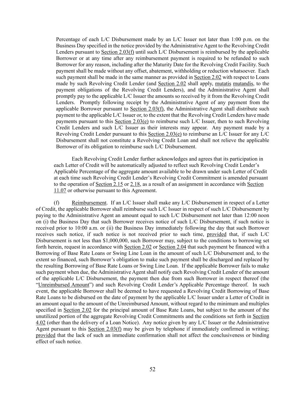 52 Percentage of each L/C Disbursement made by an L/C Issuer not later than 1:00 p.m. on the Business Day specified in the notice provided by the Administrative Agent to the Revolving Credit Lenders pursuant to Section 2.03(f) until such L/C Disbursement is reimbursed by the applicable Borrower or at any time after any reimbursement payment is required to be refunded to such Borrower for any reason, including after the Maturity Date for the Revolving Credit Facility. Such payment shall be made without any offset, abatement, withholding or reduction whatsoever. Each such payment shall be made in the same manner as provided in Section 2.02 with respect to Loans made by such Revolving Credit Lender (and Section 2.02 shall apply, mutatis mutandis, to the payment obligations of the Revolving Credit Lenders), and the Administrative Agent shall promptly pay to the applicable L/C Issuer the amounts so received by it from the Revolving Credit Lenders. Promptly following receipt by the Administrative Agent of any payment from the applicable Borrower pursuant to Section 2.03(f), the Administrative Agent shall distribute such payment to the applicable L/C Issuer or, to the extent that the Revolving Credit Lenders have made payments pursuant to this Section 2.03(e) to reimburse such L/C Issuer, then to such Revolving Credit Lenders and such L/C Issuer as their interests may appear. Any payment made by a Revolving Credit Lender pursuant to this Section 2.03(e) to reimburse an L/C Issuer for any L/C Disbursement shall not constitute a Revolving Credit Loan and shall not relieve the applicable Borrower of its obligation to reimburse such L/C Disbursement. Each Revolving Credit Lender further acknowledges and agrees that its participation in each Letter of Credit will be automatically adjusted to reflect such Revolving Credit Lender’s Applicable Percentage of the aggregate amount available to be drawn under such Letter of Credit at each time such Revolving Credit Lender’s Revolving Credit Commitment is amended pursuant to the operation of Section 2.15 or 2.18, as a result of an assignment in accordance with Section 11.07 or otherwise pursuant to this Agreement. (f) Reimbursement. If an L/C Issuer shall make any L/C Disbursement in respect of a Letter of Credit, the applicable Borrower shall reimburse such L/C Issuer in respect of such L/C Disbursement by paying to the Administrative Agent an amount equal to such L/C Disbursement not later than 12:00 noon on (i) the Business Day that such Borrower receives notice of such L/C Disbursement, if such notice is received prior to 10:00 a.m. or (ii) the Business Day immediately following the day that such Borrower receives such notice, if such notice is not received prior to such time, provided that, if such L/C Disbursement is not less than $1,000,000, such Borrower may, subject to the conditions to borrowing set forth herein, request in accordance with Section 2.02 or Section 2.04 that such payment be financed with a Borrowing of Base Rate Loans or Swing Line Loan in the amount of such L/C Disbursement and, to the extent so financed, such Borrower’s obligation to make such payment shall be discharged and replaced by the resulting Borrowing of Base Rate Loans or Swing Line Loan. If the applicable Borrower fails to make such payment when due, the Administrative Agent shall notify each Revolving Credit Lender of the amount of the applicable L/C Disbursement, the payment then due from such Borrower in respect thereof (the “Unreimbursed Amount”) and such Revolving Credit Lender’s Applicable Percentage thereof. In such event, the applicable Borrower shall be deemed to have requested a Revolving Credit Borrowing of Base Rate Loans to be disbursed on the date of payment by the applicable L/C Issuer under a Letter of Credit in an amount equal to the amount of the Unreimbursed Amount, without regard to the minimum and multiples specified in Section 2.02 for the principal amount of Base Rate Loans, but subject to the amount of the unutilized portion of the aggregate Revolving Credit Commitments and the conditions set forth in Section 4.02 (other than the delivery of a Loan Notice). Any notice given by any L/C Issuer or the Administrative Agent pursuant to this Section 2.03(f) may be given by telephone if immediately confirmed in writing; provided that the lack of such an immediate confirmation shall not affect the conclusiveness or binding effect of such notice.